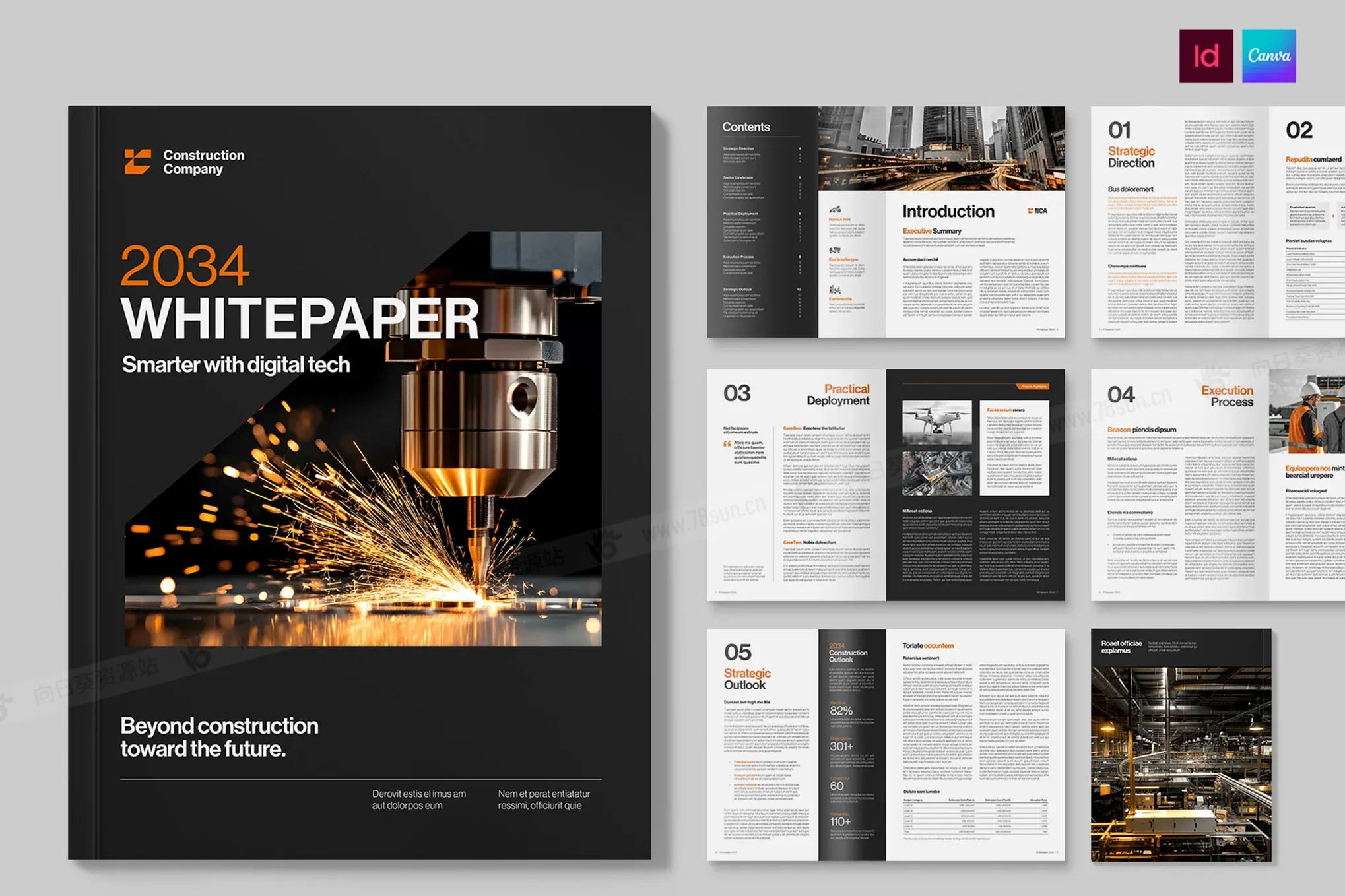建筑重工业小册子杂志宣传册画册indd设计模板,非常适合需要展示报告、情况说明书或执行摘要文档的公司。此模板提供 Canva、InDesign IDML 和 INDD 格式,