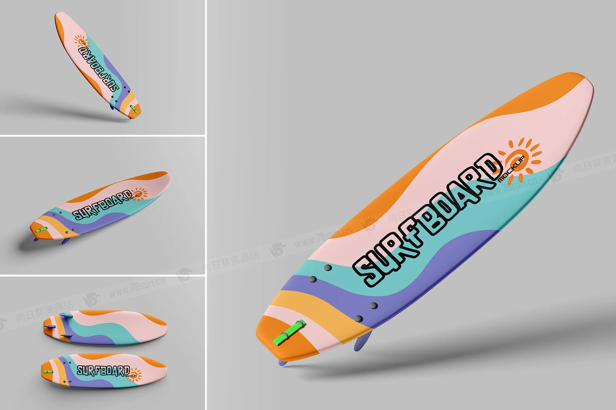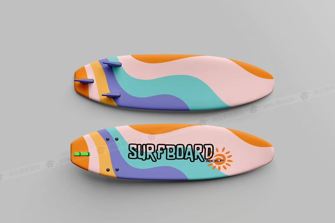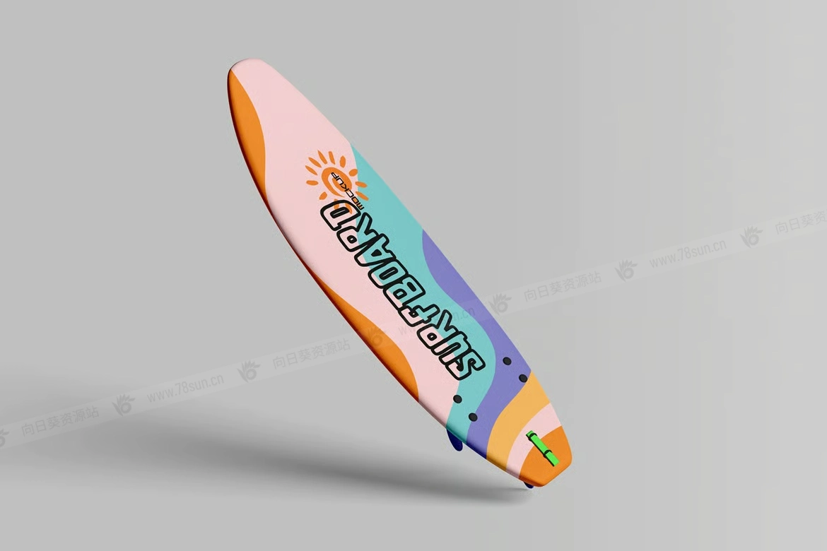 冲浪板品牌VI效果图展示智能贴图psd设计样机。此 PSD 文件使用智能对象功能,因此您可以轻松快速地更改模型内容。非常简单!您只需双击 Smart-Object,粘贴您的作品,保存它,然后就完成了。