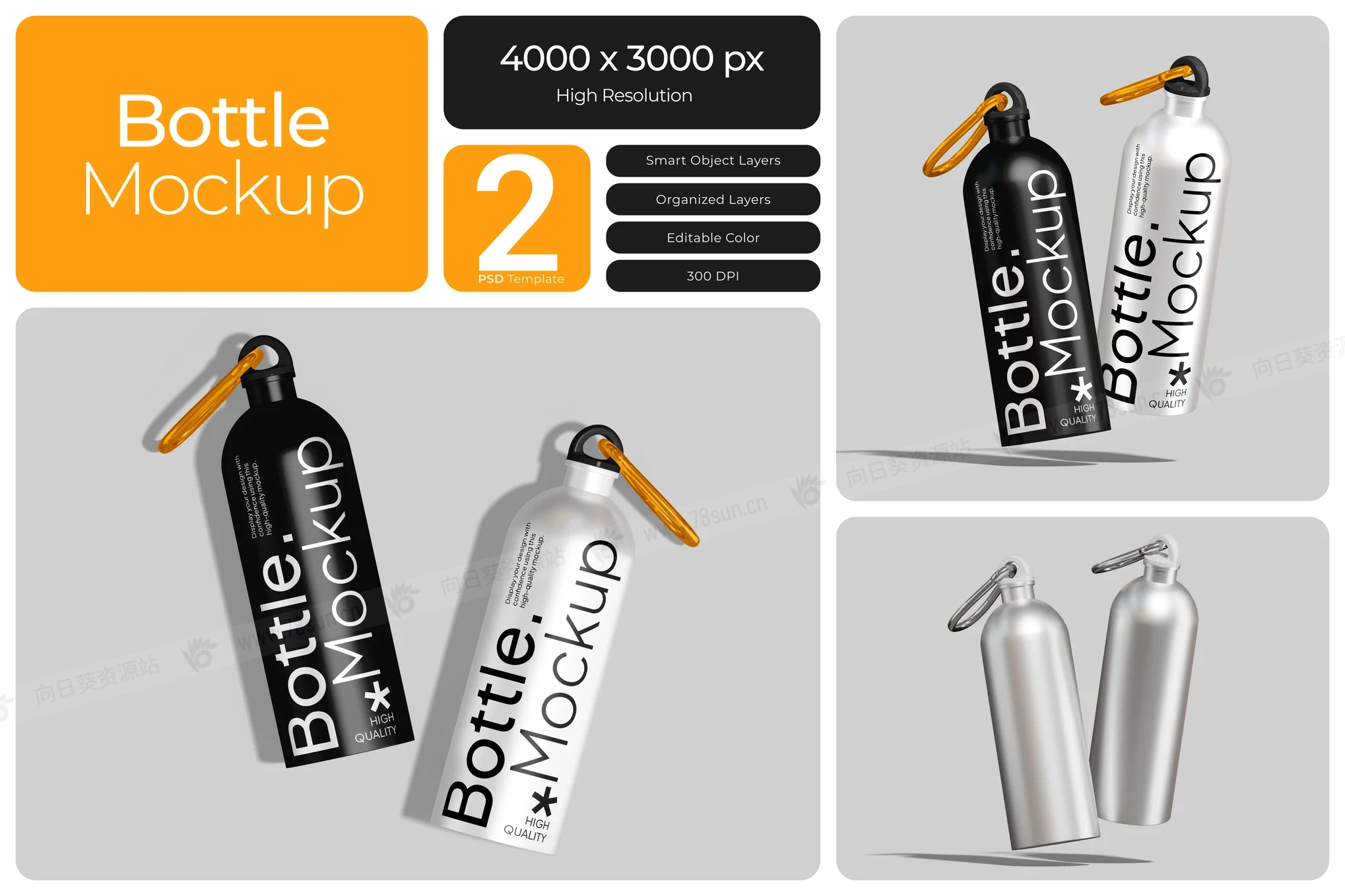 不锈钢运动水瓶品牌VI效果图展示智能贴图psd设计样机。此模型非常适合用于饮料、化妆品或保健品,