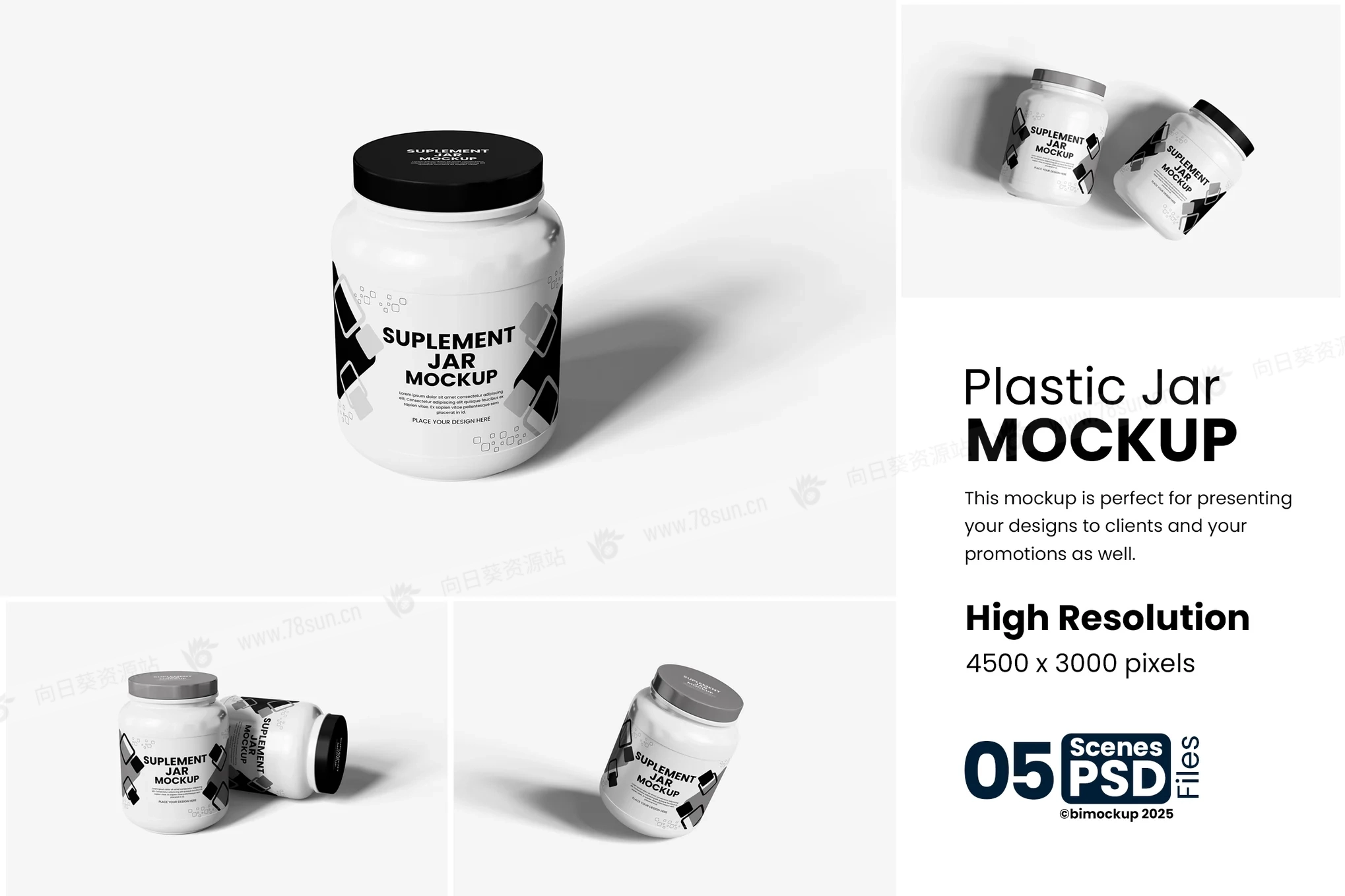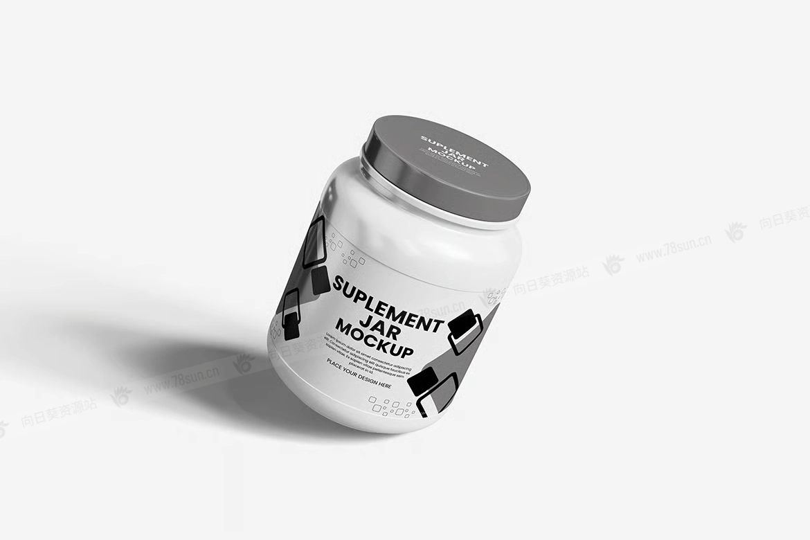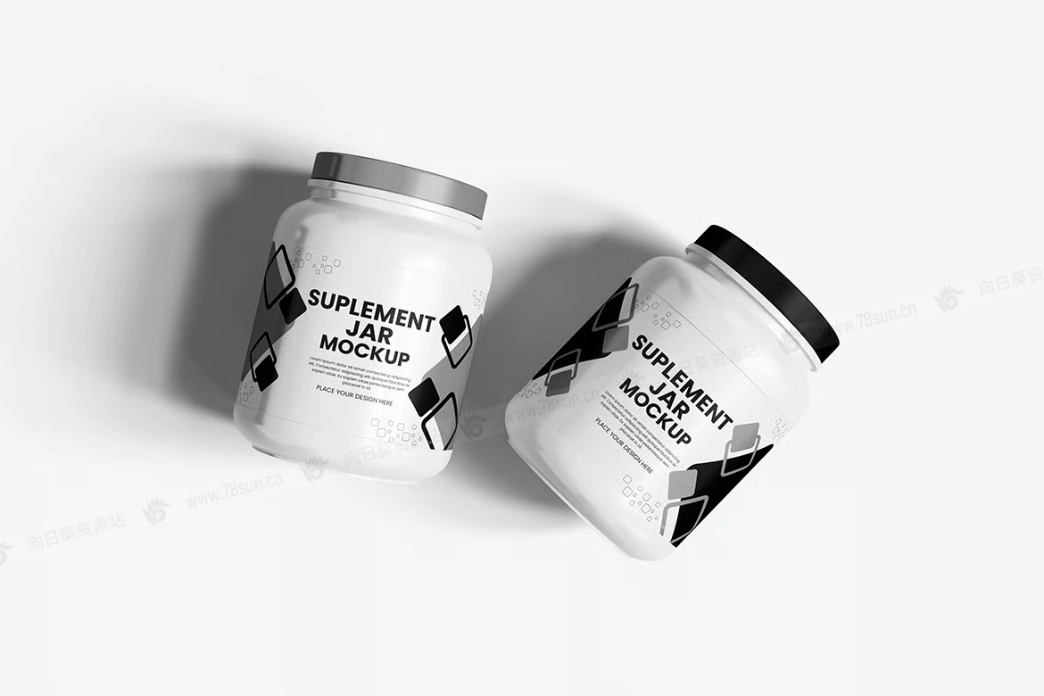 药瓶保健品罐品牌VI效果图展示智能贴图psd设计样机,使用智能对象功能轻松快速地替换设计。提供 PSD Photoshop 格式,具有智能对象功能,可帮助您在几秒钟内将当前设计替换为自己的设计。