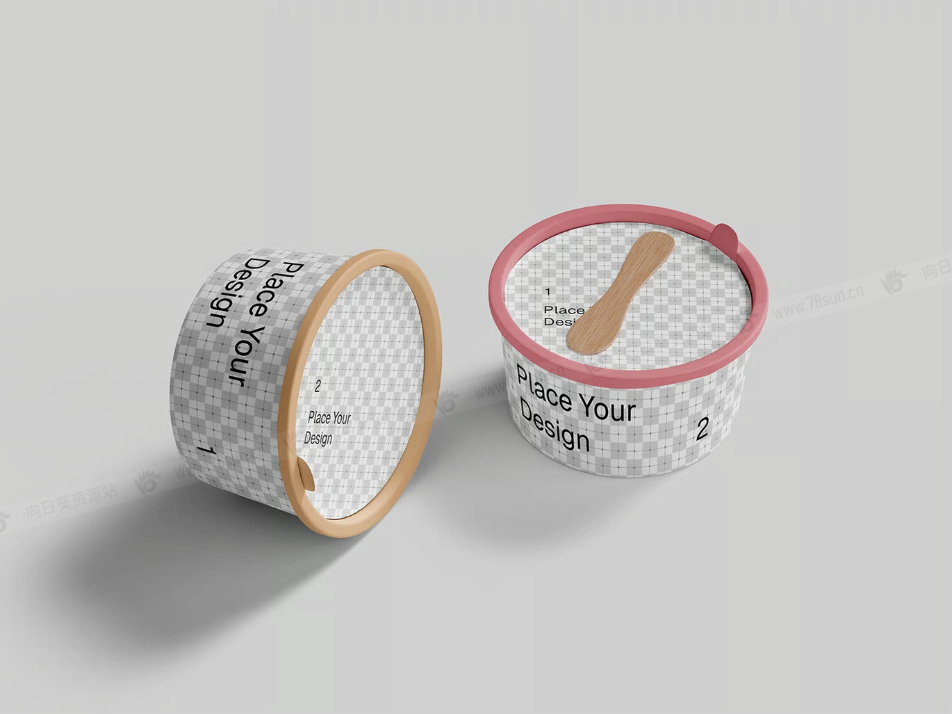 冰淇淋纸杯品牌VI效果图展示智能贴图psd设计样机。该场景包括一个带木勺的杯子和两个堆叠的桶,