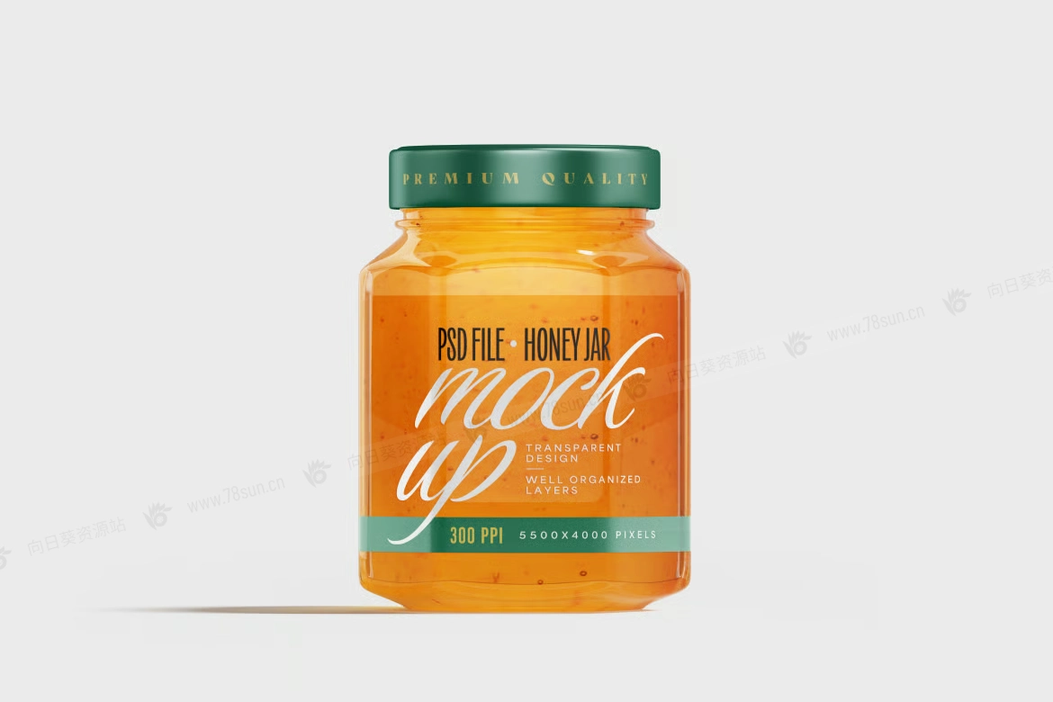 食品蜂蜜玻璃罐品牌VI效果图展示智能贴图psd设计样机。这款高分辨率 PSD 模型旨在突出手工和天然产品标签,只需点击几下即可让您的包装设计栩栩如生。