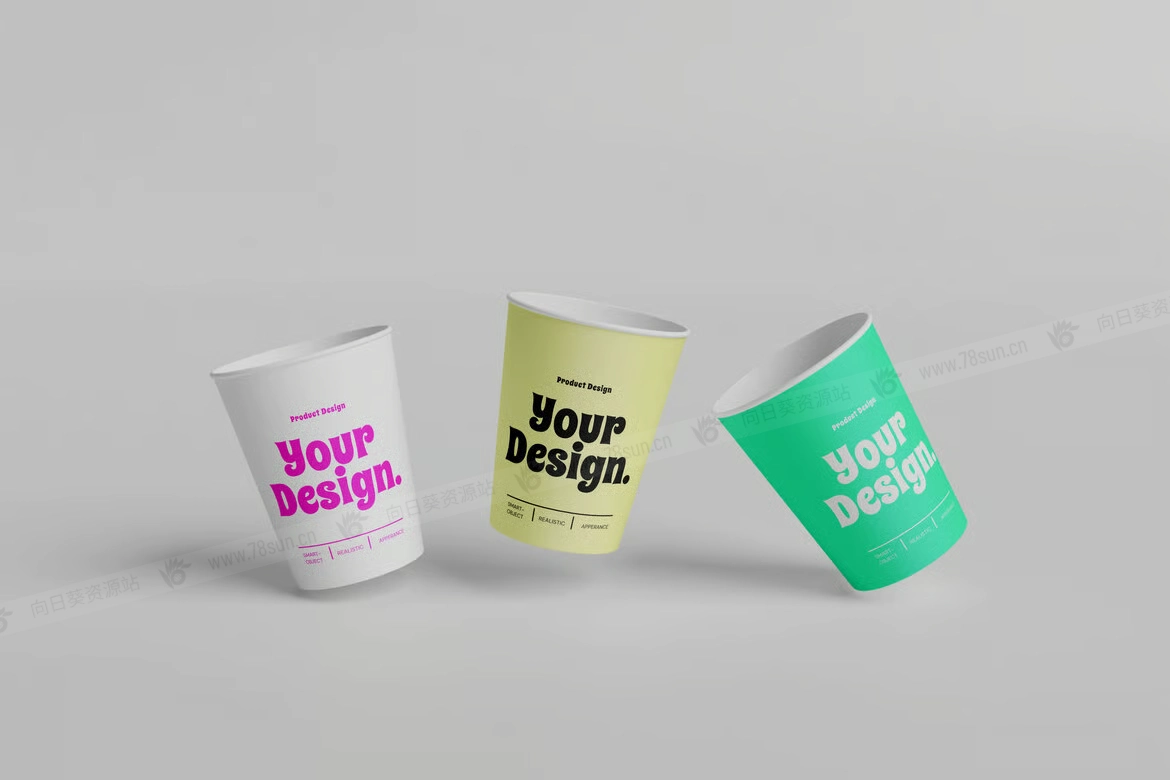 纸杯一次性杯子品牌VI效果图展示智能贴图psd设计样机。只需使用智能对象拖放您的设计即可轻松定制。