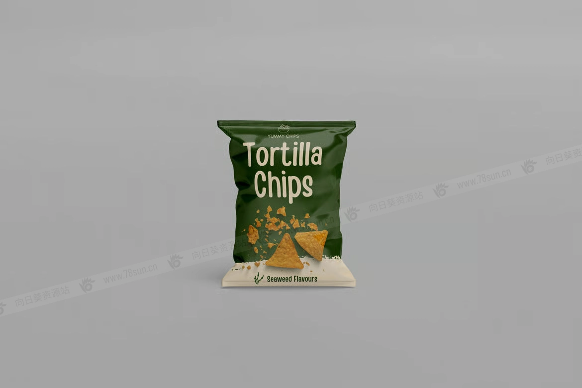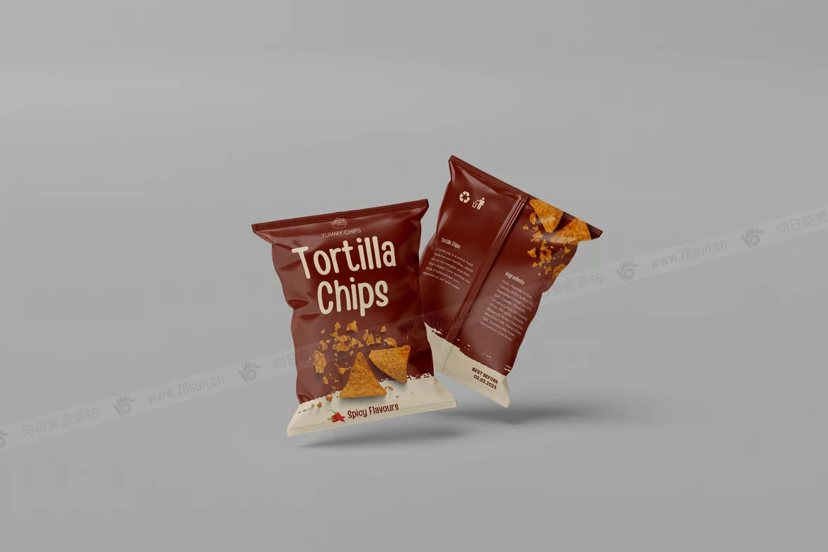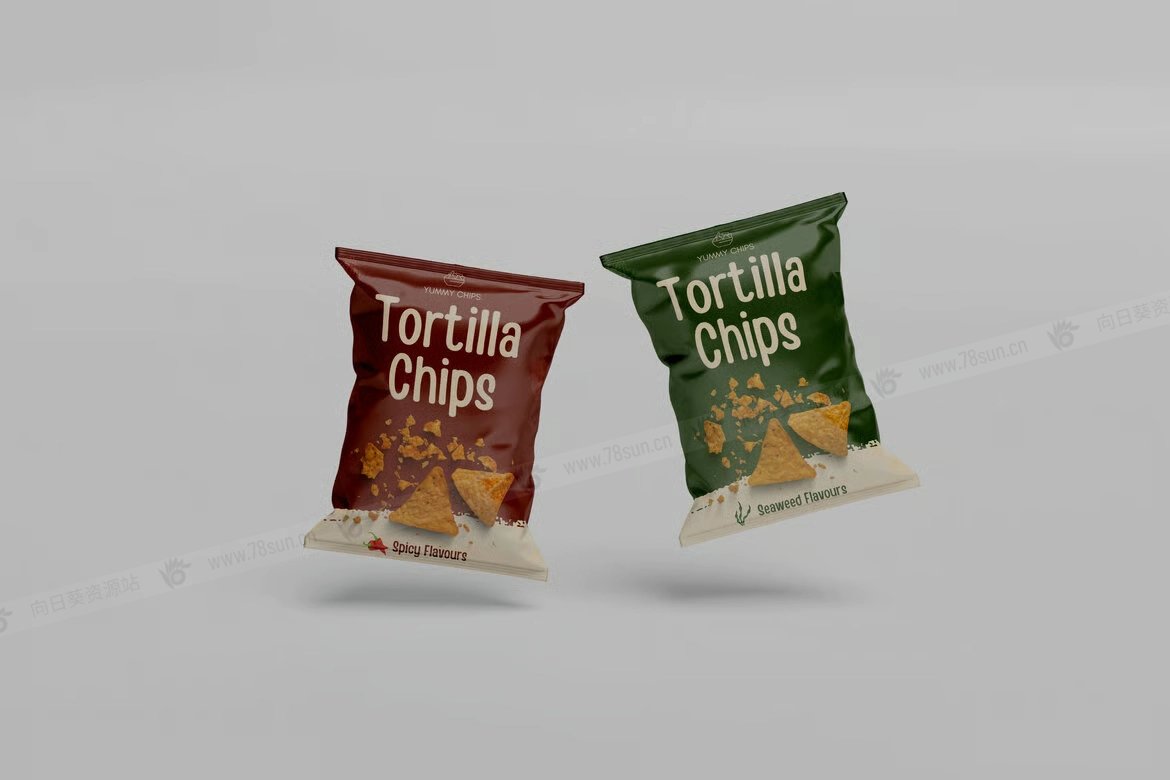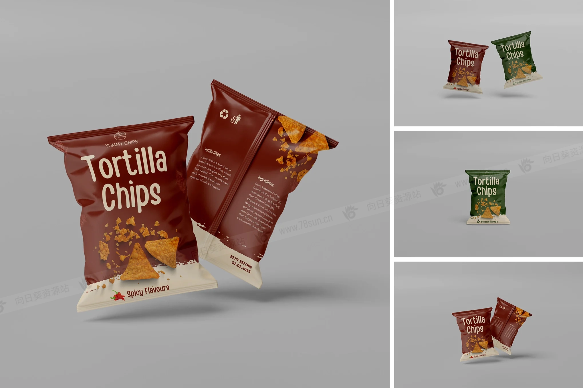 零食薯片膨化食品包装袋品牌VI效果图展示智能贴图psd设计样机。只需使用智能对象拖放您的设计即可轻松定制。