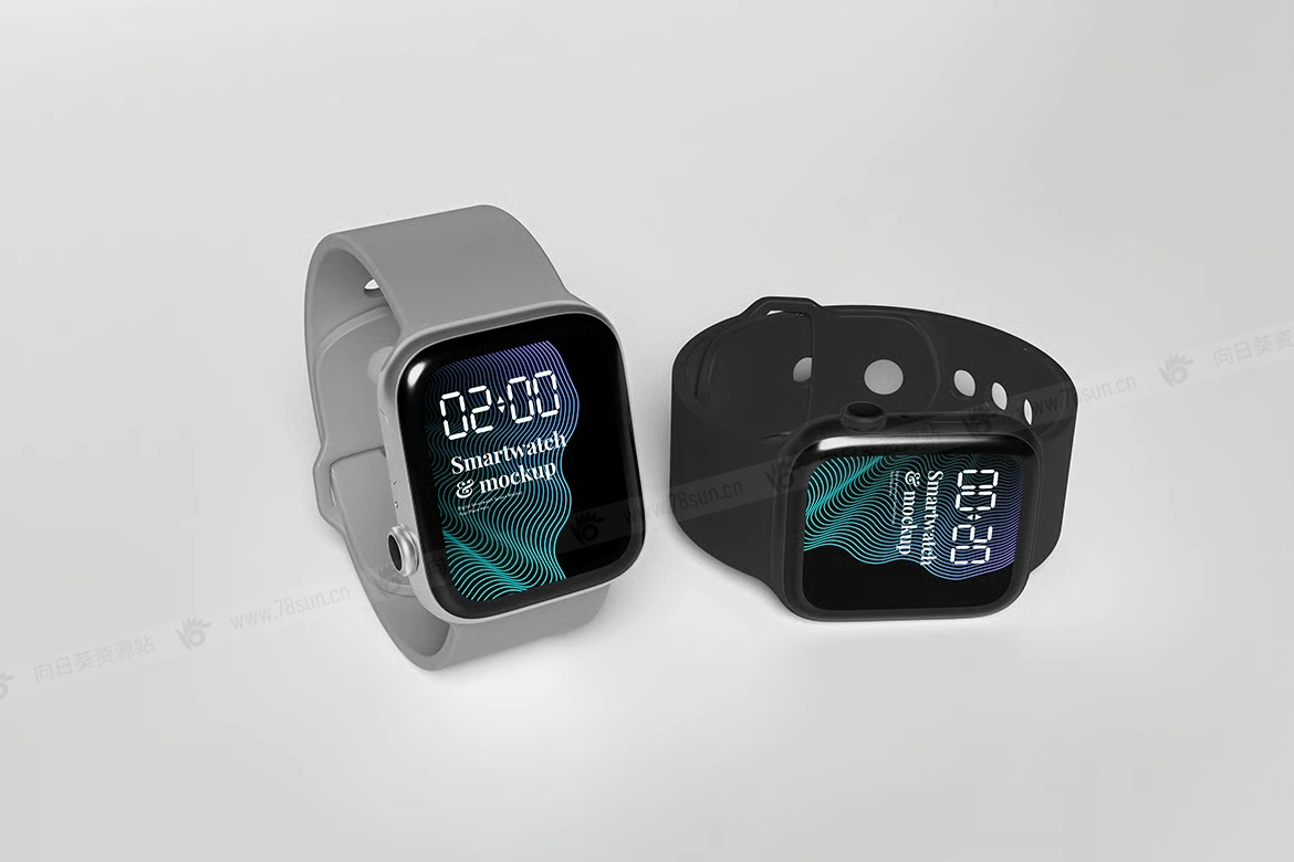 Watch数字智能手表UI设计效果图展示智能贴图psd设计样机,包括 4 个数字智能手表屏幕模型,以专业地展示您的设计。提供 PSD Photoshop 格式,具有智能对象功能,可帮助您在几秒钟内将当前设计替换为自己的设计。
