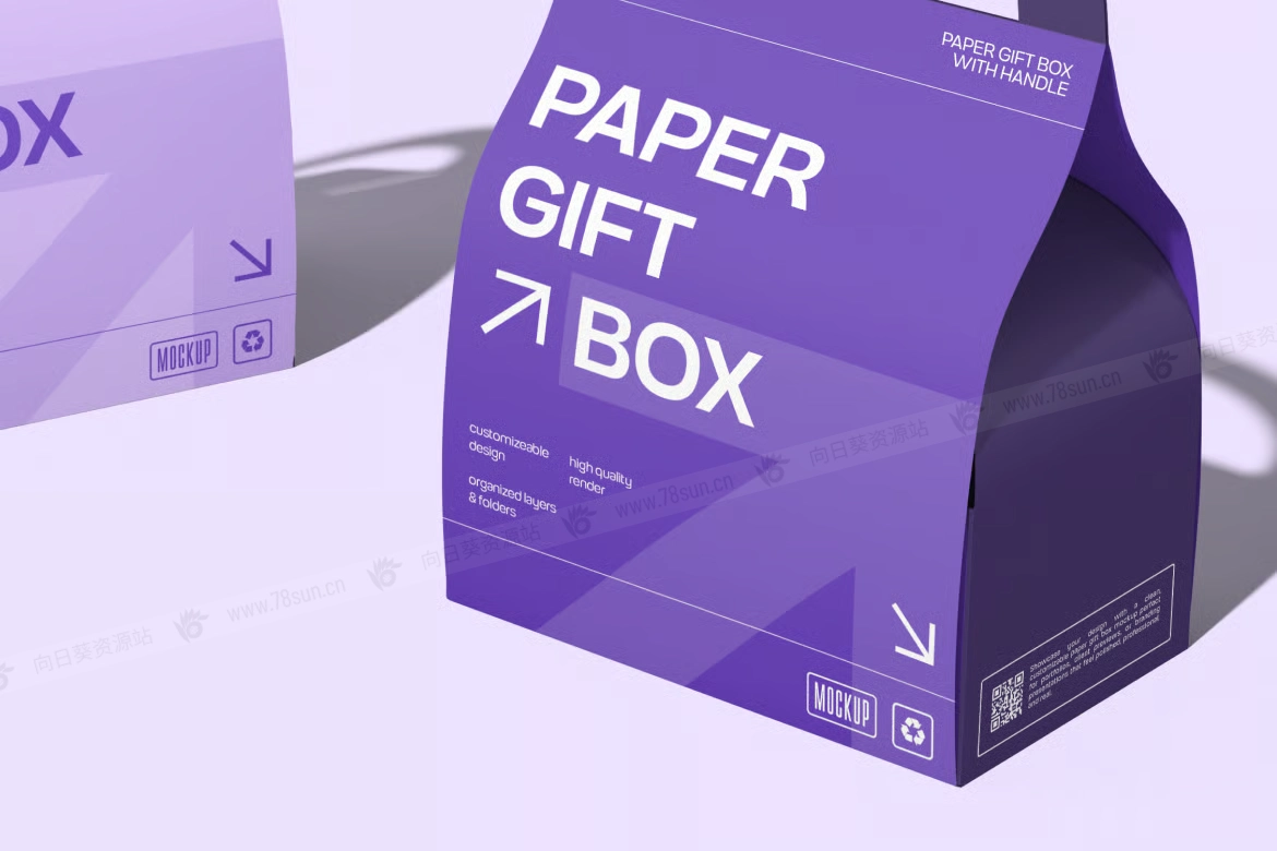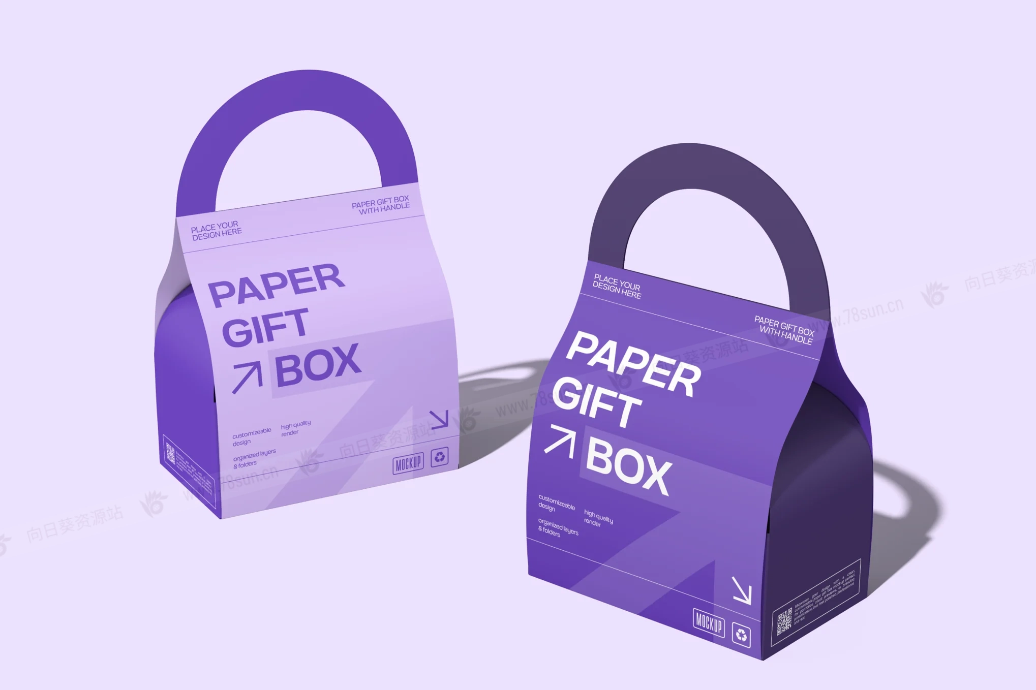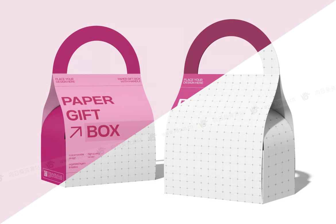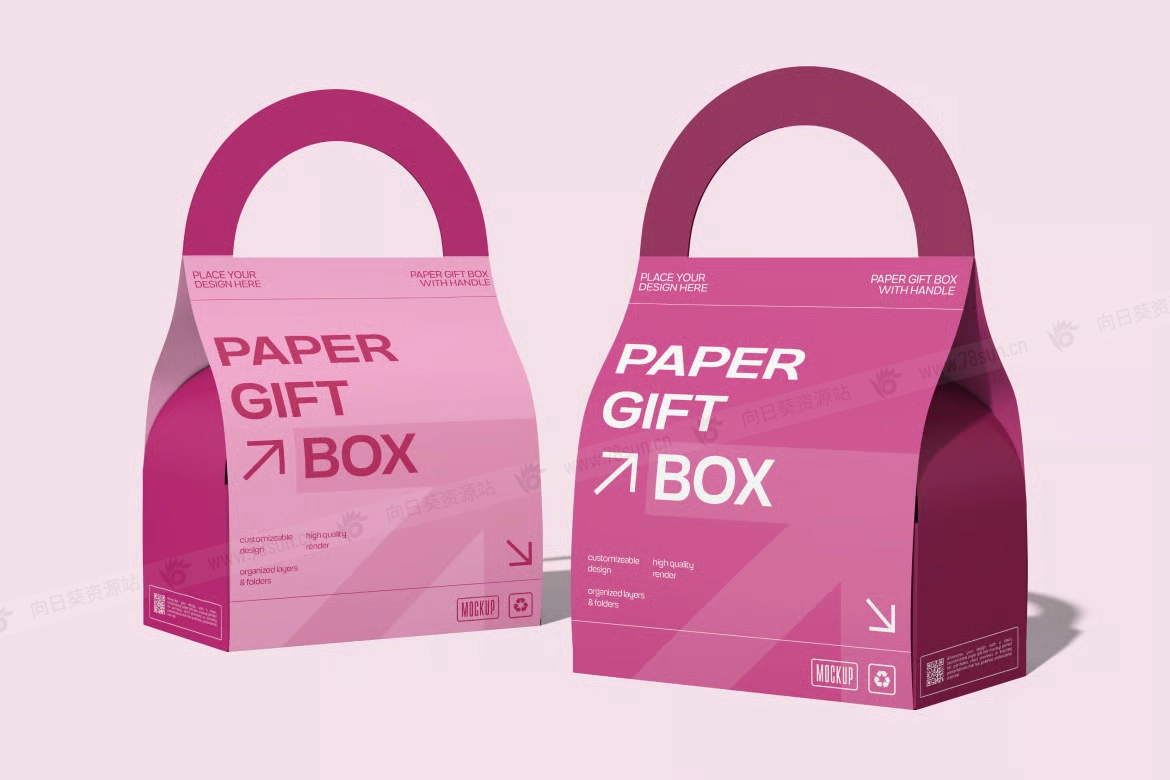 纸质礼品包装纸盒手提纸袋品牌VI效果图展示智能贴图psd设计样机,采用时尚的模切盒设计和圆形手柄,非常适合展示礼品、活动或产品包装的品牌。包括两个略有不同的模型角度,从盒子设计到背景颜色,一切都是完全可定制的。