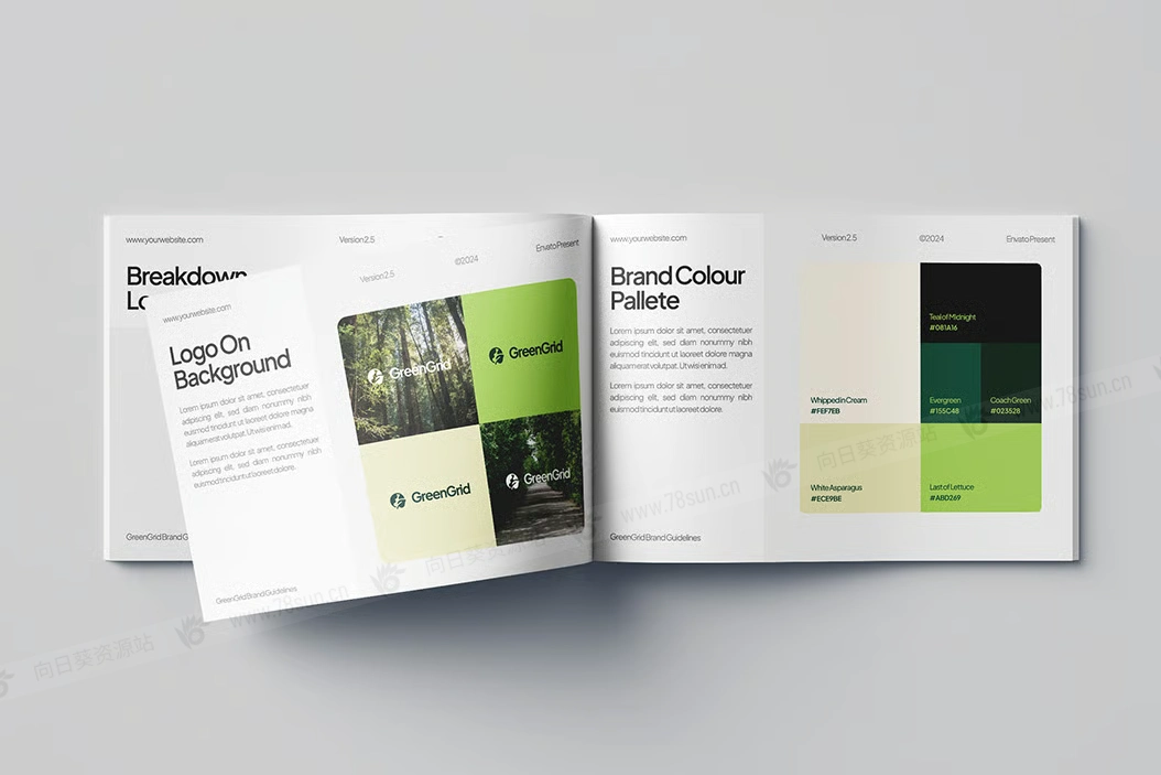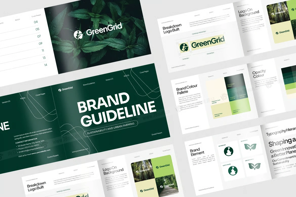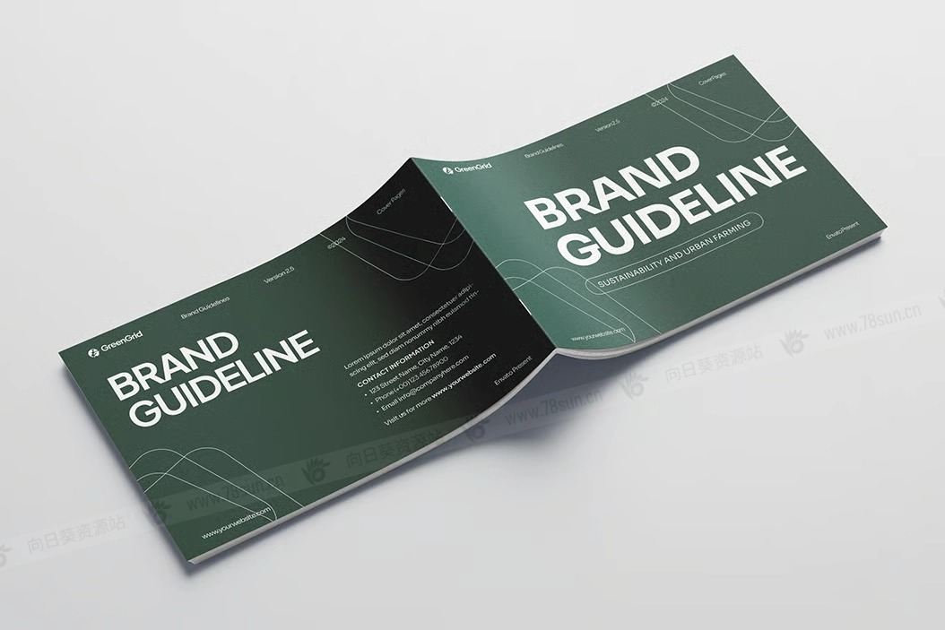 现代绿色品牌指南小册子杂志宣传册画册ai设计模板。本指南包含结构良好的部分,如徽标细分、调色板和排版系统,