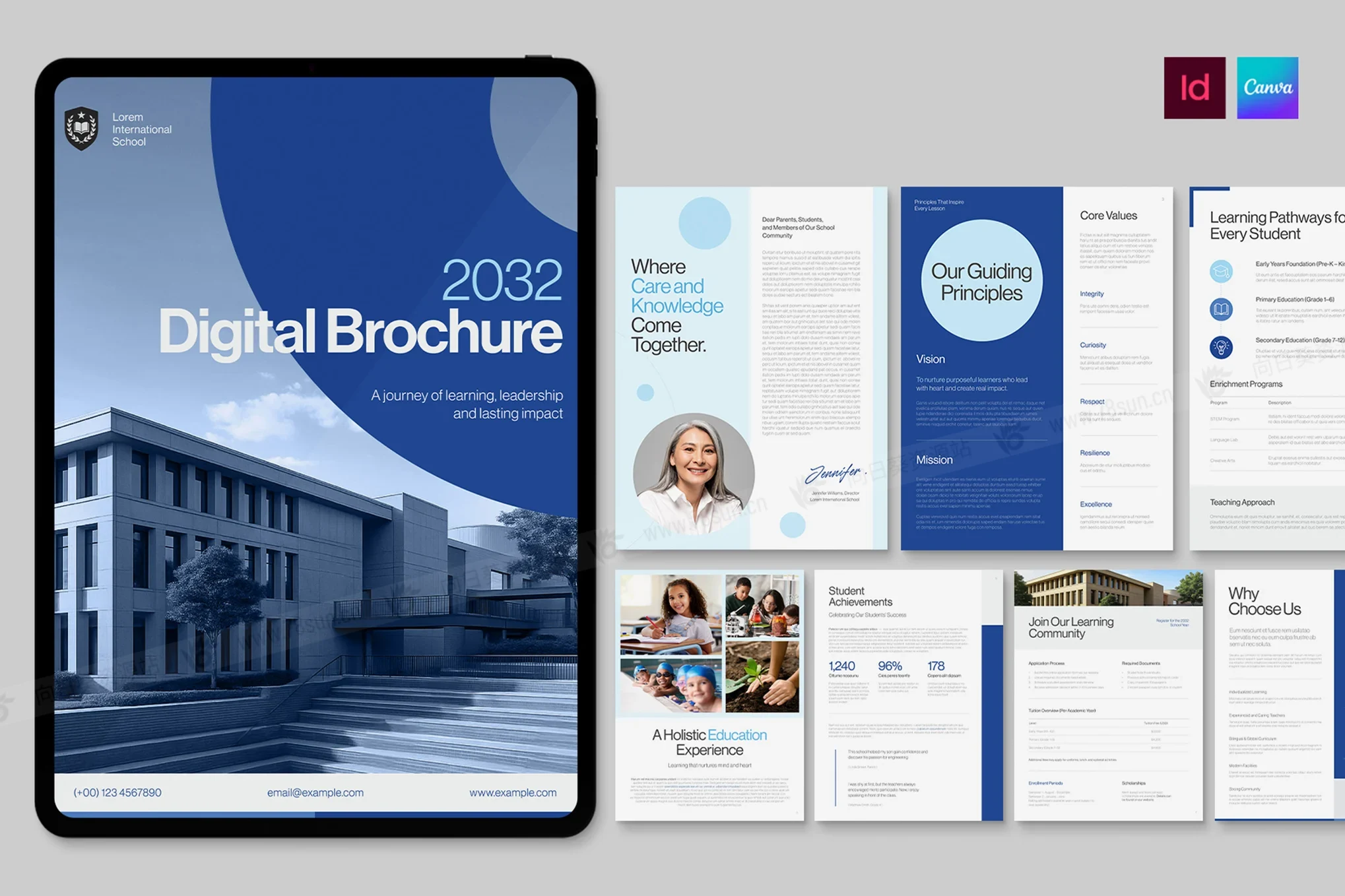 学校教育大学招生简章电子书数字小册子杂志宣传册画册indd设计模板,非常适合创建令人惊叹的数字文档、电子书和 PDF 宣传册。它提供 Canva、InDesign IDML 和 INDD 格式,非常适合制作专业电子书,它适合希望展示大学招生简章的学校、学院、教育工作者和营销人员。