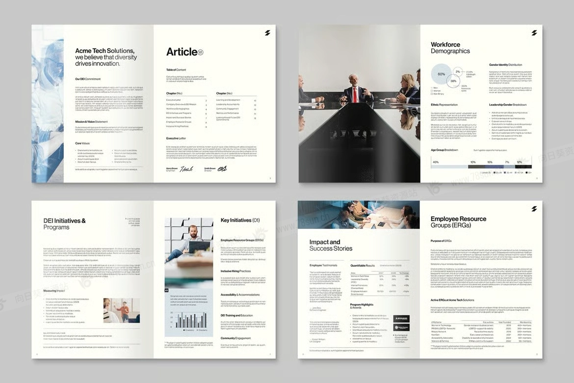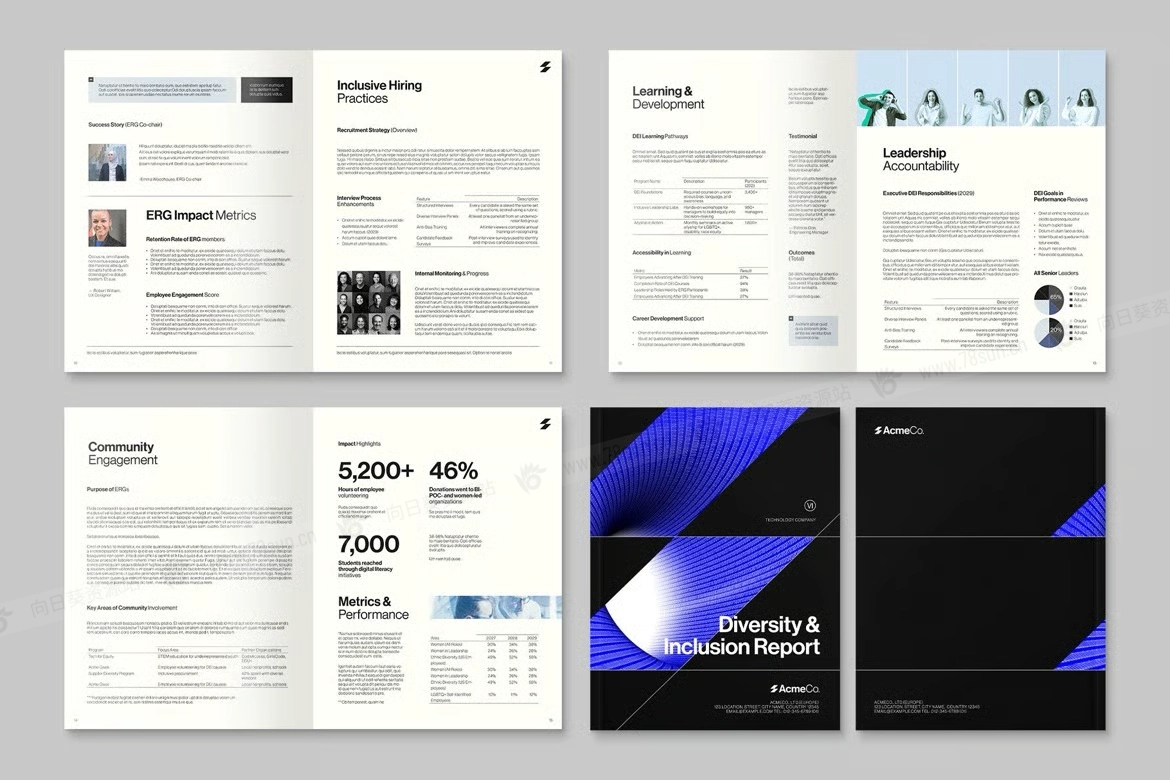 公司简介年度报告小册子杂志宣传册画册indd设计模板。这款多功能模板有 Canva、InDesign IDML 和 INDD 格式,适合旨在传达企业责任和多样化实践的企业、政策制定者和投资者。
