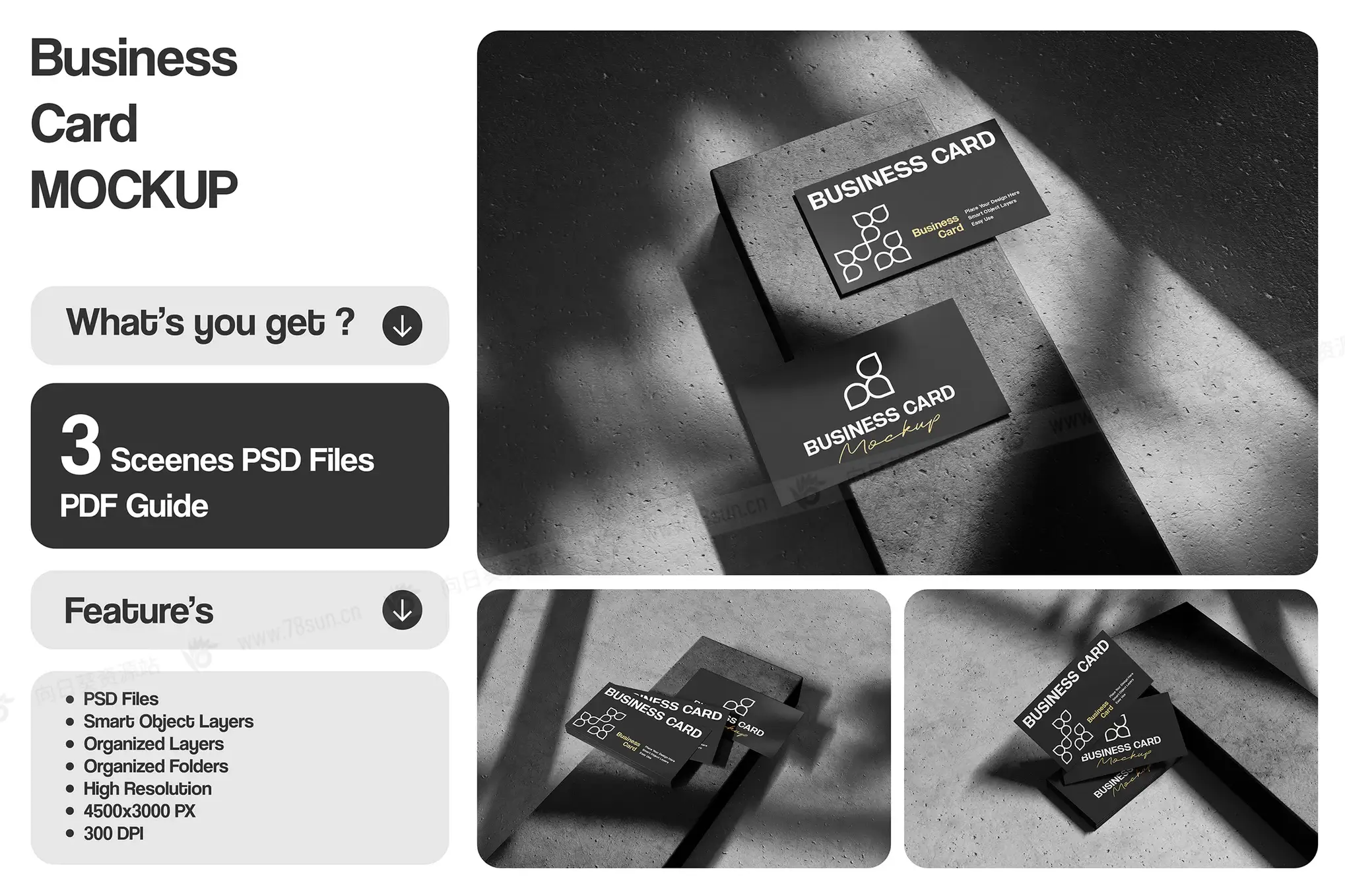 名片商业卡片品牌VI效果图展示智能贴图psd设计样机。使用智能对象轻松替换为您的设计,双击智能图层,复制并粘贴您的图稿。 包含精心组织的 PSD 文件,具有结构良好的图层。