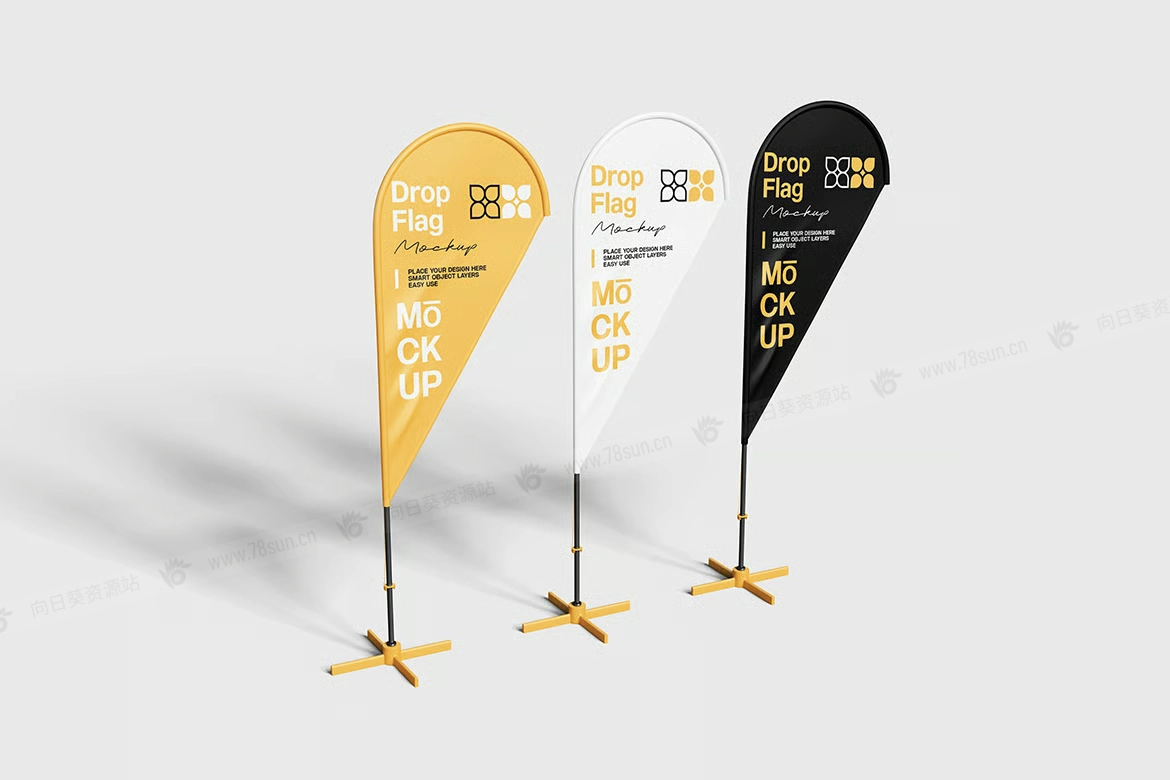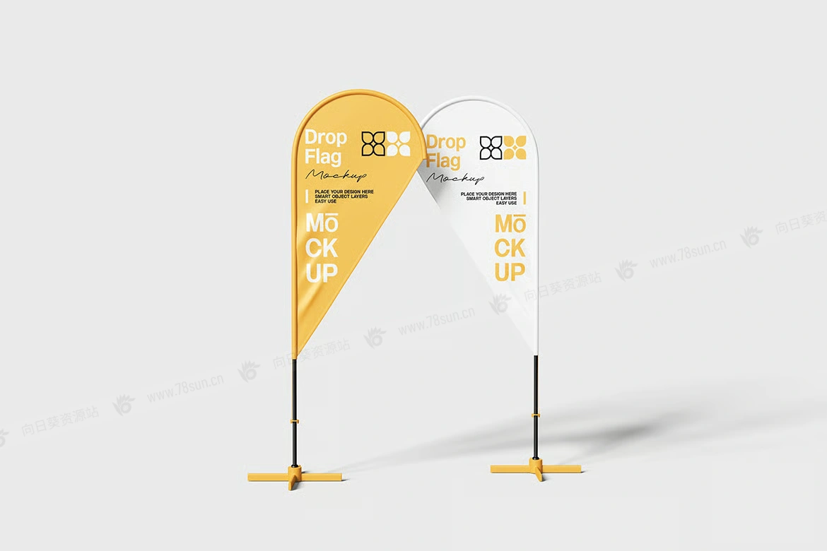 泪滴旗帜广告牌海报横幅品牌VI效果图展示智能贴图psd设计样机。使用智能对象轻松替换为您的设计,双击智能图层,复制并粘贴您的图稿。 包含精心组织的 PSD 文件,具有结构良好的图层。
