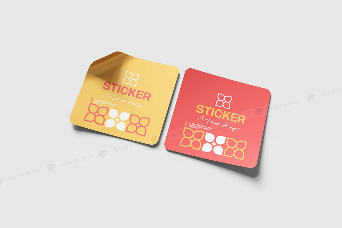 方形剥皮贴纸品牌VI效果图展示智能贴图psd设计样机。使用智能对象轻松替换为您的设计,双击智能图层,复制并粘贴您的图稿。 包含精心组织的 PSD 文件,具有结构良好的图层。