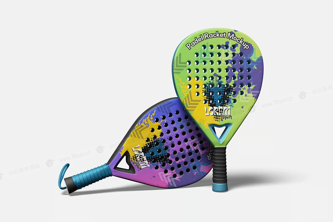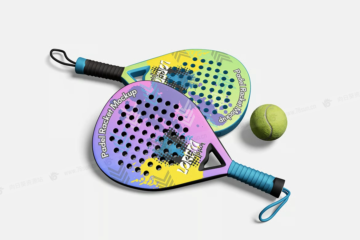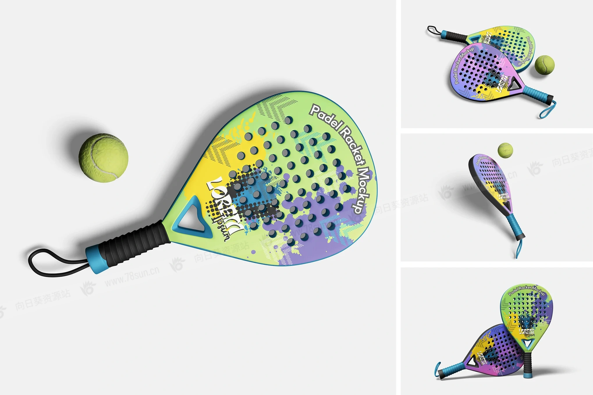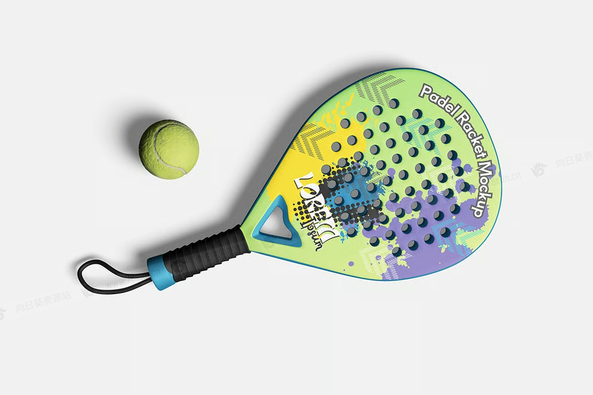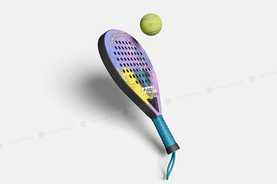 板式网球Padel球拍品牌VI效果图展示智能贴图psd设计样机。以 PSD 格式提供,具有智能对象功能,可快速轻松地插入您自己的图稿。