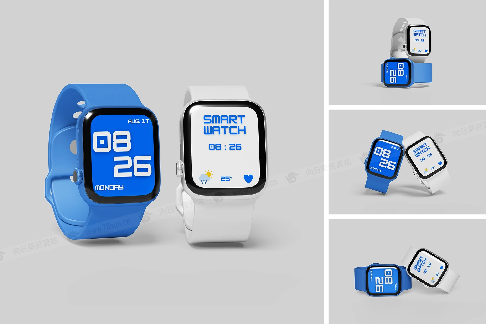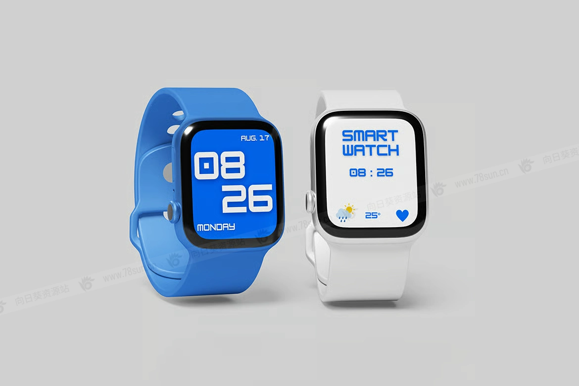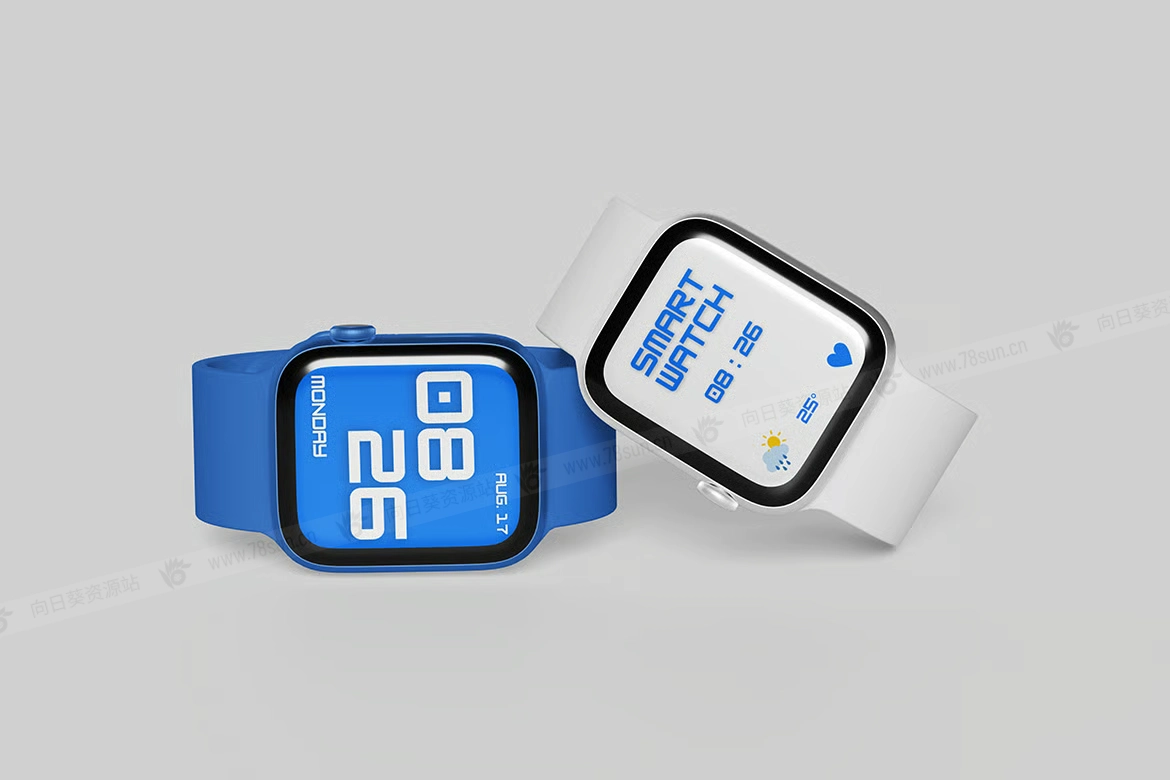 Watch数字智能手表UI设计效果图展示智能贴图psd设计样机。此模型包括 4 个具有分层良好 PSD 文件,并且此模型还使用智能对象功能,这意味着您可以在几秒钟内轻松快速地使用自己的设计更改当前设计。