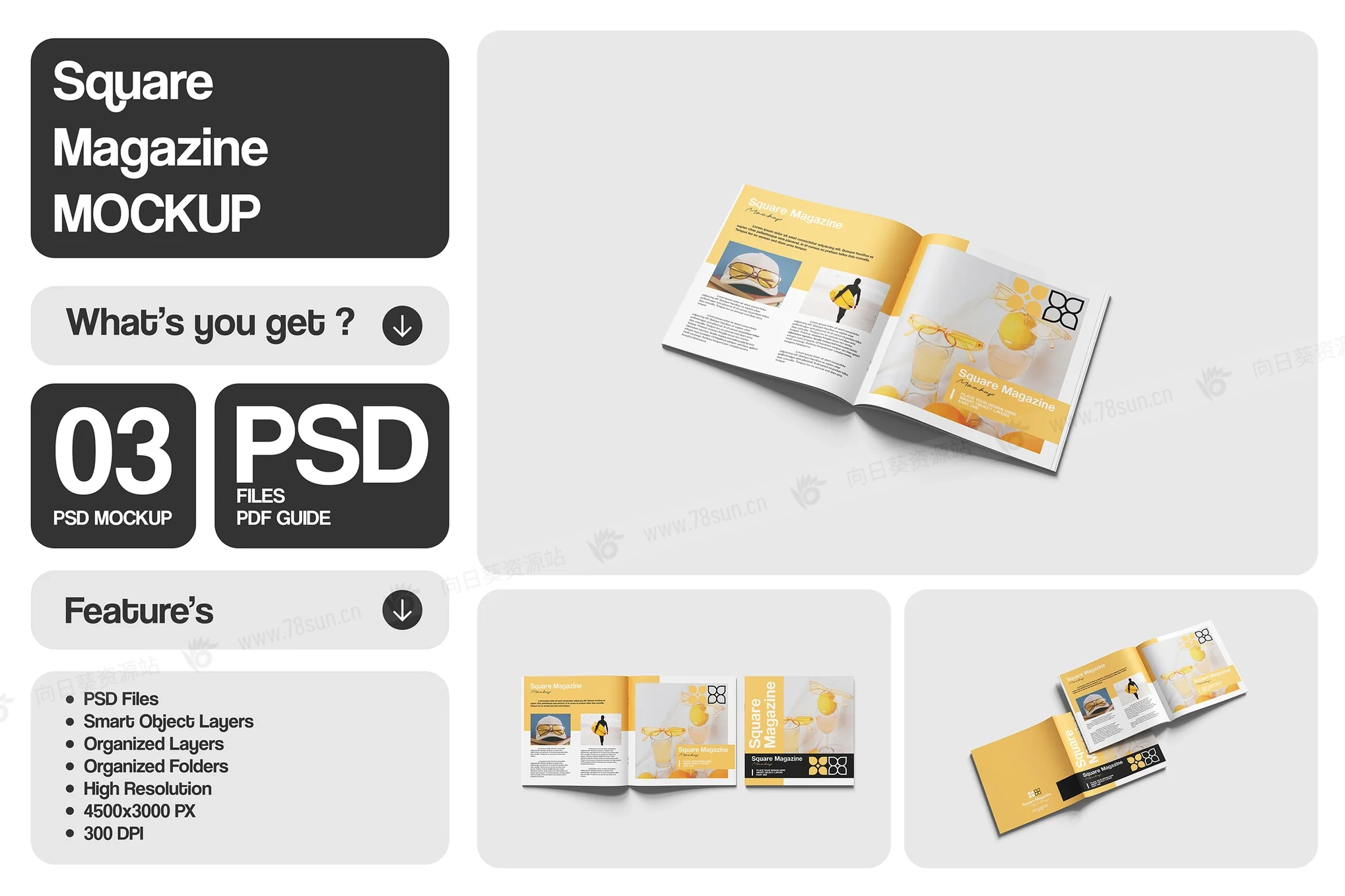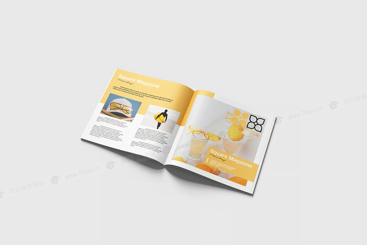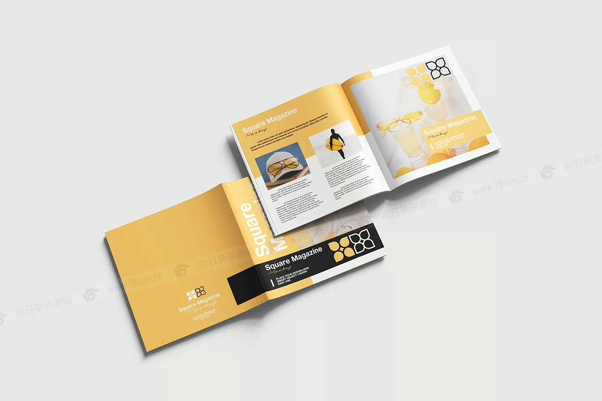 方形杂志封面内页品牌VI效果图展示智能贴图psd设计样机。使用智能对象轻松替换为您的设计,双击智能图层,复制并粘贴您的图稿。 包含精心组织的 PSD 文件,具有结构良好的图层。
