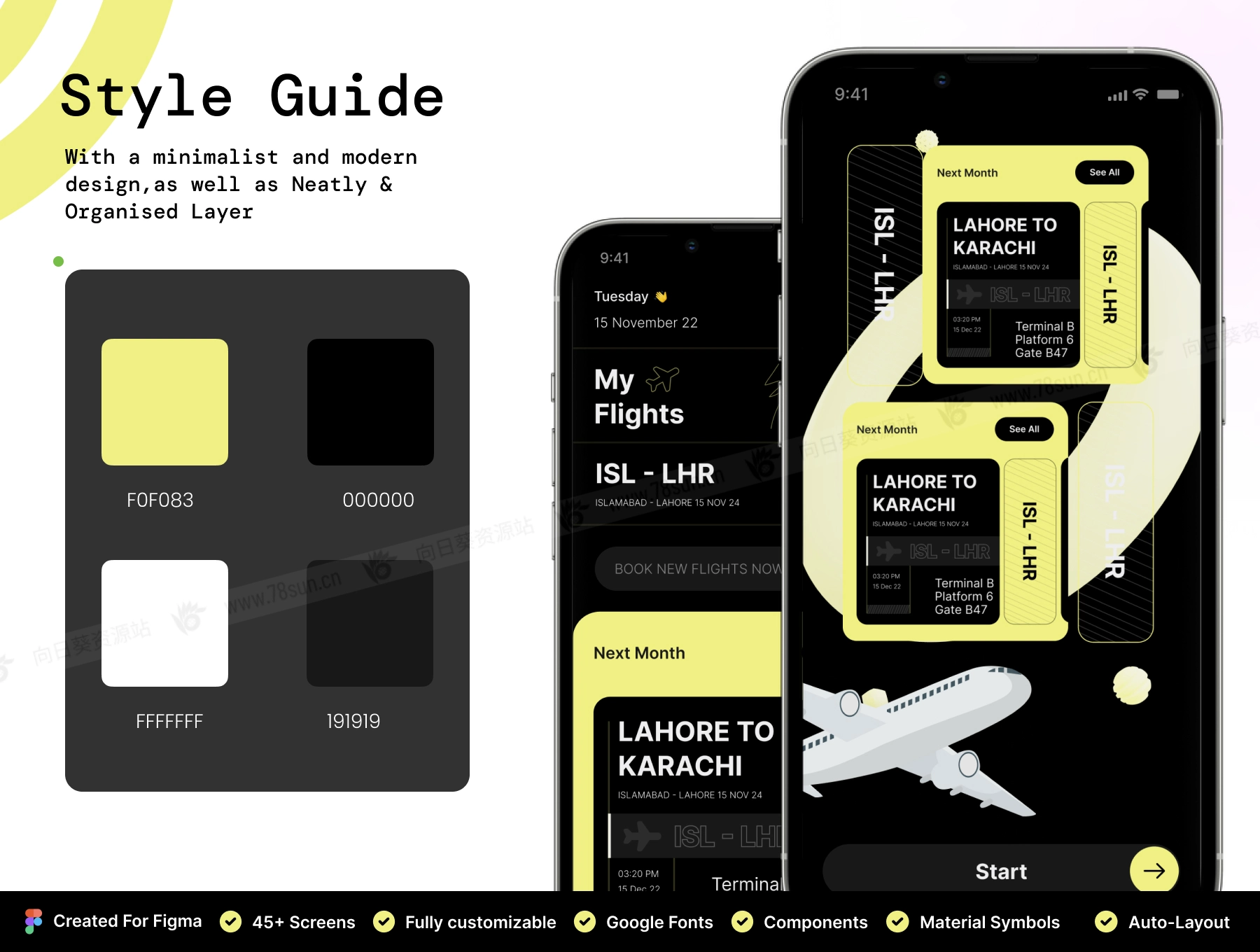 航班机票预订票据座位信息app ui界面设计fig源文件模板。这是 45+ 屏幕设计。非常适合旅行应用程序、航班应用程序、机票预订应用程序等。由于矢量形状和组织良好的图层,概念易于编辑、自定义和调整大小。