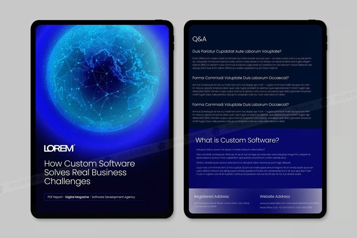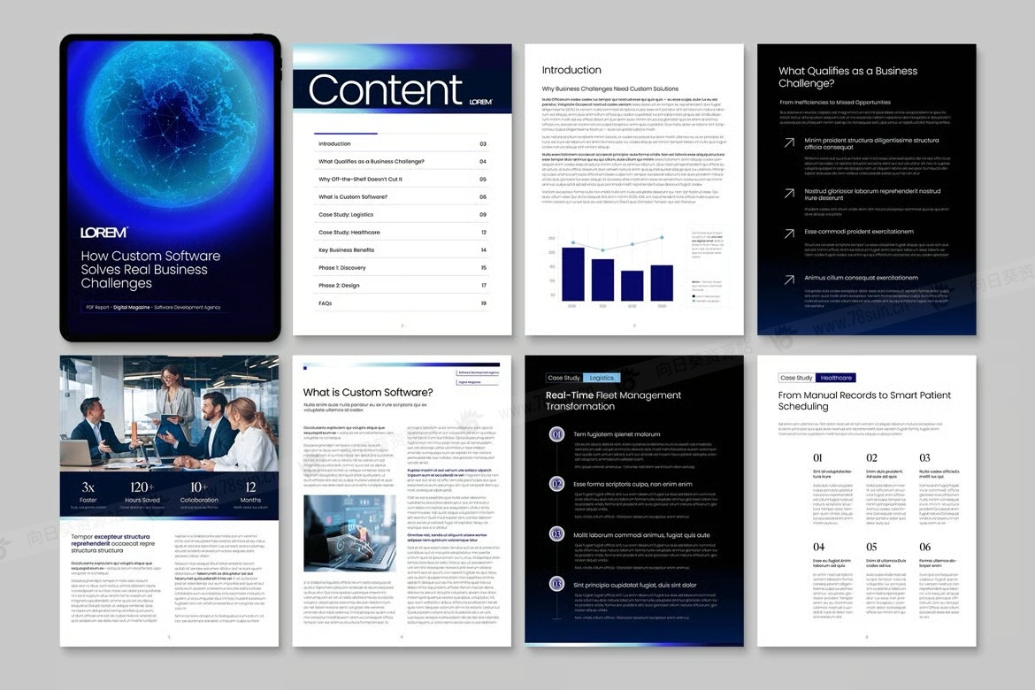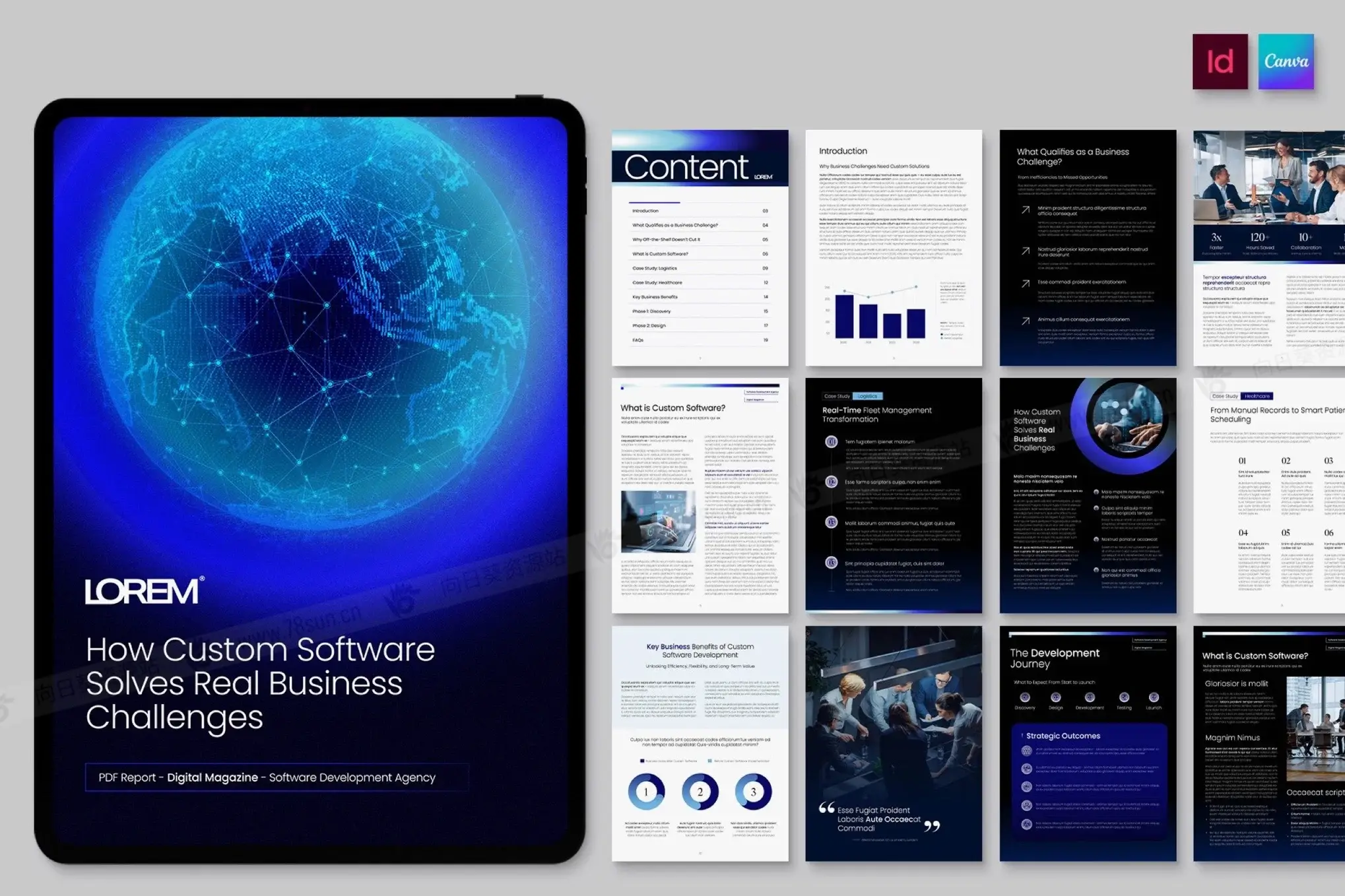 高科技新闻资讯电子书数字小册子杂志宣传册画册indd设计模板。此模板提供 Canva 和 InDesign 格式(IDML、INDD),非常适合科技初创公司、软件开发商和数字营销机构。其简洁的布局和现代的封面设计使其适合在会议、网络研讨会和客户演示中展示创新理念。借助其可定制的 PDF 文档格式,