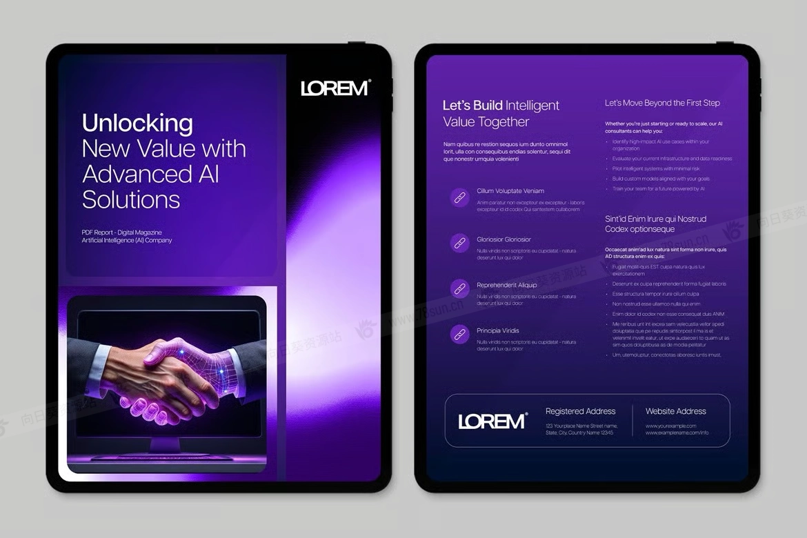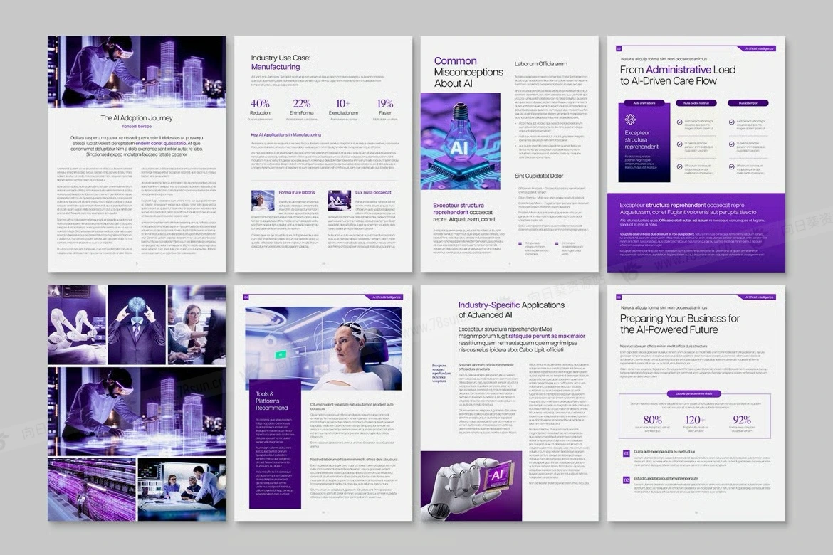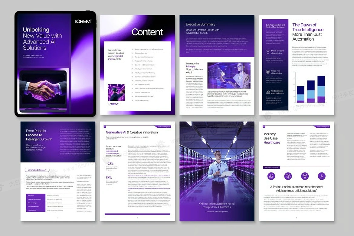 未来科技技术电子书数字小册子杂志宣传册画册indd设计模板,提供 InDesign IDML、INDD 和 Canva 格式,非常适合制作尖端时事通讯、数字杂志或企业演示文稿。以其专业的布局和未来主义的美感在研讨会、大会或虚拟活动中给客户留下深刻印象,确保您的内容既有影响力又具有视觉吸引力。