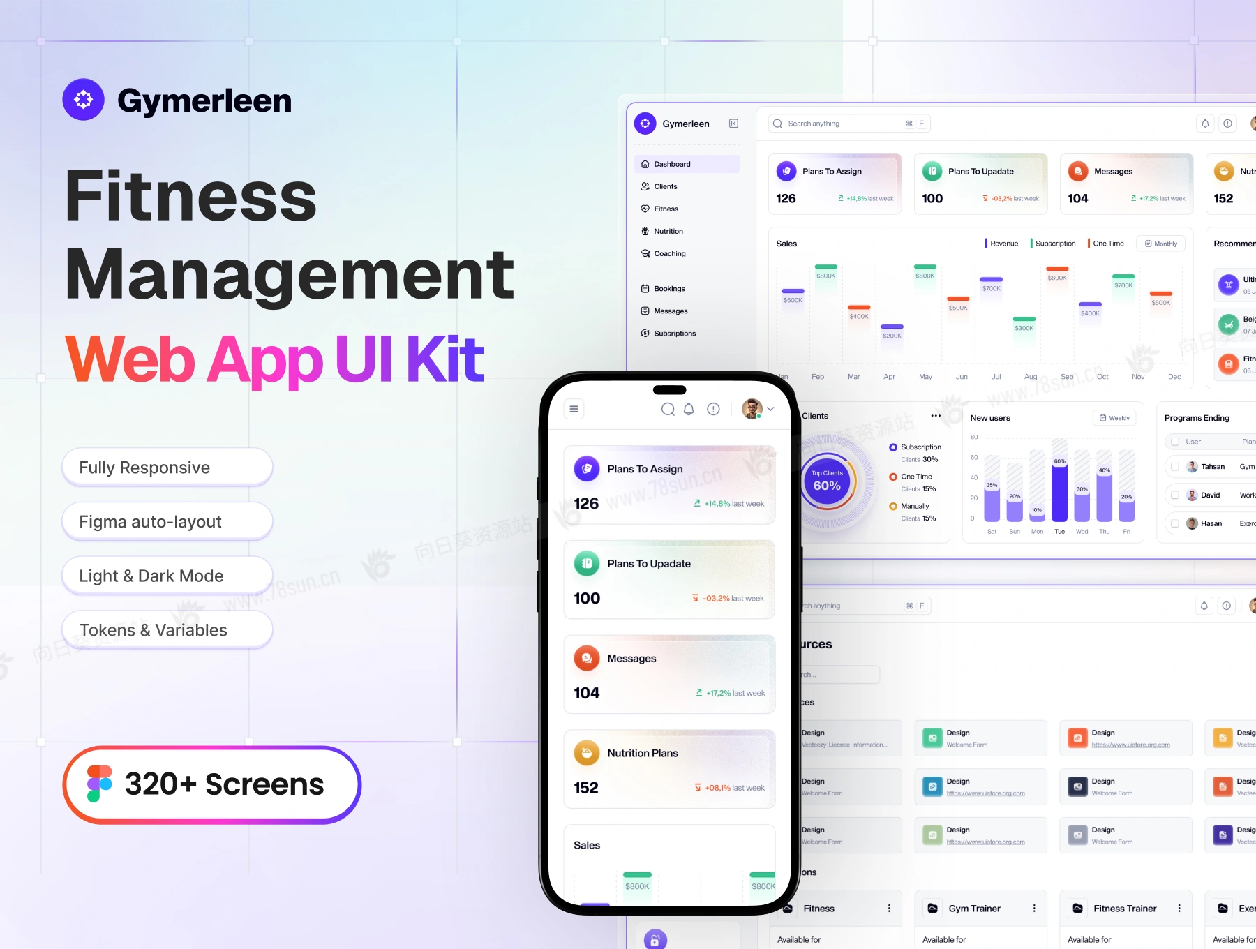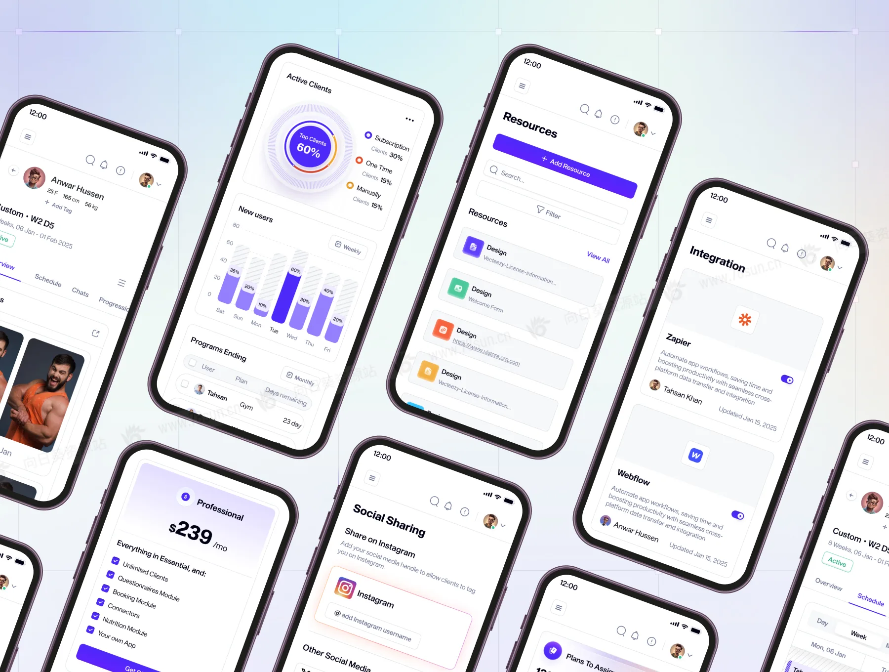 健身管理营养计划全平台网站移动端web/app ui界面设计fig源文件模板,适用于健身房、教练和健身企业的现代直观设计解决方案。它包括客户管理、健身追踪、营养计划、辅导课程、消息和订阅等基本功能,以简化作并提高用户参与度。这款 UI 套件具有时尚且用户友好的界面,非常适合创建无缝的健身管理体验