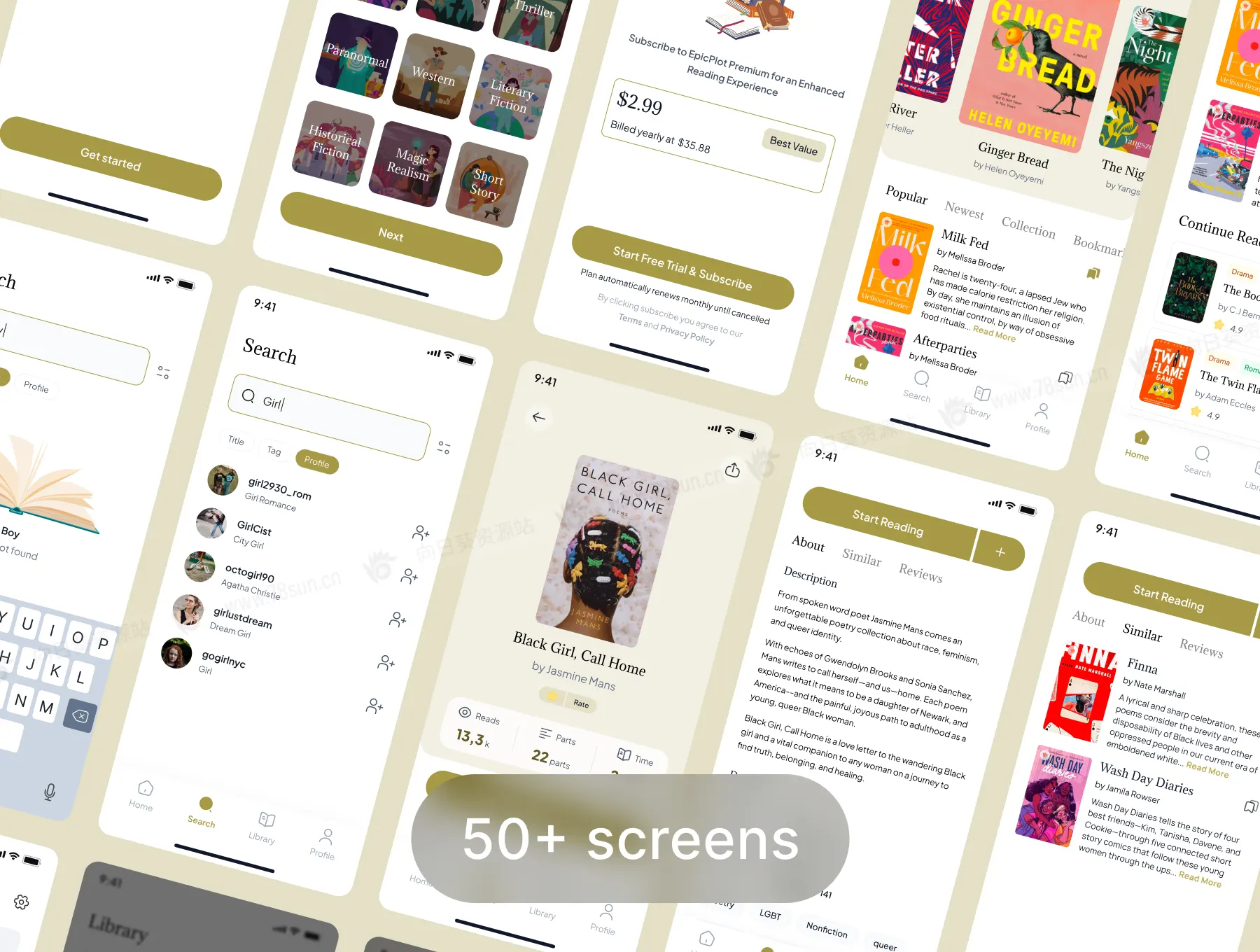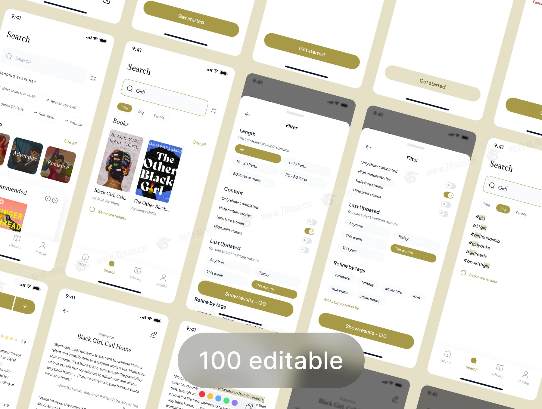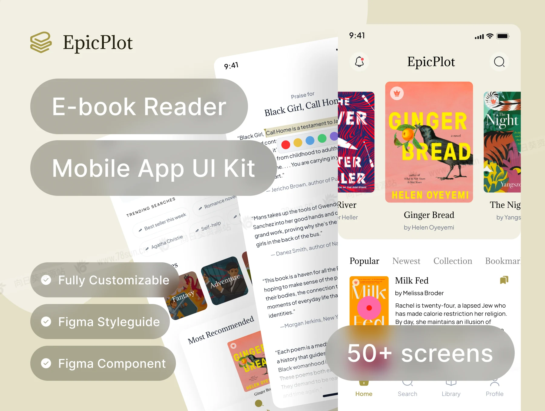 网上书店书籍电子书小说阅读器app ui界面设计fig源文件模板,包含各种高级元素,包括按钮、表单、调色板和字体样式指南。每个组件都经过精心设计,以确保流畅和用户友好的交互。