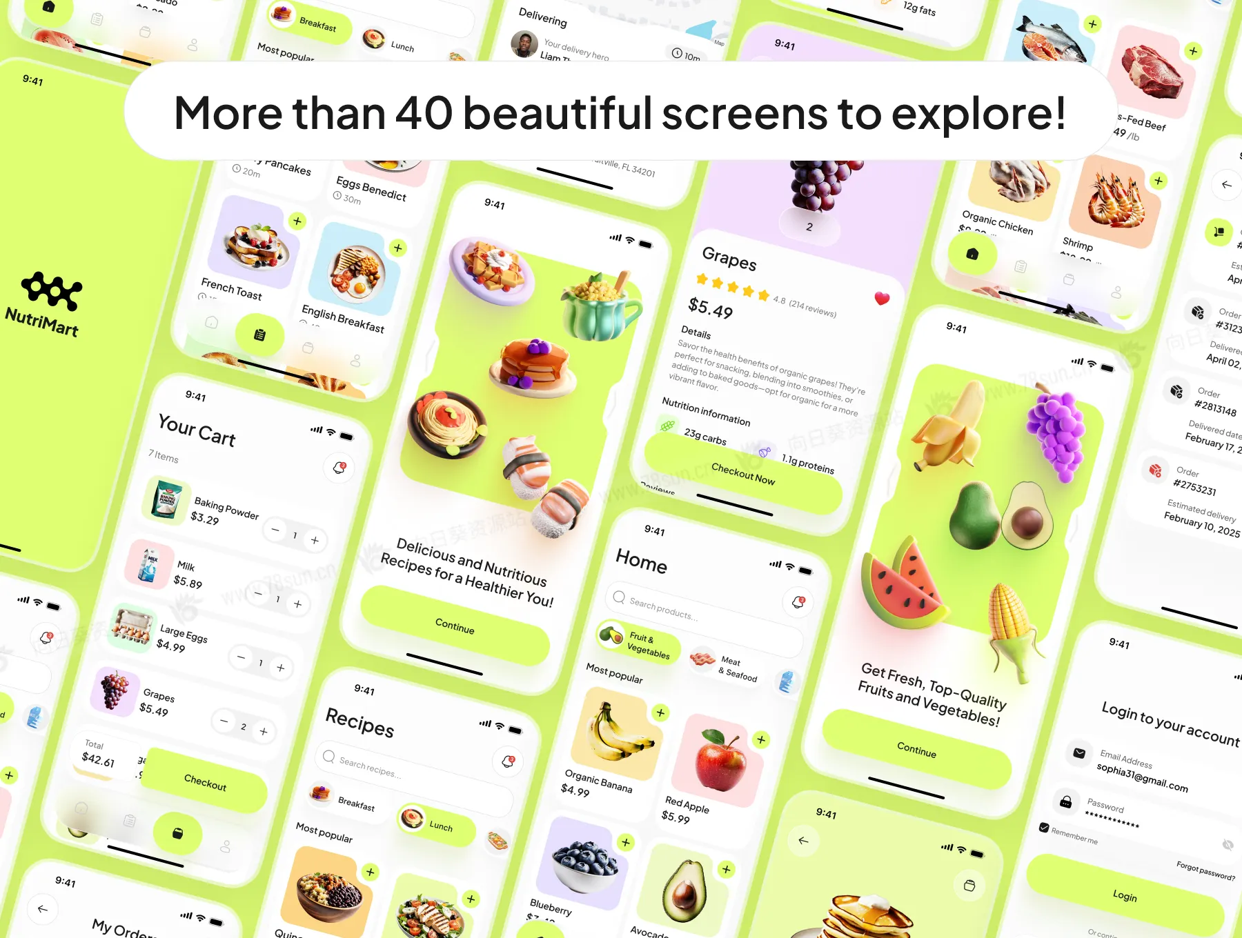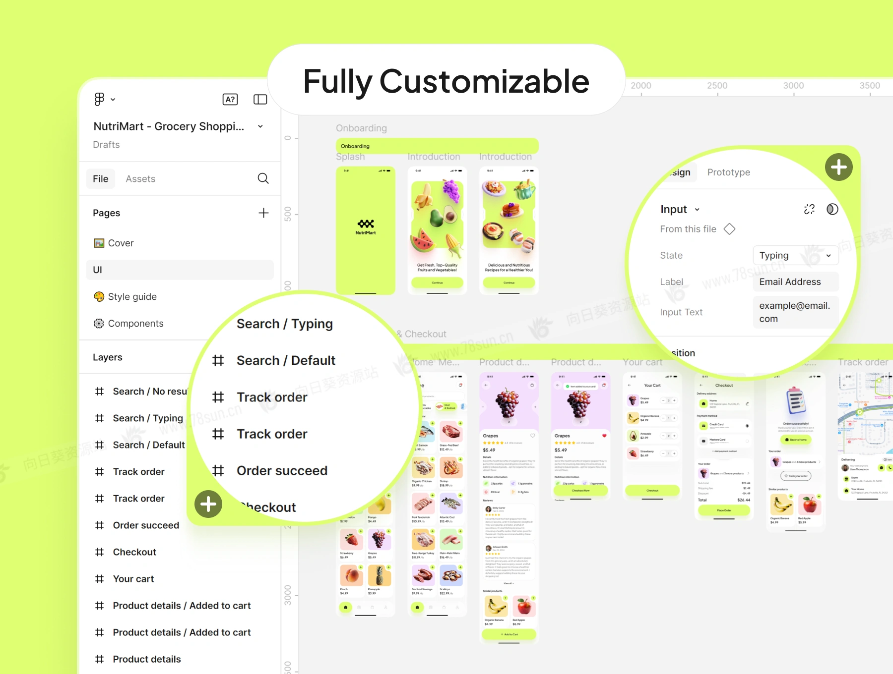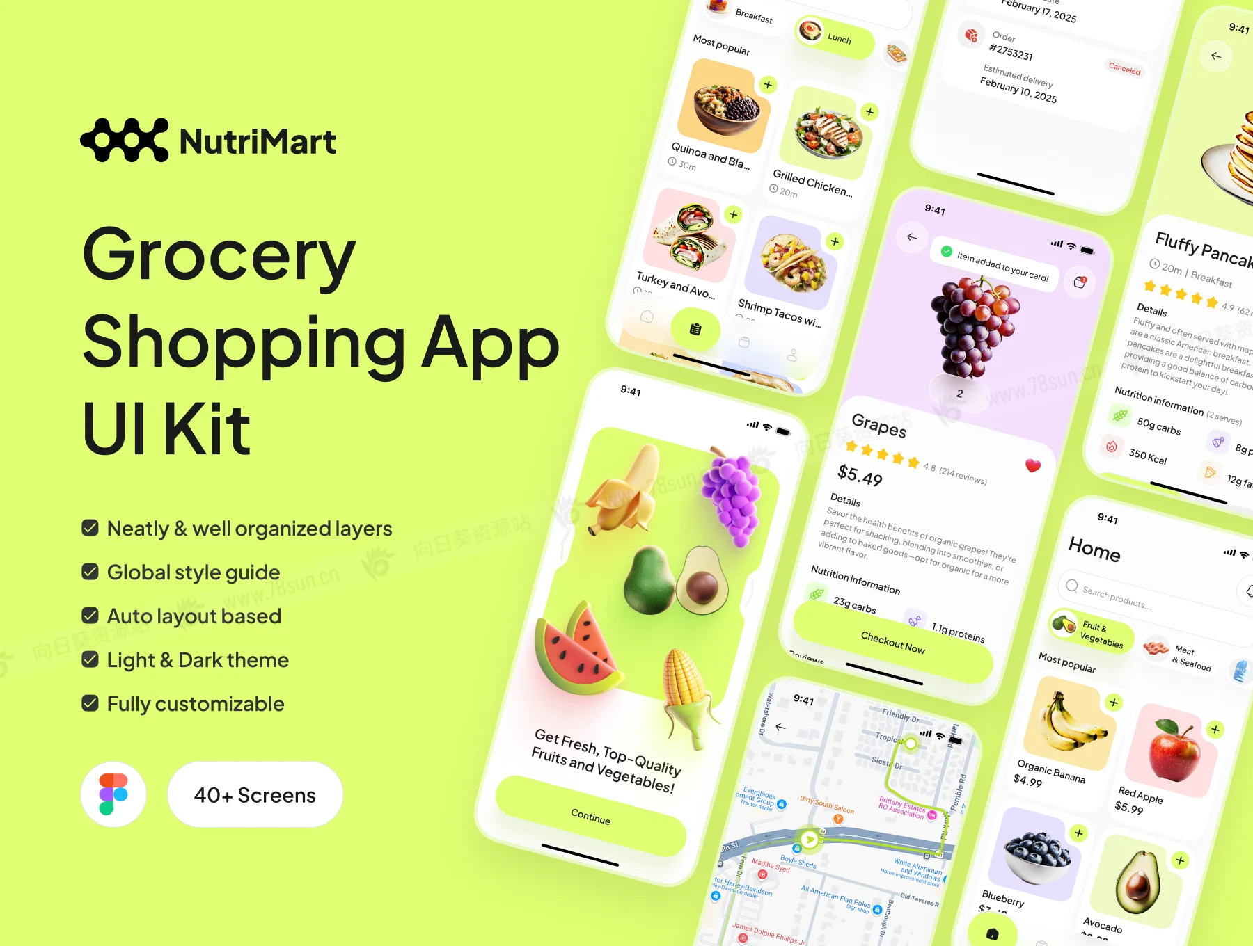 蔬果日用品杂货店在线超市app ui界面设计sketch xd fig源文件模板!该套件包含设计精美的屏幕、直观的导航和完全可定制的组件,可以轻松创建无缝的购物体验。非常适合杂货配送、市场和电子商务应用程序。