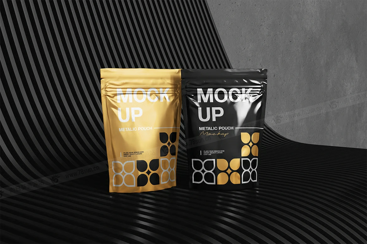 站立式拉链锁袋品牌VI效果图展示智能贴图psd设计样机。使用智能对象轻松替换为您的设计,双击智能图层,复制并粘贴您的图稿。 包含精心组织的 PSD 文件,具有结构良好的图层。