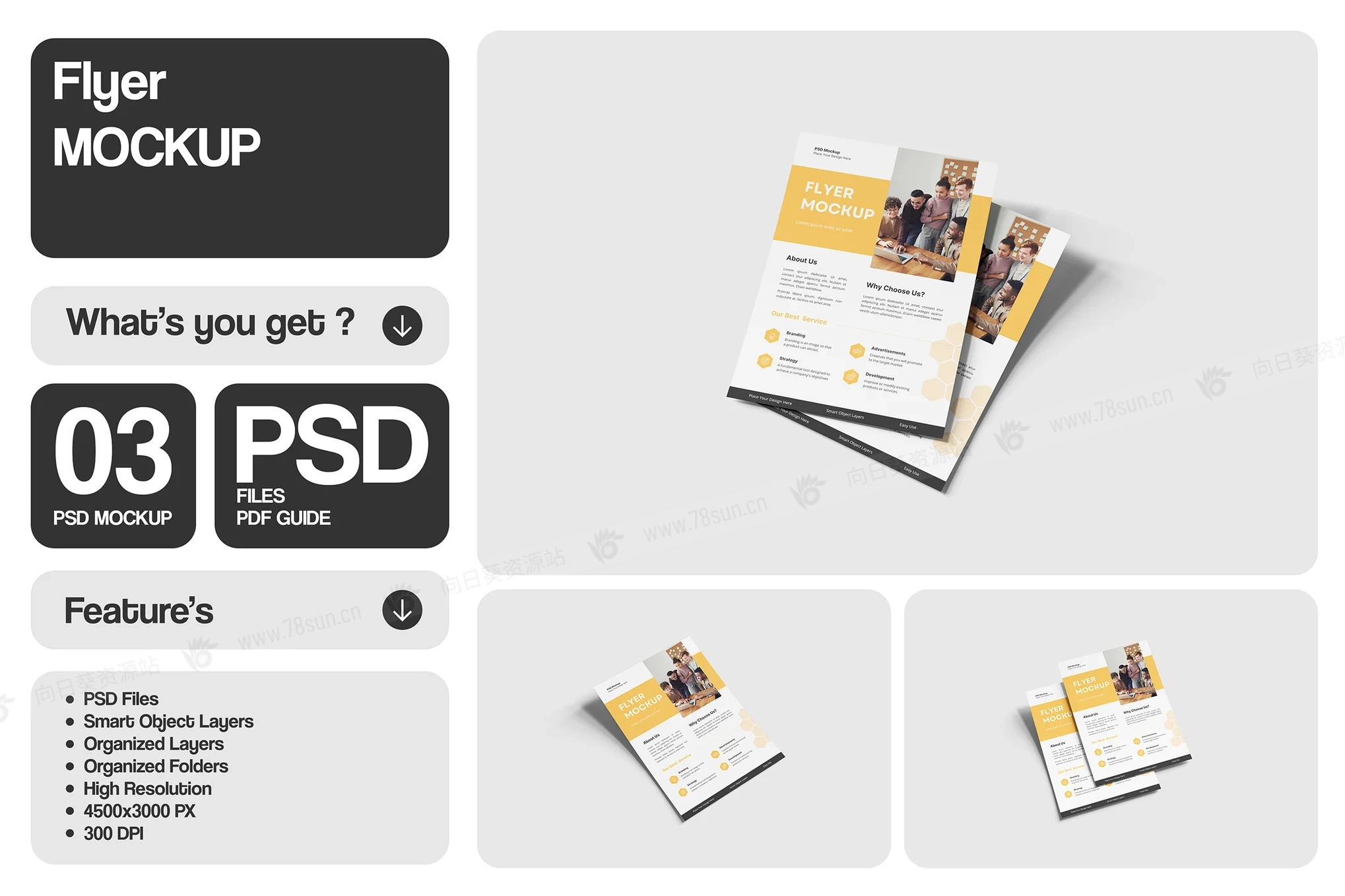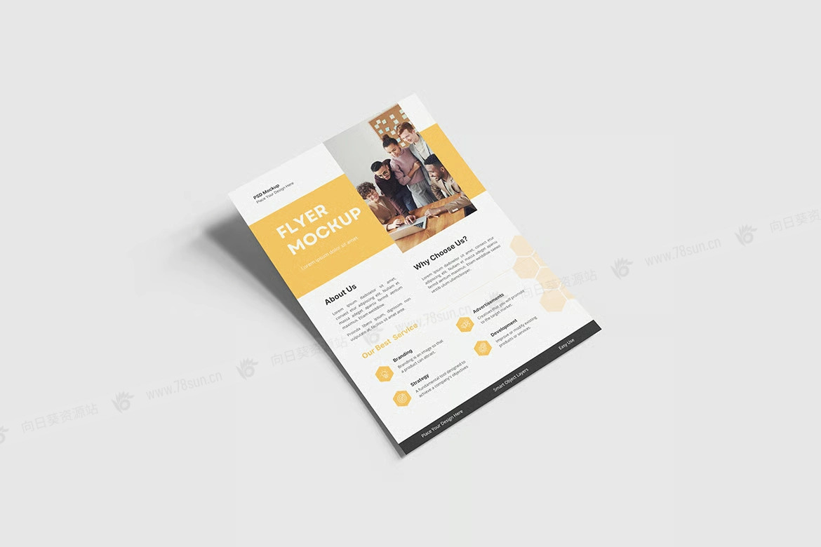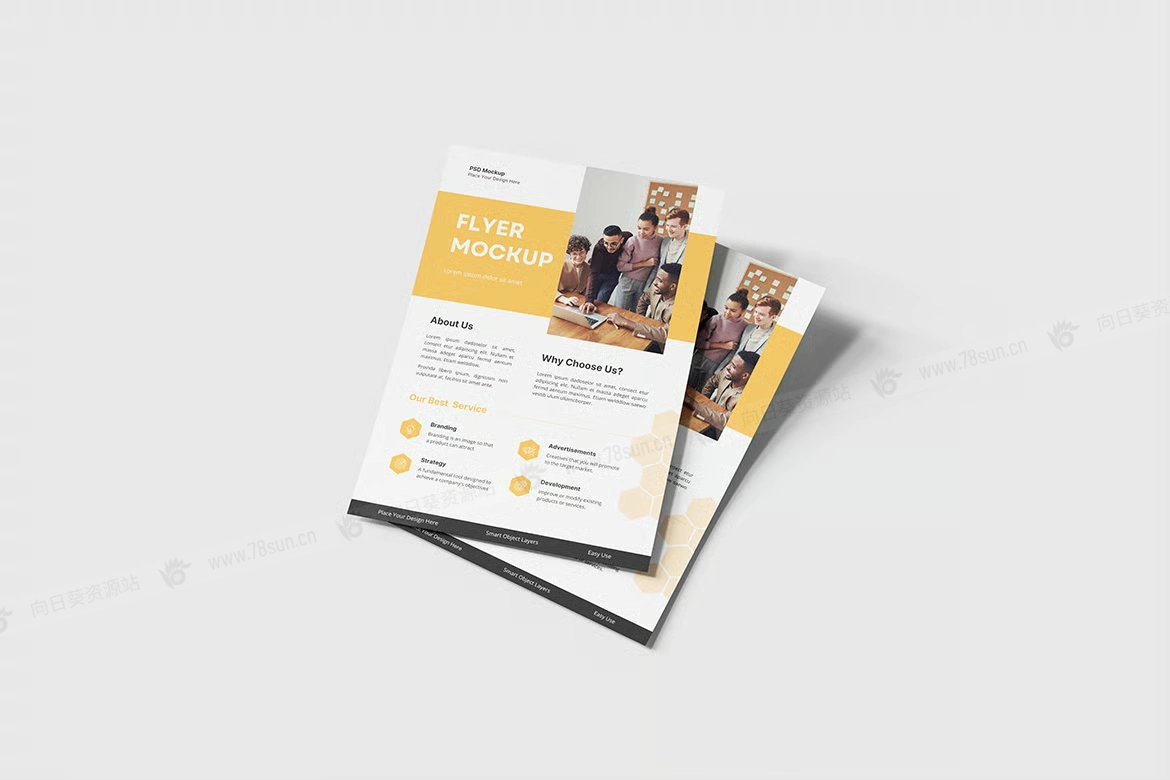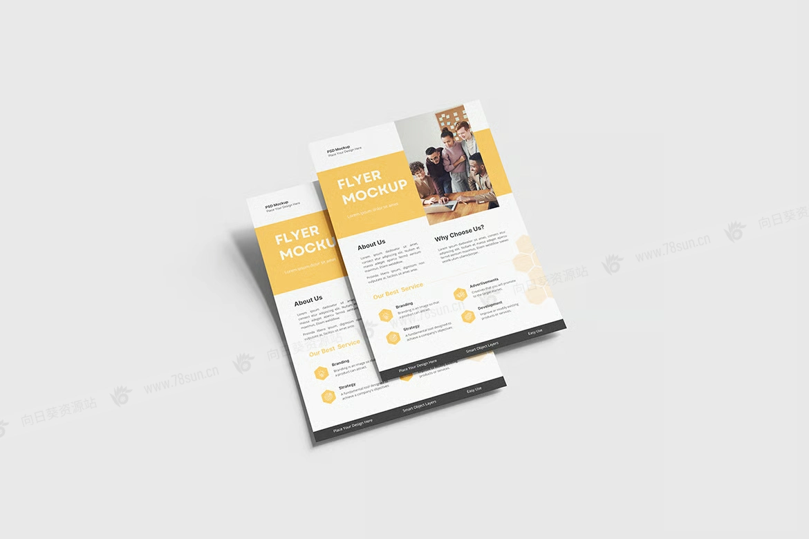 海报宣传单品牌VI效果图展示智能贴图psd设计样机。使用智能对象轻松替换为您的设计,双击智能图层,复制并粘贴您的图稿。 包含精心组织的 PSD 文件,具有结构良好的图层。