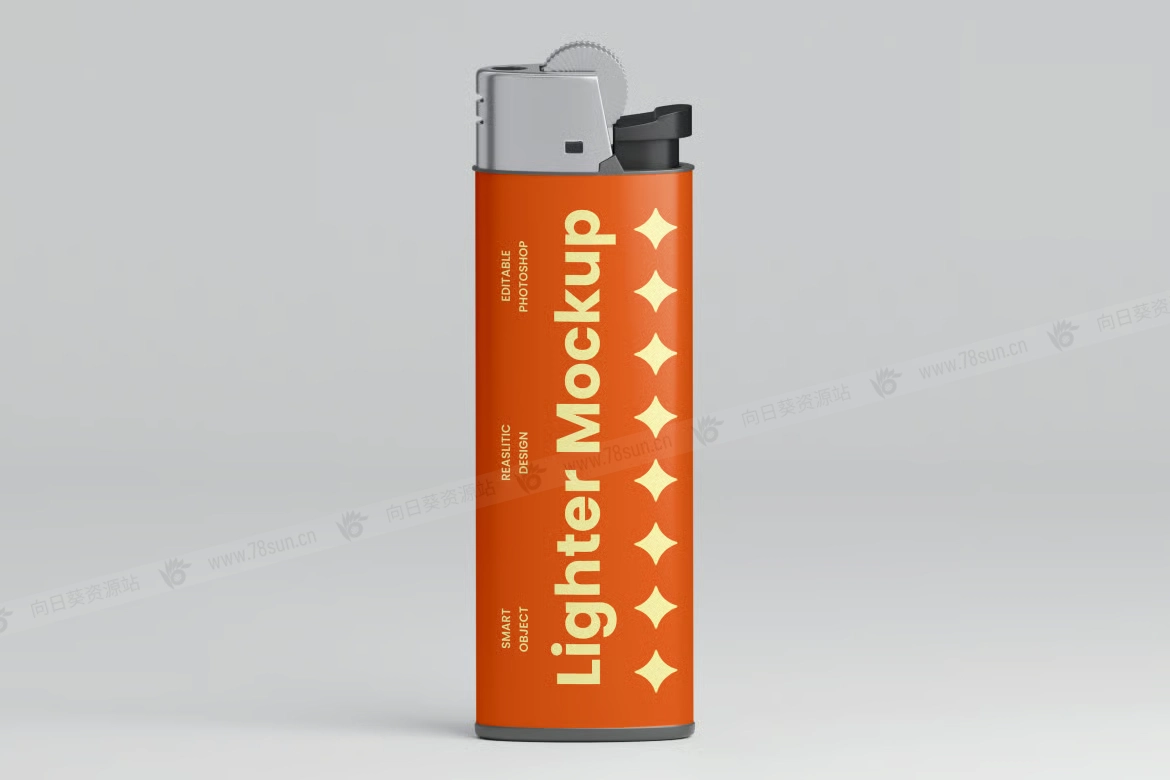 气体打火机品牌VI效果图展示智能贴图psd设计样机。这个模型具有倾斜和直立的视图,清楚地展示了打火机表面的标志位置、图案或设计图形。