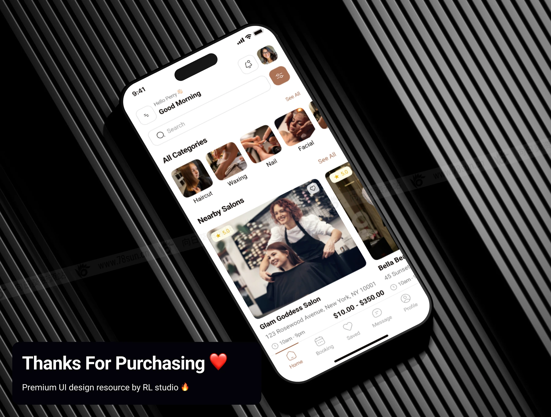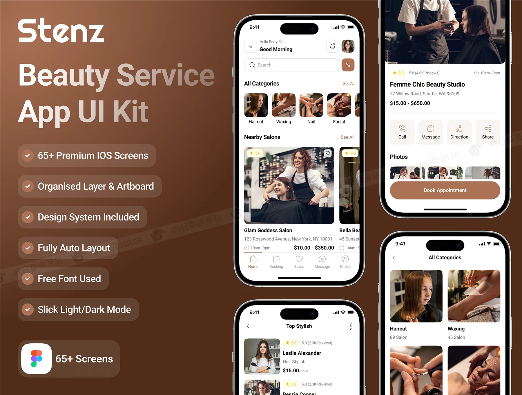 美容预约理发店沙龙美甲app ui界面设计源文件模板,具有 65+ 个精心制作的浅色和深色模式屏幕。该 UI 套件非常适合美容院、水疗中心、发型师和健康服务提供商,提供美观、现代且用户友好的界面。它包括预订、服务列表、用户资料、付款和聊天等基本屏幕,以确保无缝的客户体验。它在构建时考虑到了可扩展性和定制性,非常适合希望高效创建高质量美容服务应用程序的设计师和开发人员。
