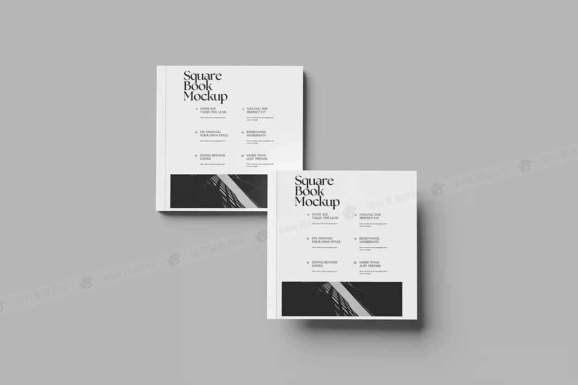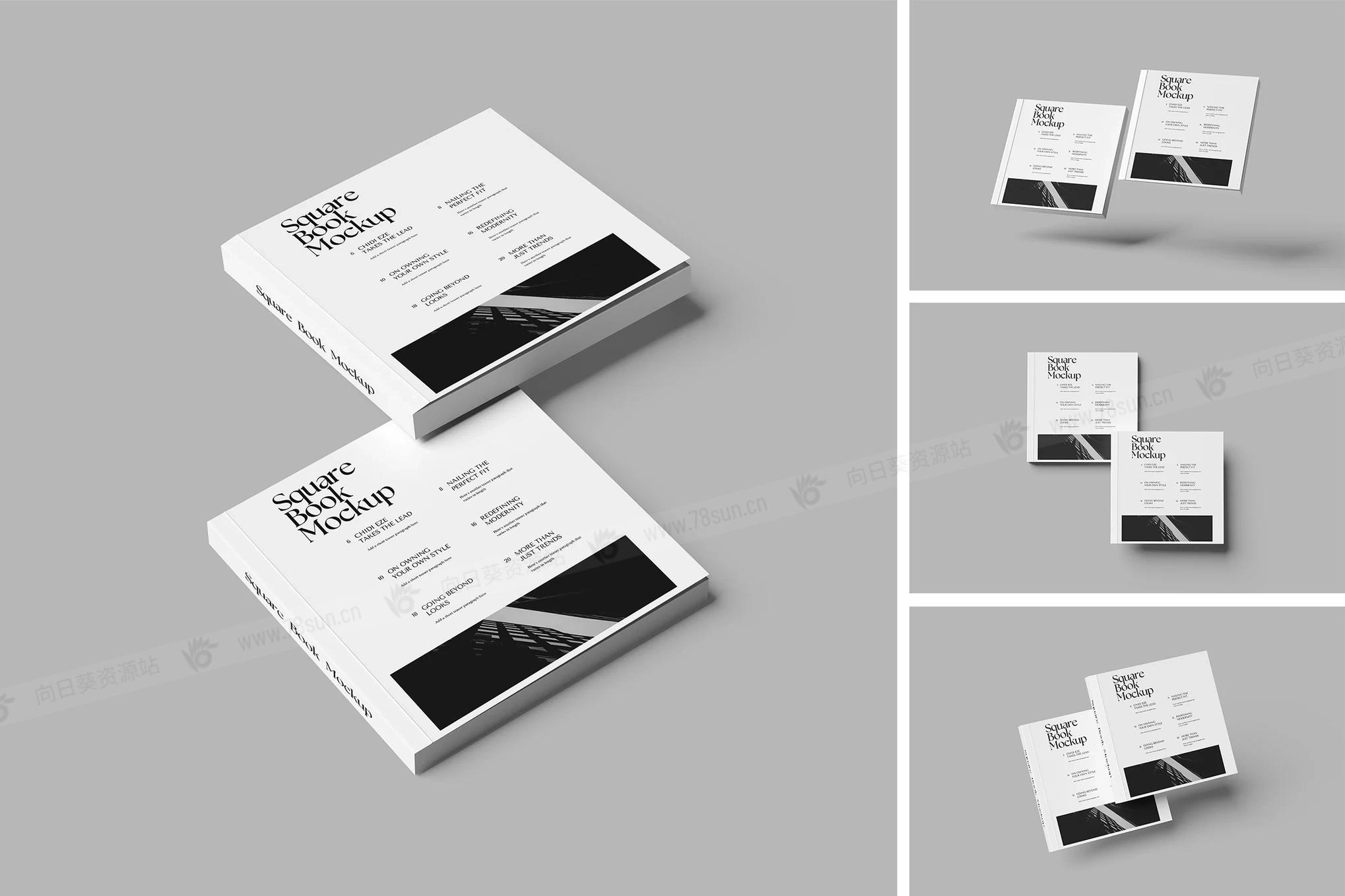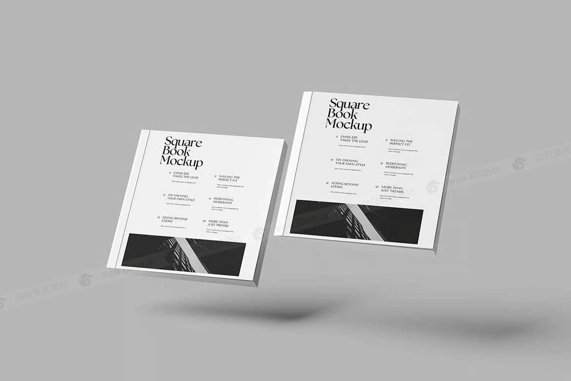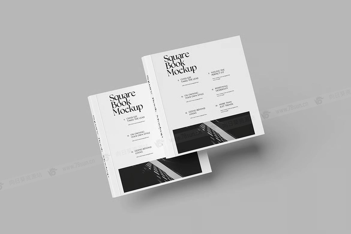 方形书籍封面品牌VI效果图展示智能贴图psd设计样机。该模型包括 4 个带有分层良好 PSD 文件,并且该模型还使用智能对象功能,这意味着您可以在几秒钟内轻松快速地使用自己的设计更改当前设计。