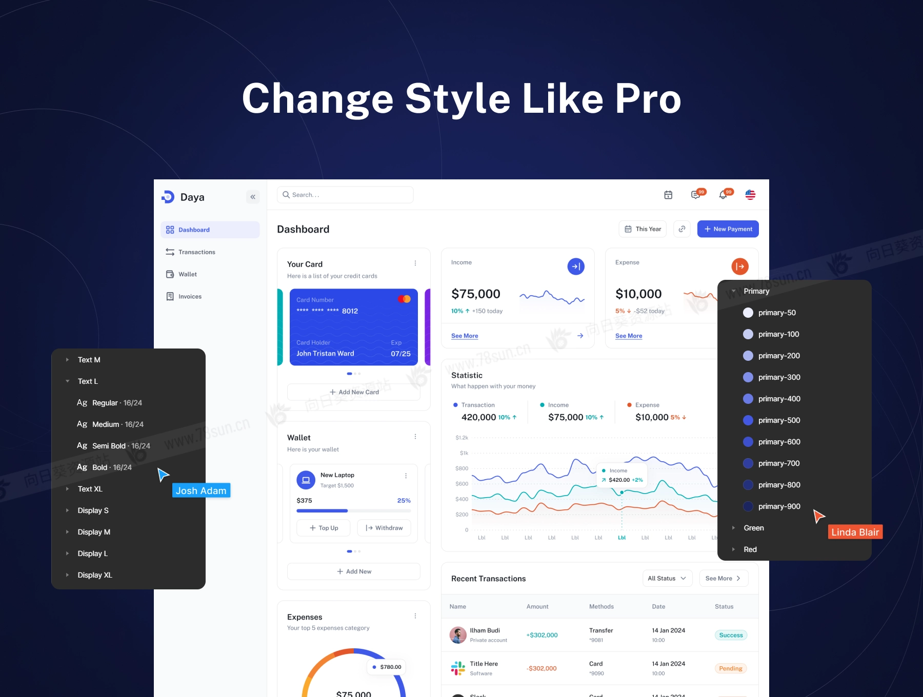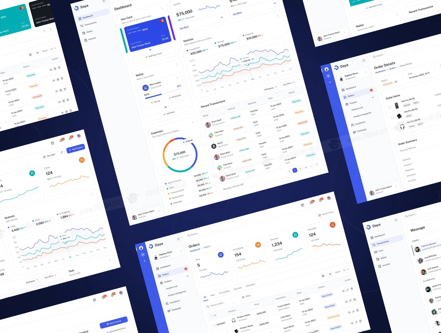 dashboard财务电子商务项目管理网站web ui界面设计fig源文件模板。凭借超过 100+ 个可自定义的屏幕、强大的设计系统和自动布局功能,Daya 可帮助您为金融、电子商务、项目管理等创建视觉上令人惊叹的专业仪表板。