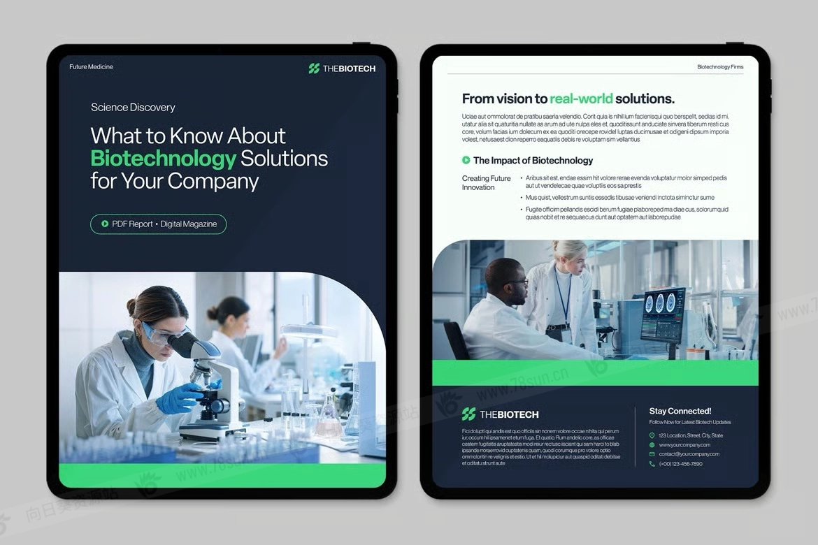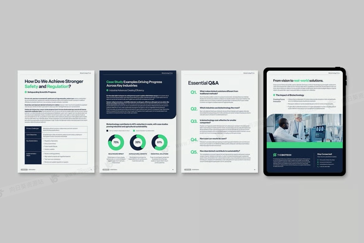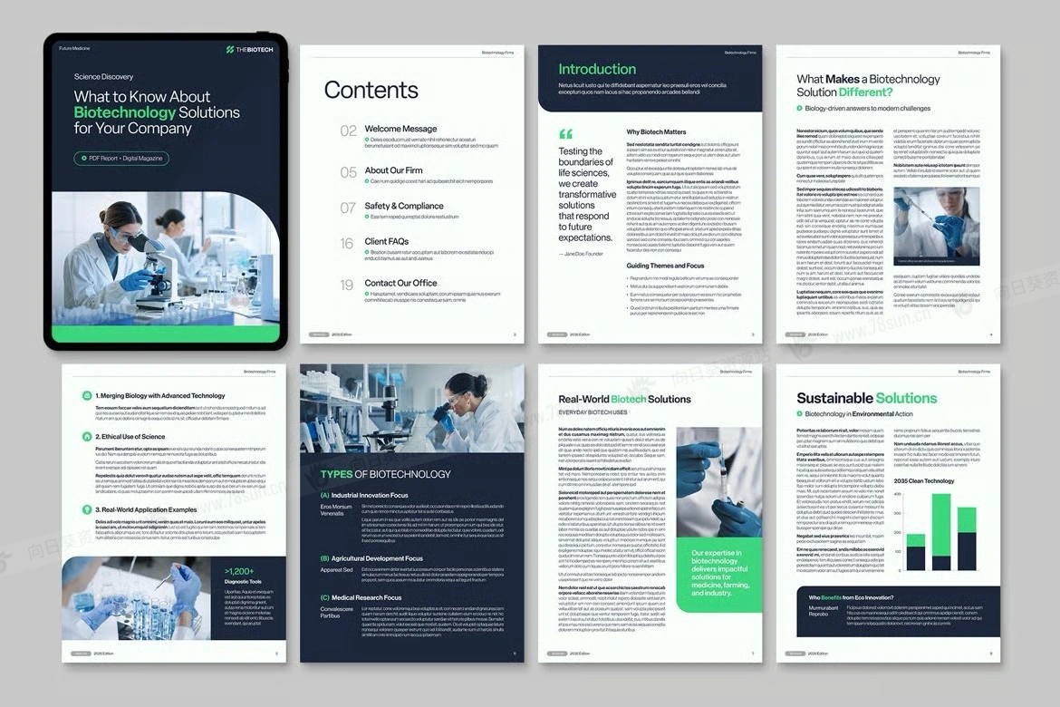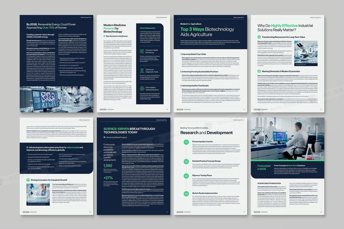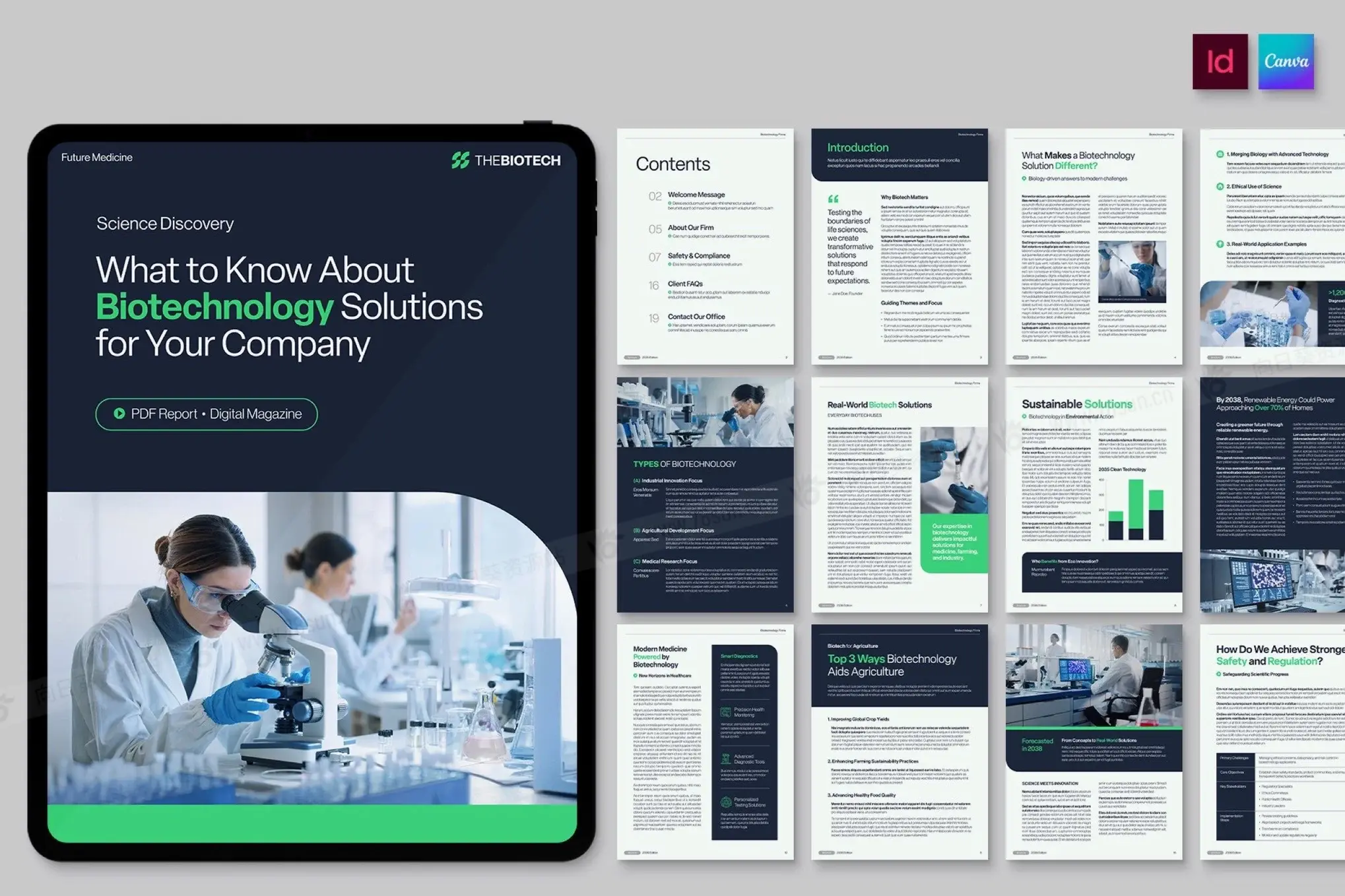 生物科学研究技术电子书数字小册子杂志宣传册画册indd设计模板。它提供 Canva、InDesign IDML 和 INDD 格式,适合生物技术、研究和科学内容的项目。