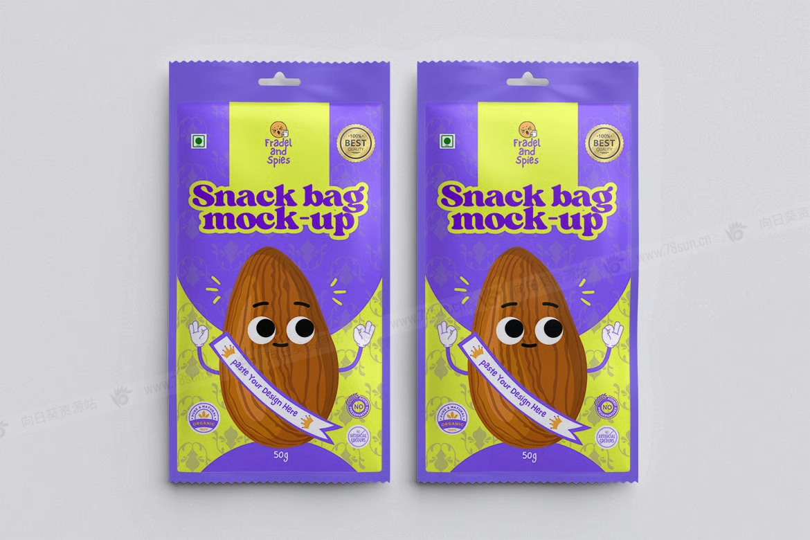 食品零食包装塑料袋品牌VI效果图展示智能贴图psd设计样机。该模型包括 4 个带有分层良好 PSD 文件,并且该模型还使用智能对象功能,这意味着您可以在几秒钟内轻松快速地使用自己的设计更改当前设计。