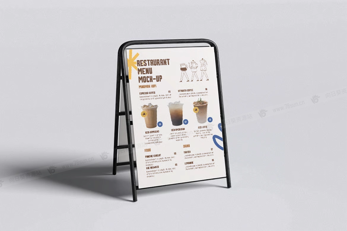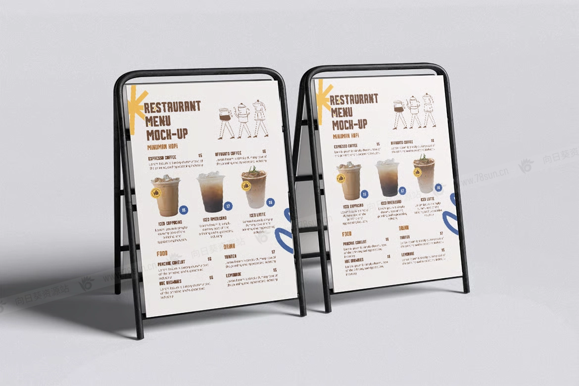 菜单广告海报架品牌VI效果图展示智能贴图psd设计样机。该模型包括 4 个带有分层良好 PSD 文件,并且该模型还使用智能对象功能,这意味着您可以在几秒钟内轻松快速地使用自己的设计更改当前设计。