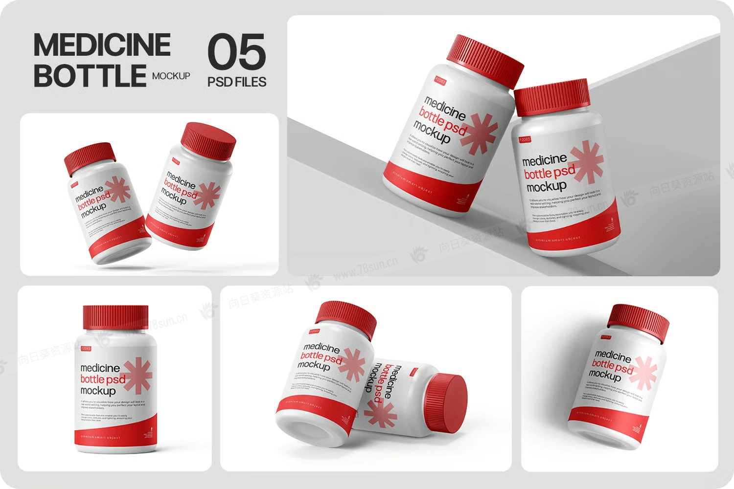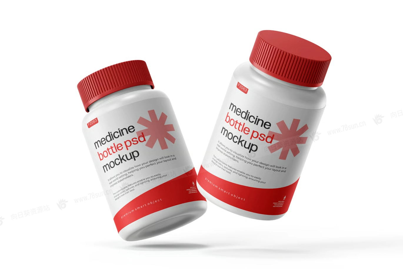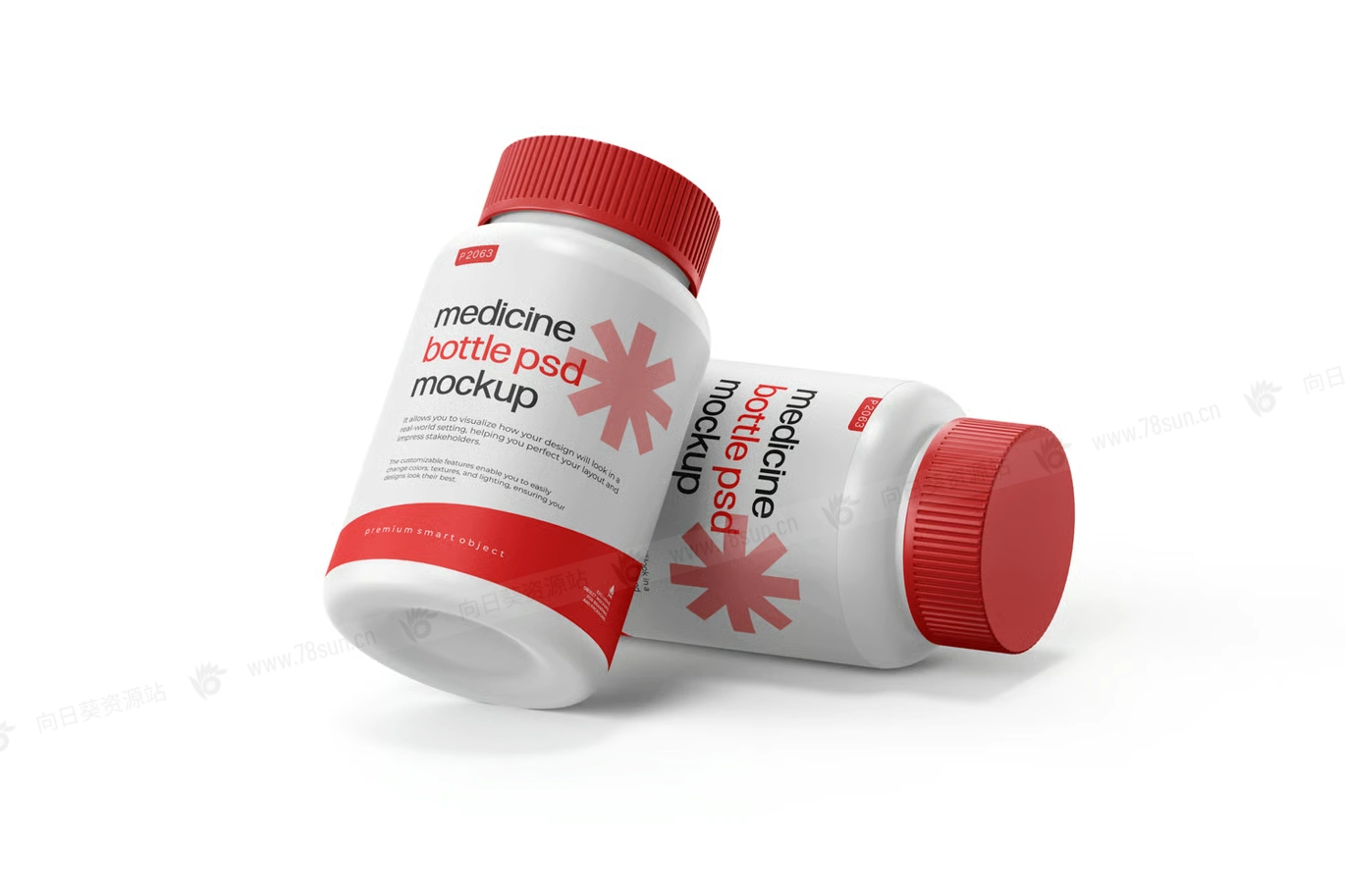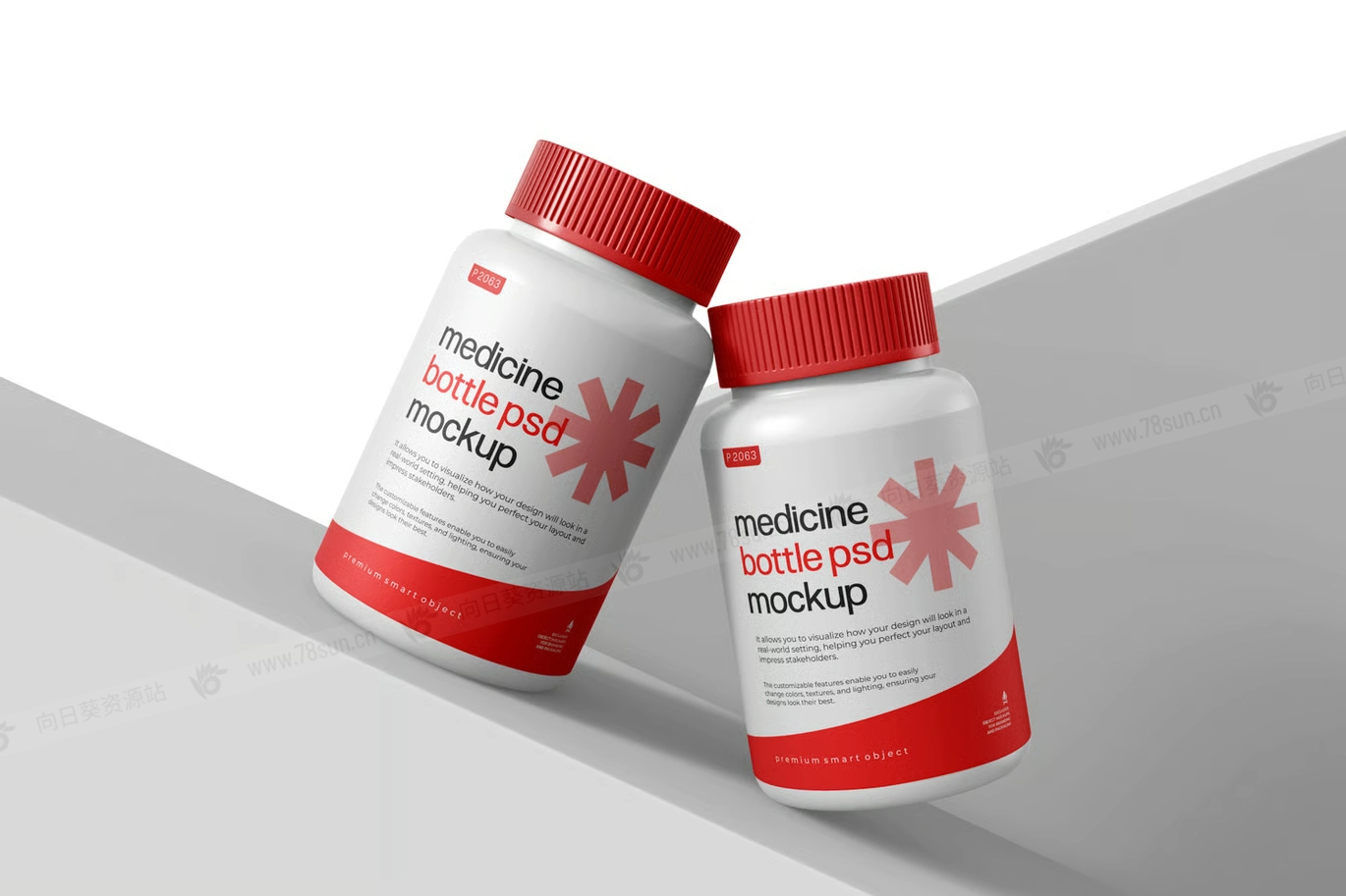 塑料药瓶品牌VI效果图展示智能贴图psd设计样机,具有可定制的塑料瓶,非常适合片剂、胶囊、维生素和护肤补充剂。借助可编辑的智能对象图层,您可以轻松更改标签设计、瓶子颜色、瓶盖样式和背景,以匹配您的品牌标识。