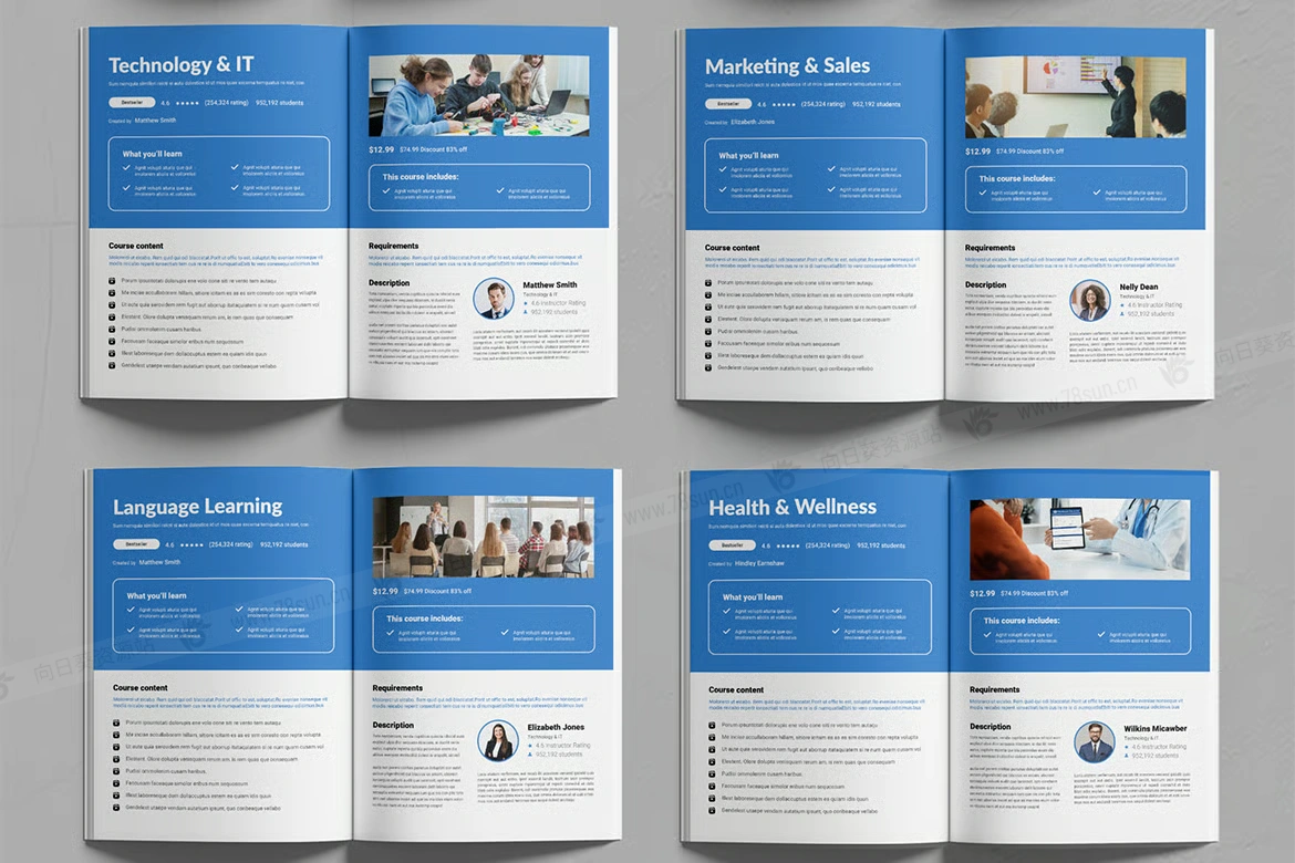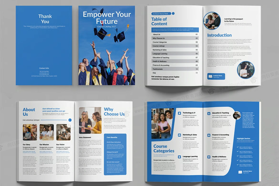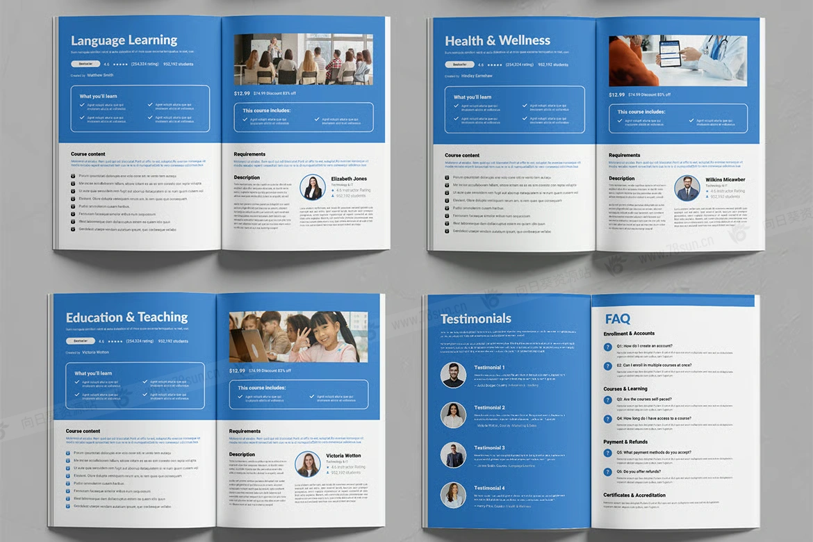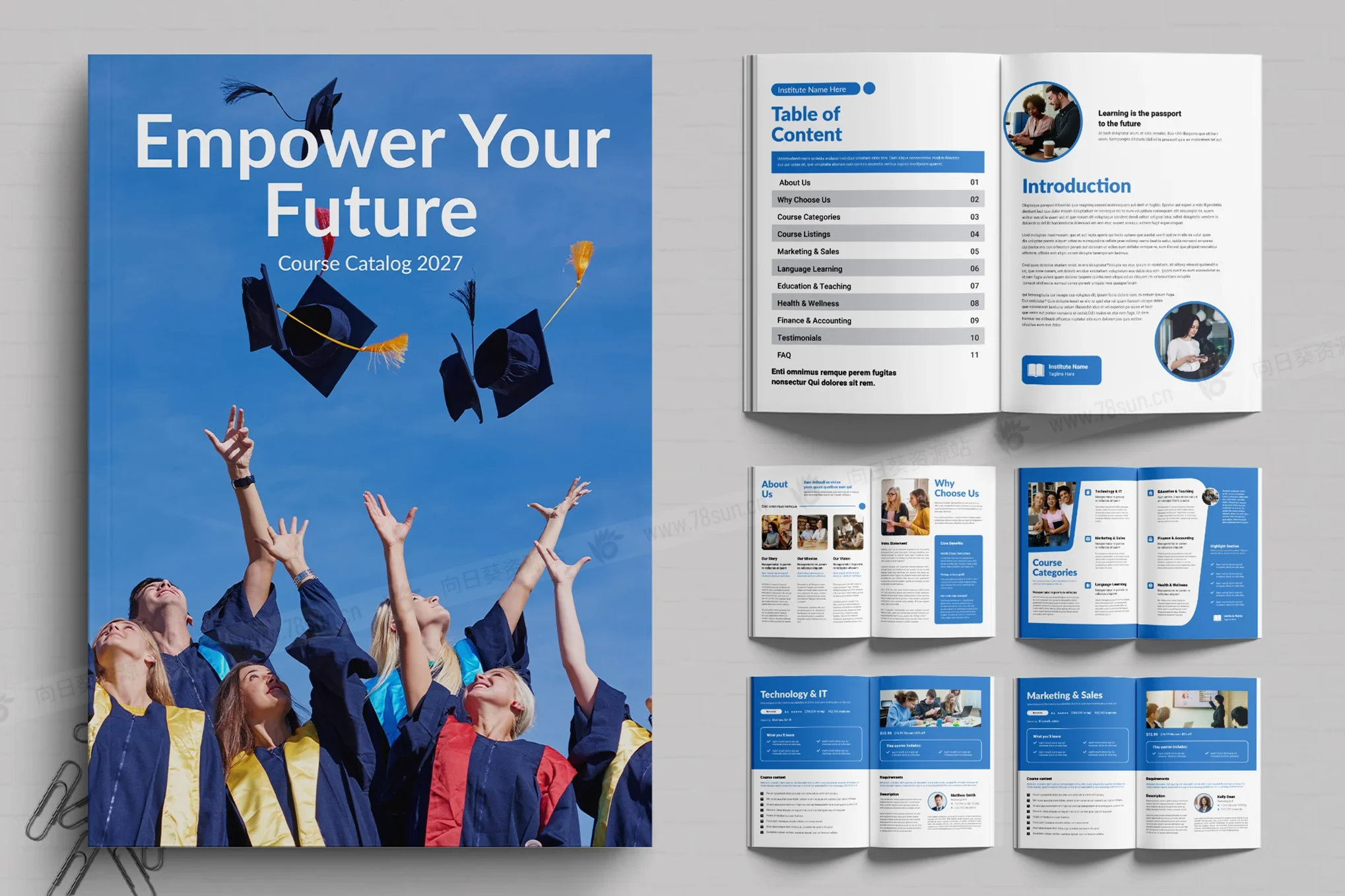 学校培训机构教育计划小册子杂志宣传册画册indd设计模板,用于展示教育计划、课程详细信息、时间表和教师资料。这种设计非常适合大学、学院、培训机构和在线学习平台,确保信息清晰且具有视觉吸引力。