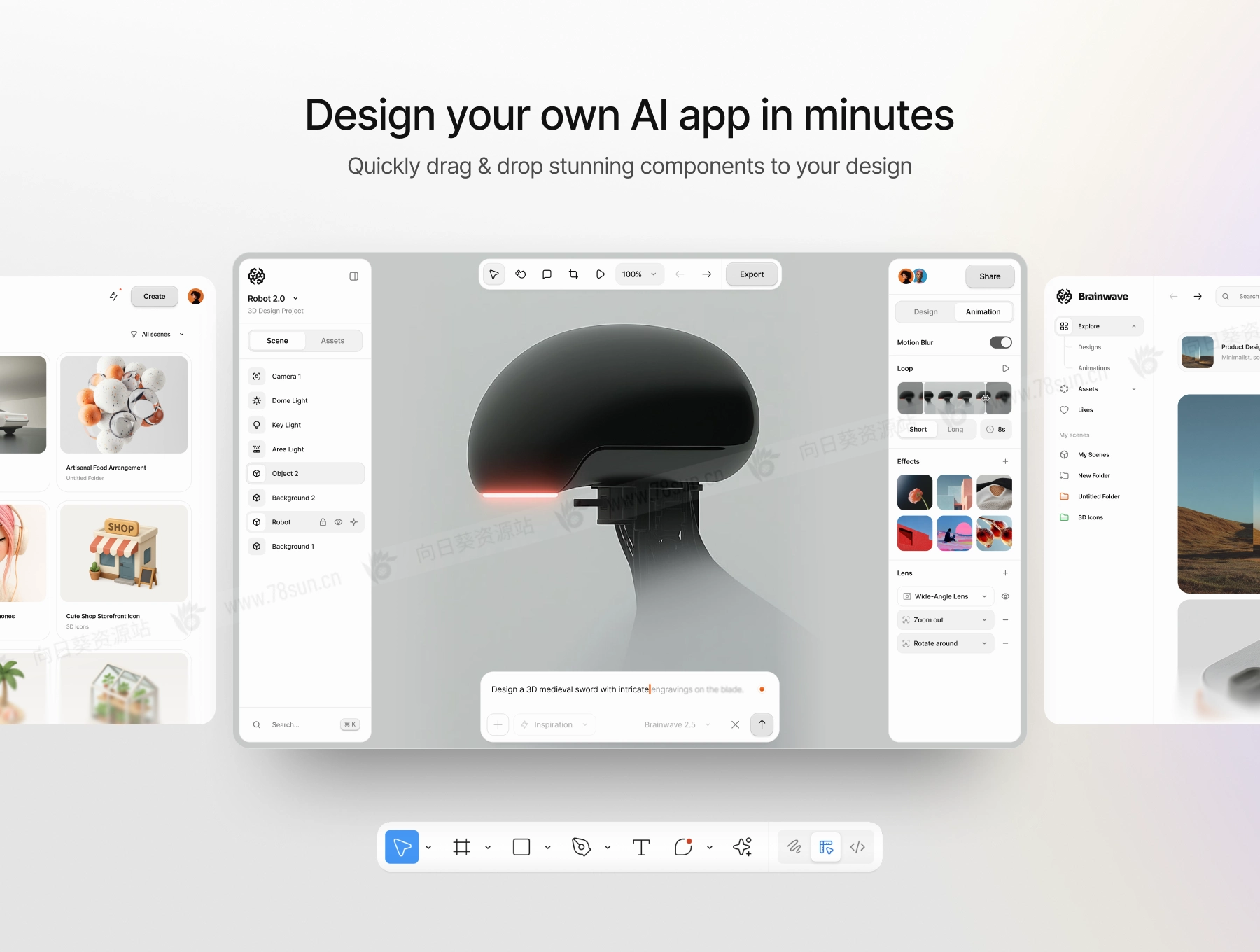 从拖放工作流程到动态场景编辑和 AI 增强工具,Brainwave 2.0 为您提供了将现代 3D 创作平台变为现实所需的一切——视觉和交互方式。