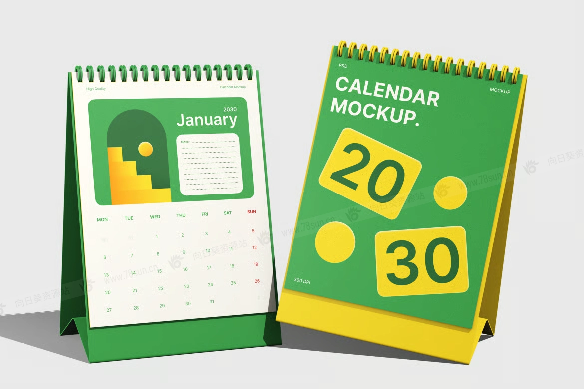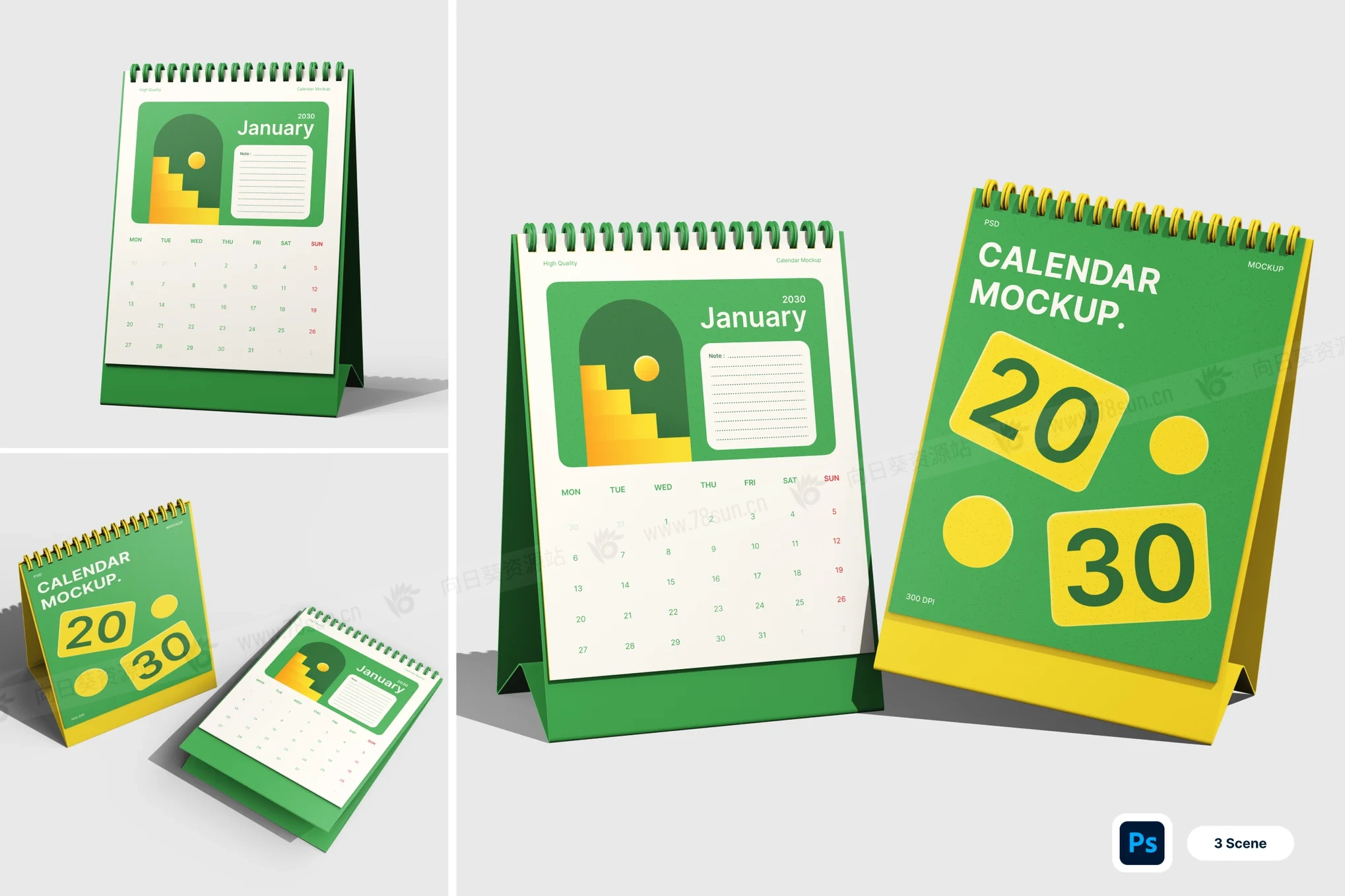 桌面螺旋日历台历品牌VI效果图展示智能贴图psd设计样机。该模型具有三个具有站立和平面视角的高质量场景,非常适合以专业和逼真的方式呈现年度、每月或促销日历布局。该模型非常适合办公室品牌推广、客户演示或营销材料,可通过智能对象在 Photoshop 中完全自定义,以实现快速编辑和精美结果。