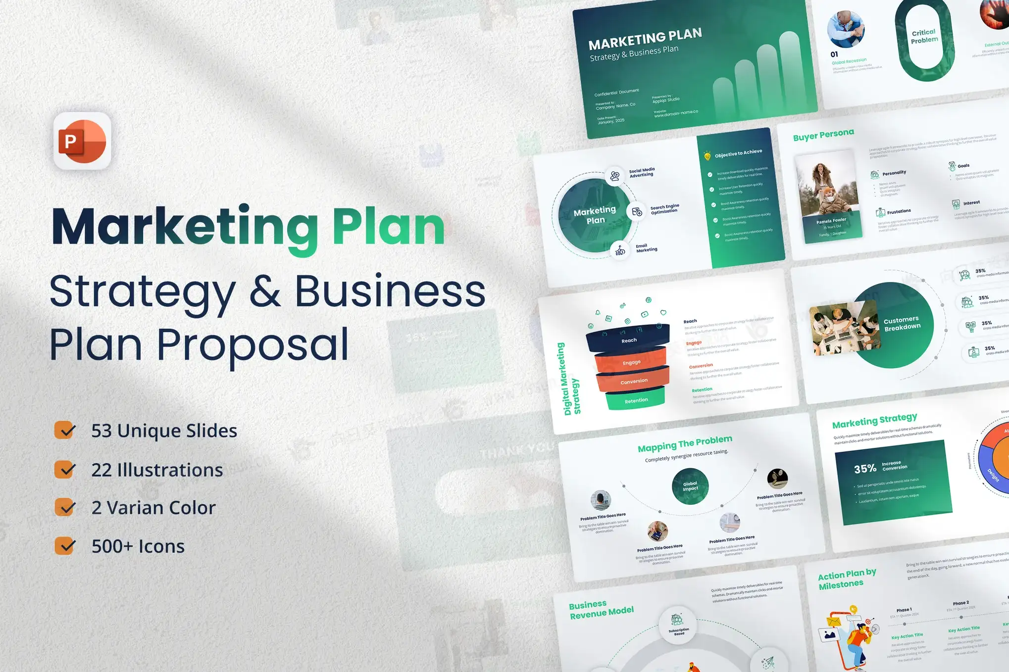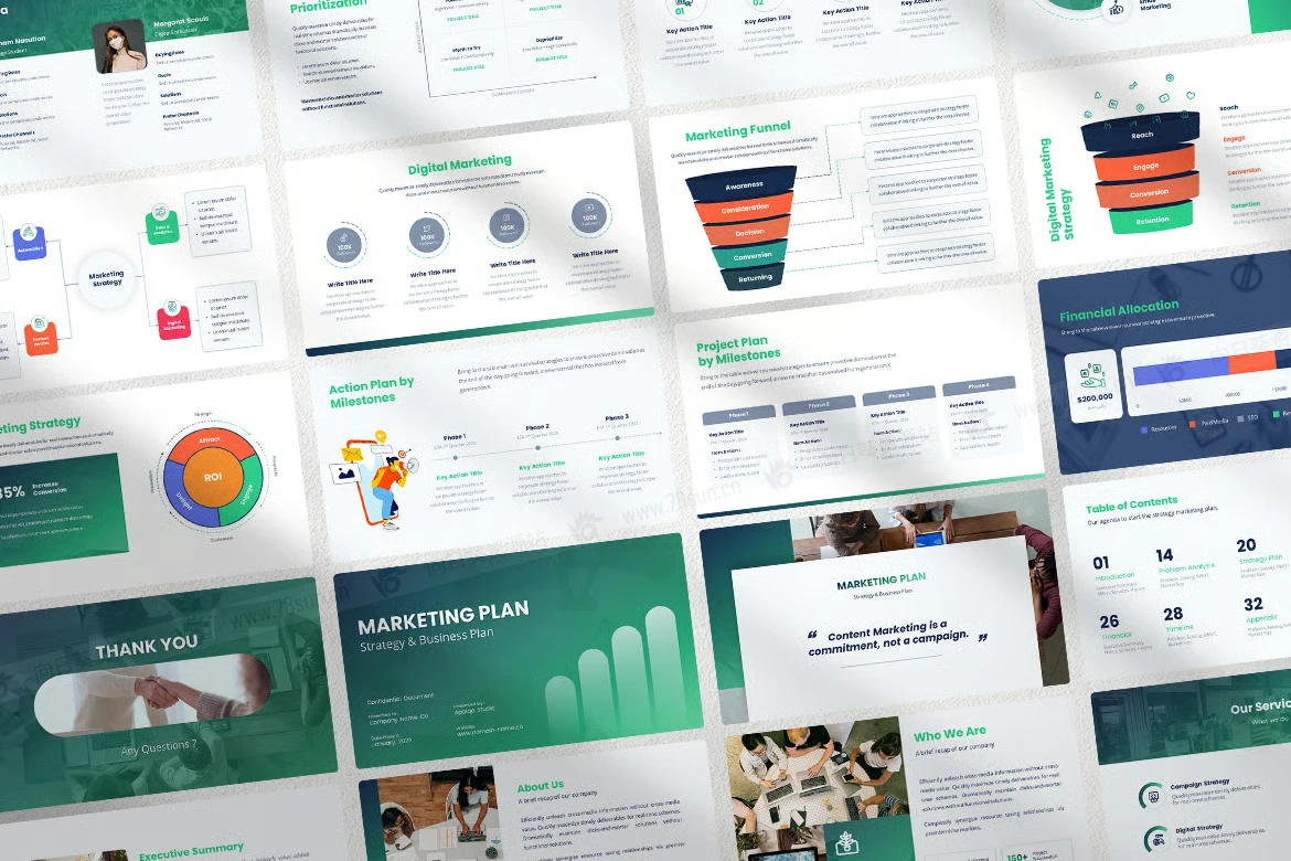 公司简介数字营销商业计划书演示PowerPoint幻灯片模板,此营销计划提案 Powerpoint 模板可用于创建战略和商业提案。 分绿色跟橙色两种颜色