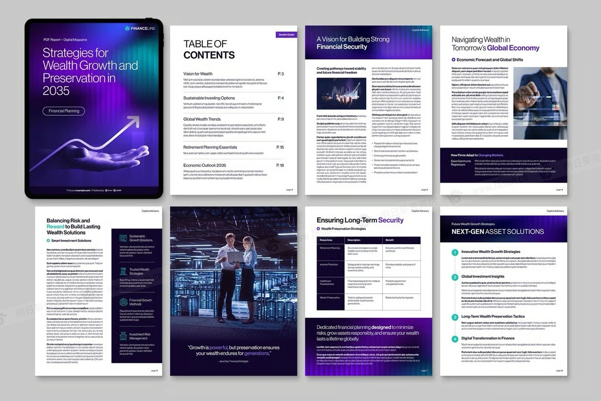 金融未来高科技公司简介电子书数字小册子杂志宣传册画册indd设计模板,该模板提供 Canva 和 InDesign 格式(IDML、INDD)。这个多功能模板非常适合财富管理公司、金融专业人士和技术创新者,支持创建精美的白皮书、富有洞察力的报告、引人入胜的数字杂志和引人注目的案例研究。通过专为无缝 PDF 出版物而设计的令人惊叹的可自定义布局来增强您的演示文稿。非常适合财务顾问、科技行业领导者、财富报告和学术研究人员,