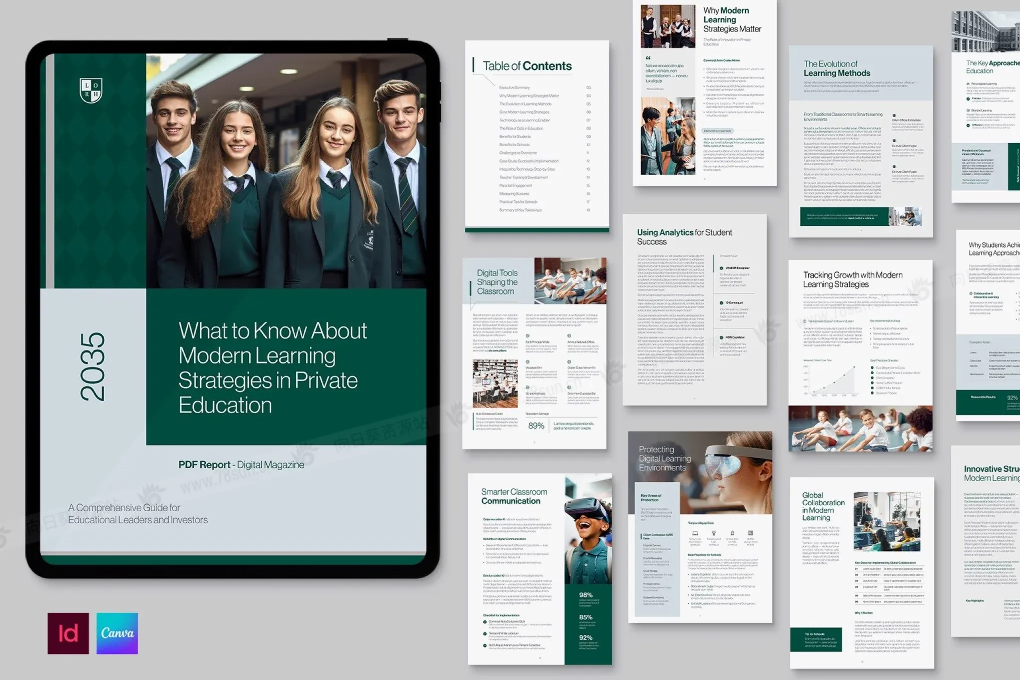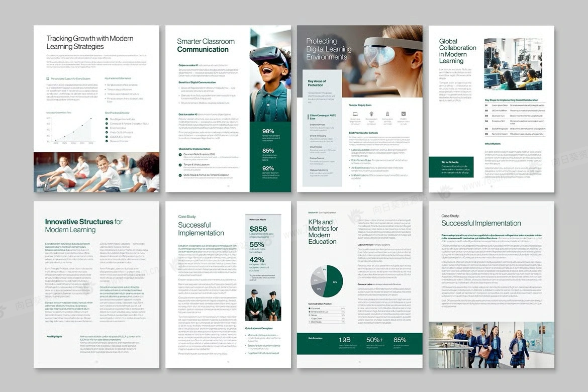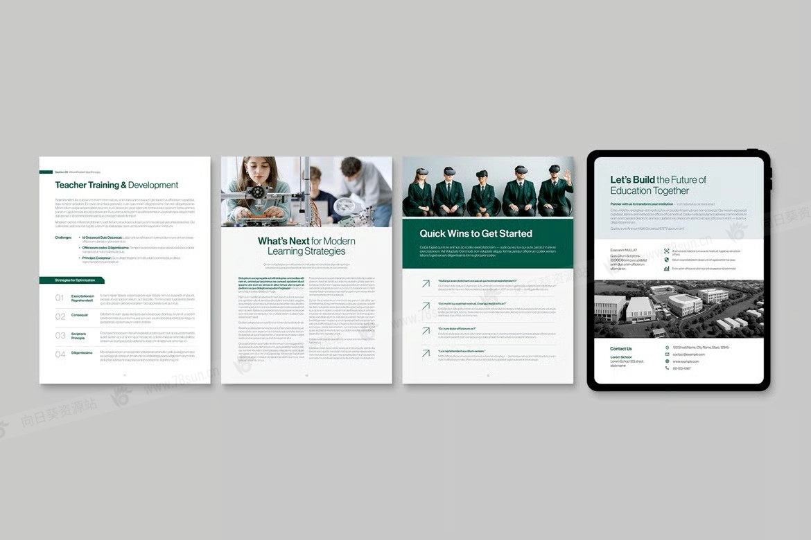 学校大学教育电子书数字小册子杂志宣传册画册indd设计模板。干净的白皮书布局适合招生说明书、教学大纲、课程指南、目录、手册、年度报告、研究案例研究、时事通讯、活动计划、会议或研讨会材料、资助提案、筹款工具包和校友更新。
