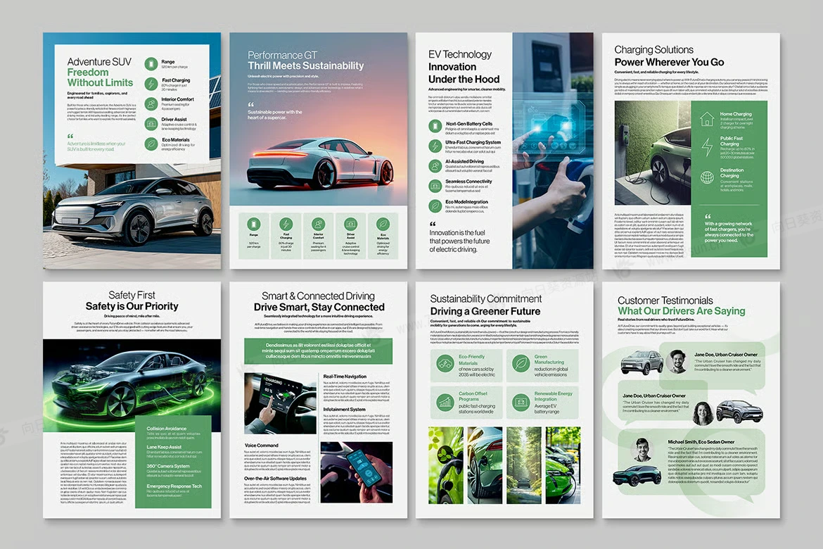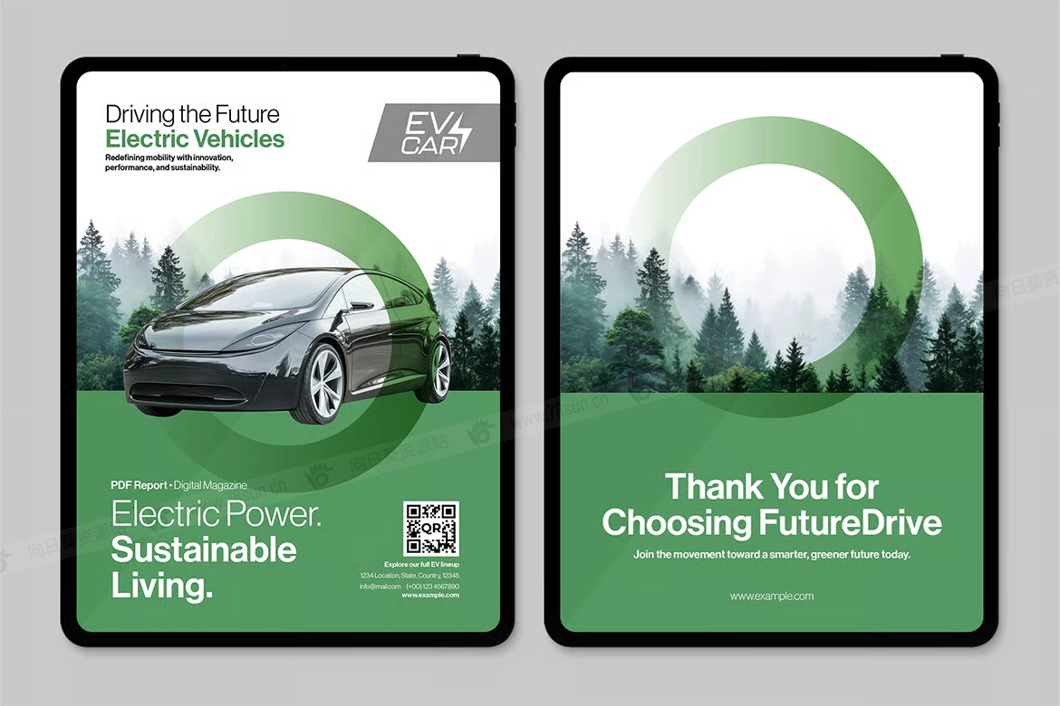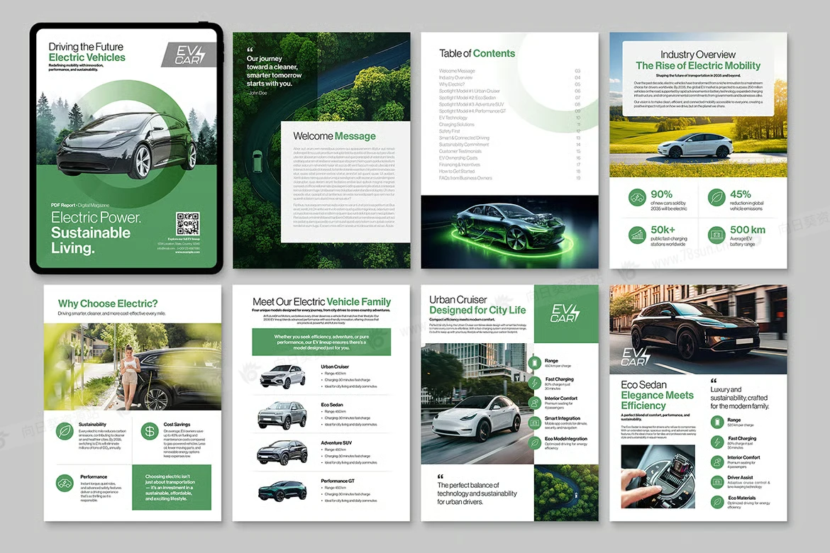 绿色新能源电动汽车电子书数字小册子杂志宣传册画册indd设计模板 — 用于电动汽车、绿色能源和科技故事讲述的干净、现代的布局。它以 Canva、InDesign IDML 和 InDesign INDD 形式提供,非常适合小册子、白皮书、杂志、电子书和 PDF 报告。具有模块化页面、编辑样式和适用于车辆、环境和高程主题的智能排版,以及电动汽车、可再生能源和气候内容。