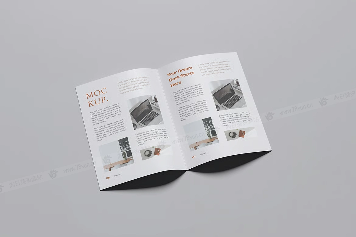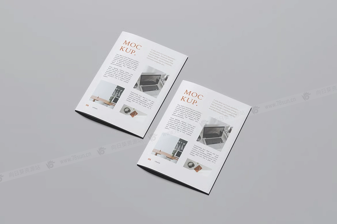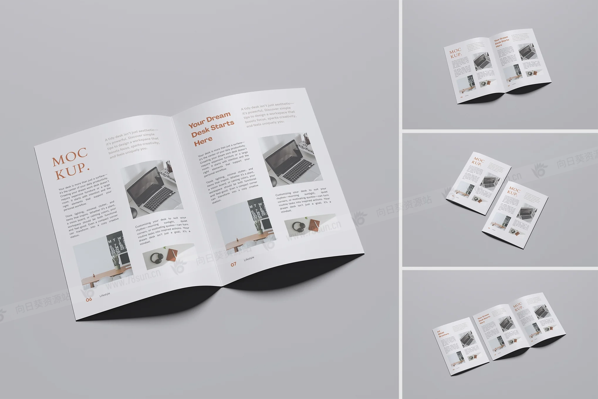 A4双折页宣传册小册子VI效果图展示智能贴图psd设计样机。该模型包括 3 个带有分层良好 PSD 文件,并且该模型还使用智能对象功能,这意味着您可以在几秒钟内轻松快速地使用自己的设计更改当前设计。