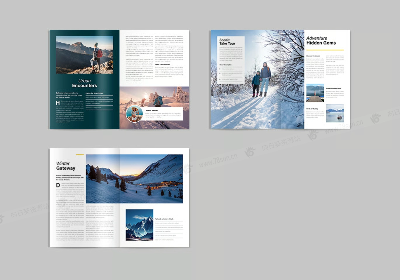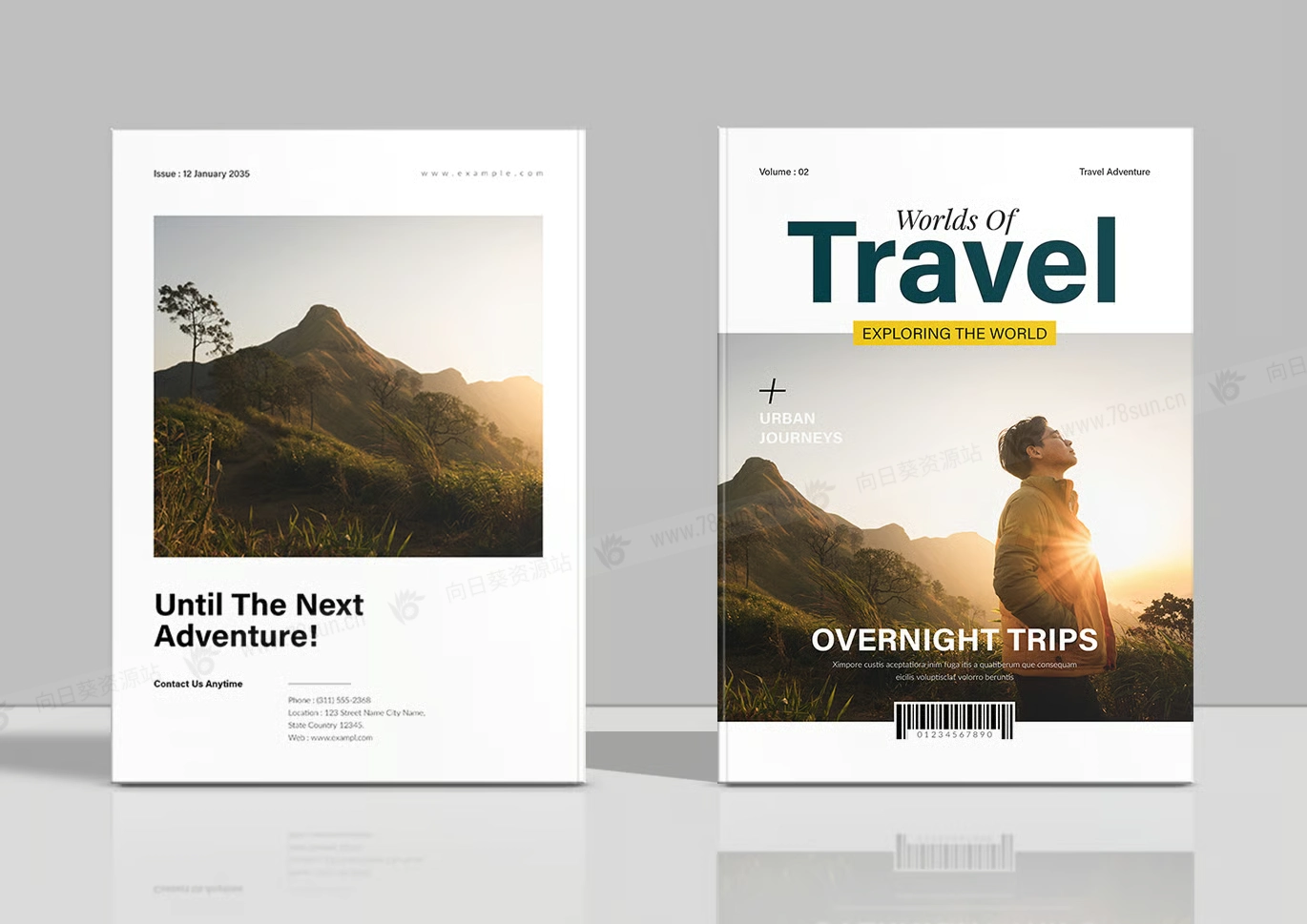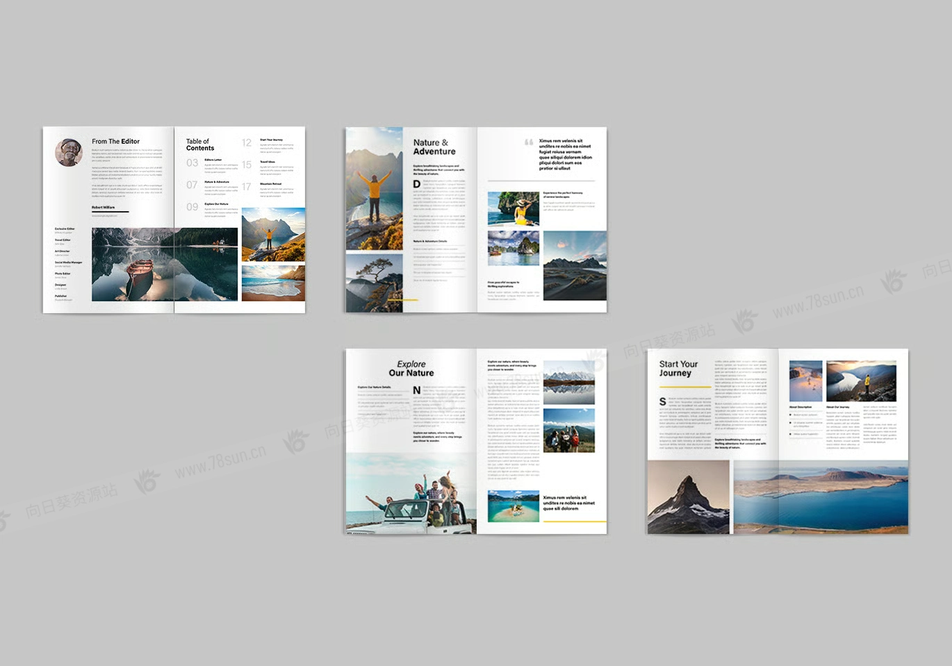 旅游旅行社摄影作品集小册子杂志宣传册画册indd设计模板。这种布局适用于任何项目目的,非常易于使用和定制。自定义它并用您自己的徽标和品牌颜色替换徽标和品牌颜色很容易,