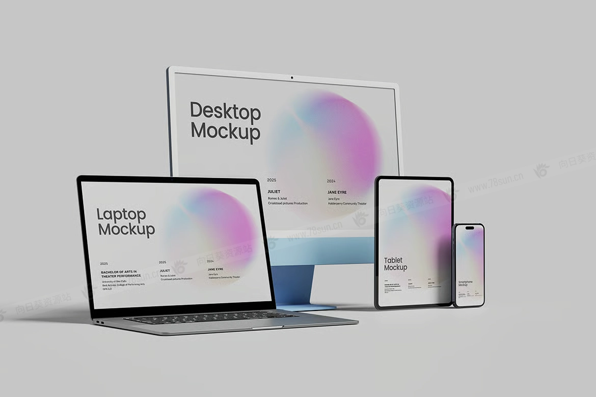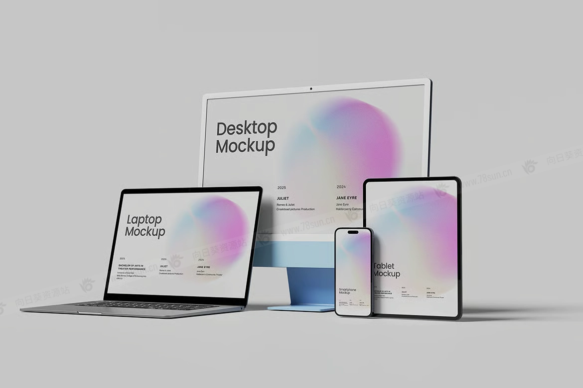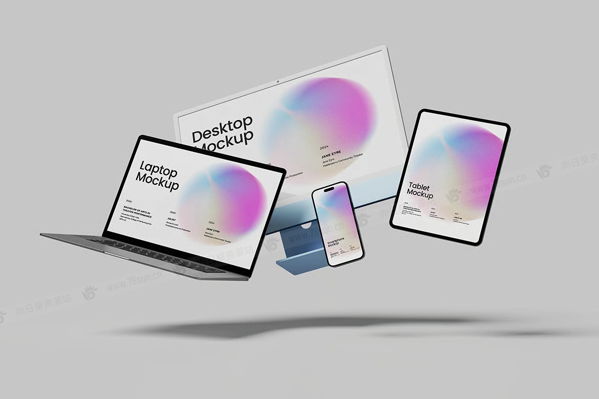 多设备笔记本手机平板电脑UI效果图展示智能贴图psd设计样机。使用智能对象轻松替换您的设计,双击智能图层,复制并粘贴您的图稿,保存即可完成!