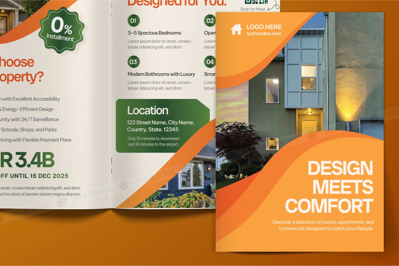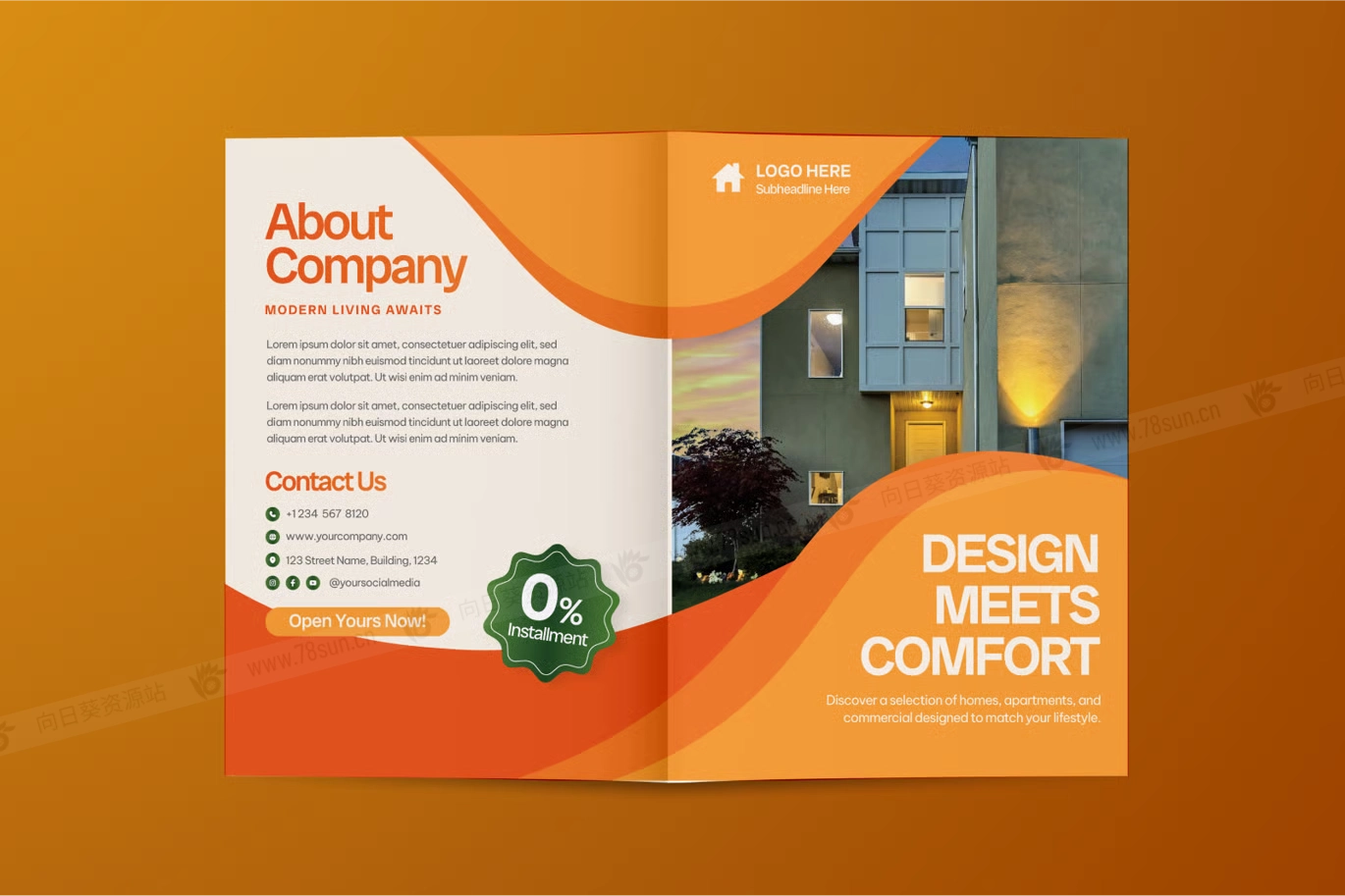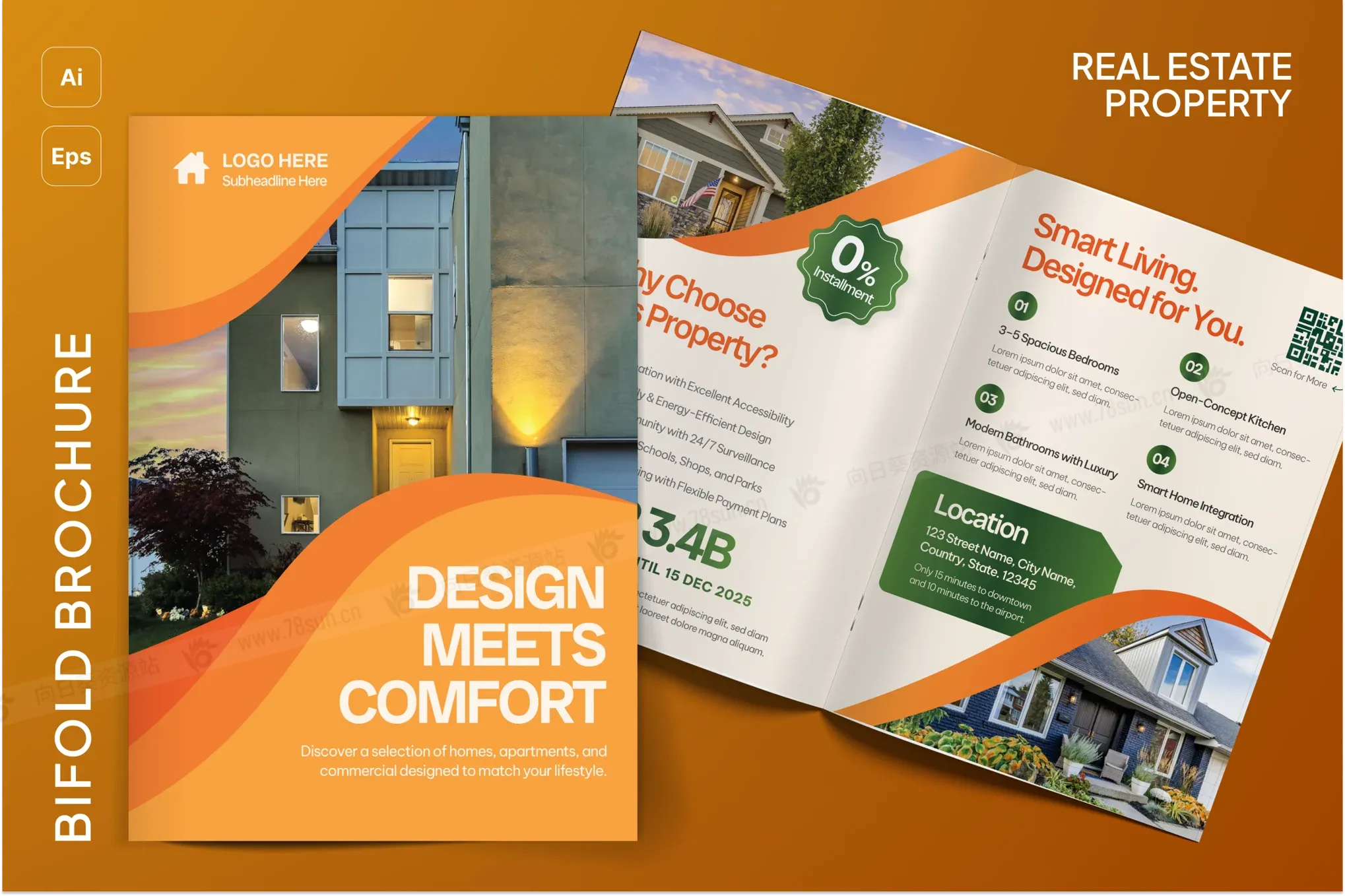 房地产营销公司简介双折页宣传小册子ai设计模板,该模板用途广泛,可用于各种情况,例如房产列表、销售宣传和社区更新。例如,它可用于突出房产的独特功能、展示其豪华设施或强调其黄金地段。