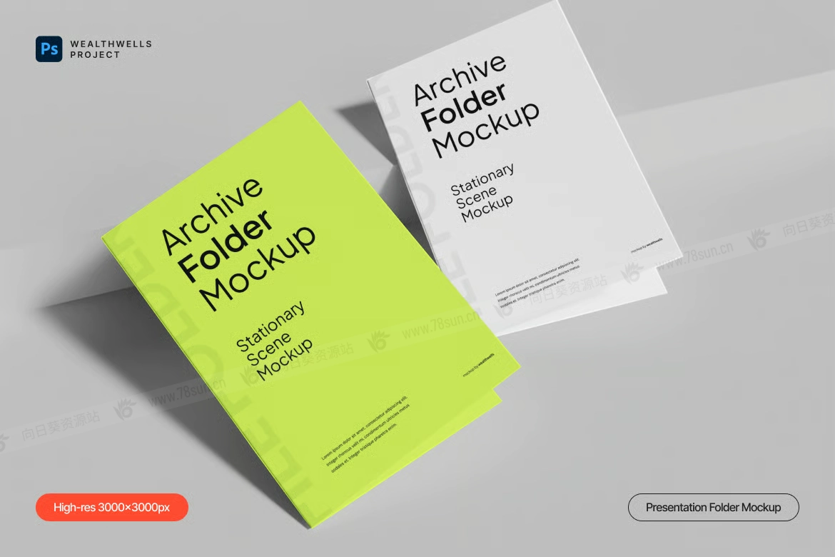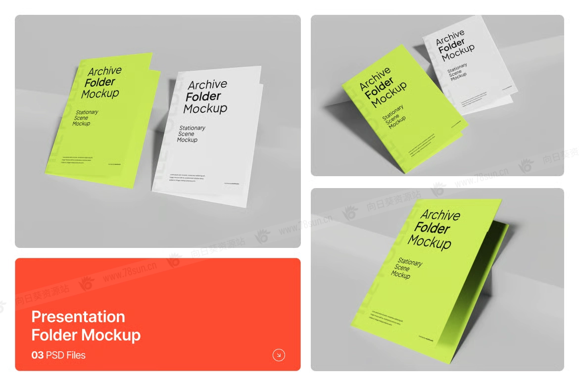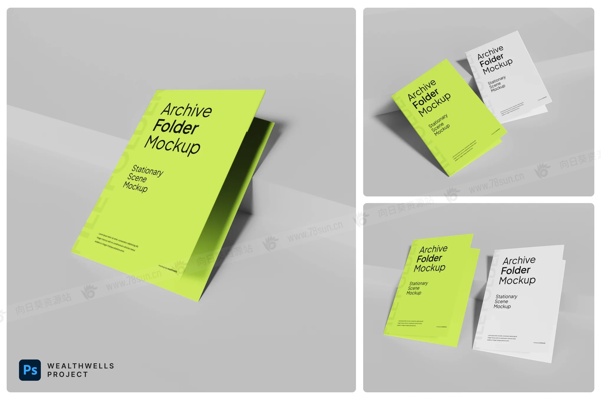 双折页宣传册小册子VI效果图展示智能贴图psd设计样机,在最小的灰色背景上以三个干净的文具布局视角显示。