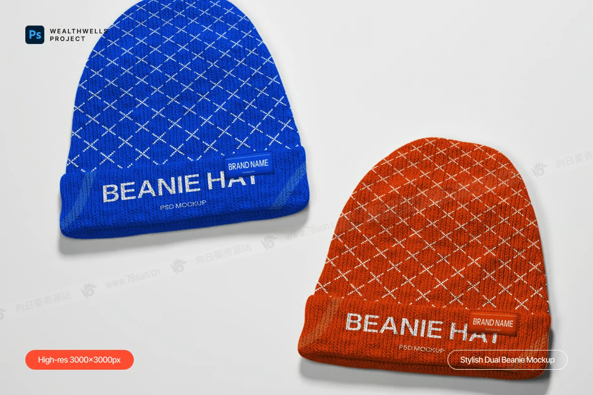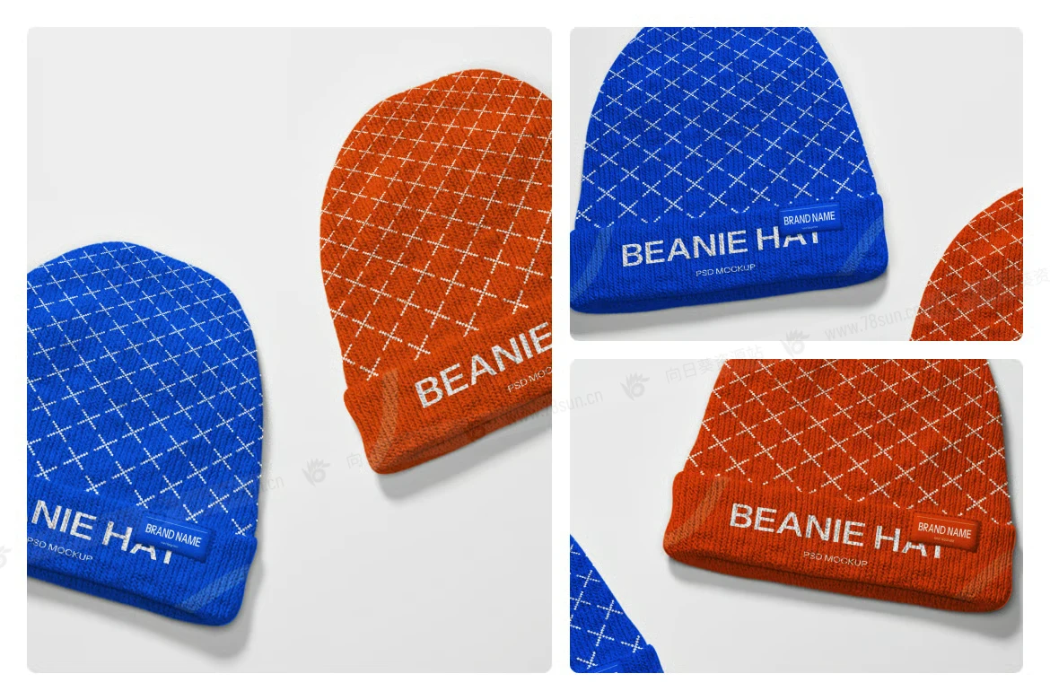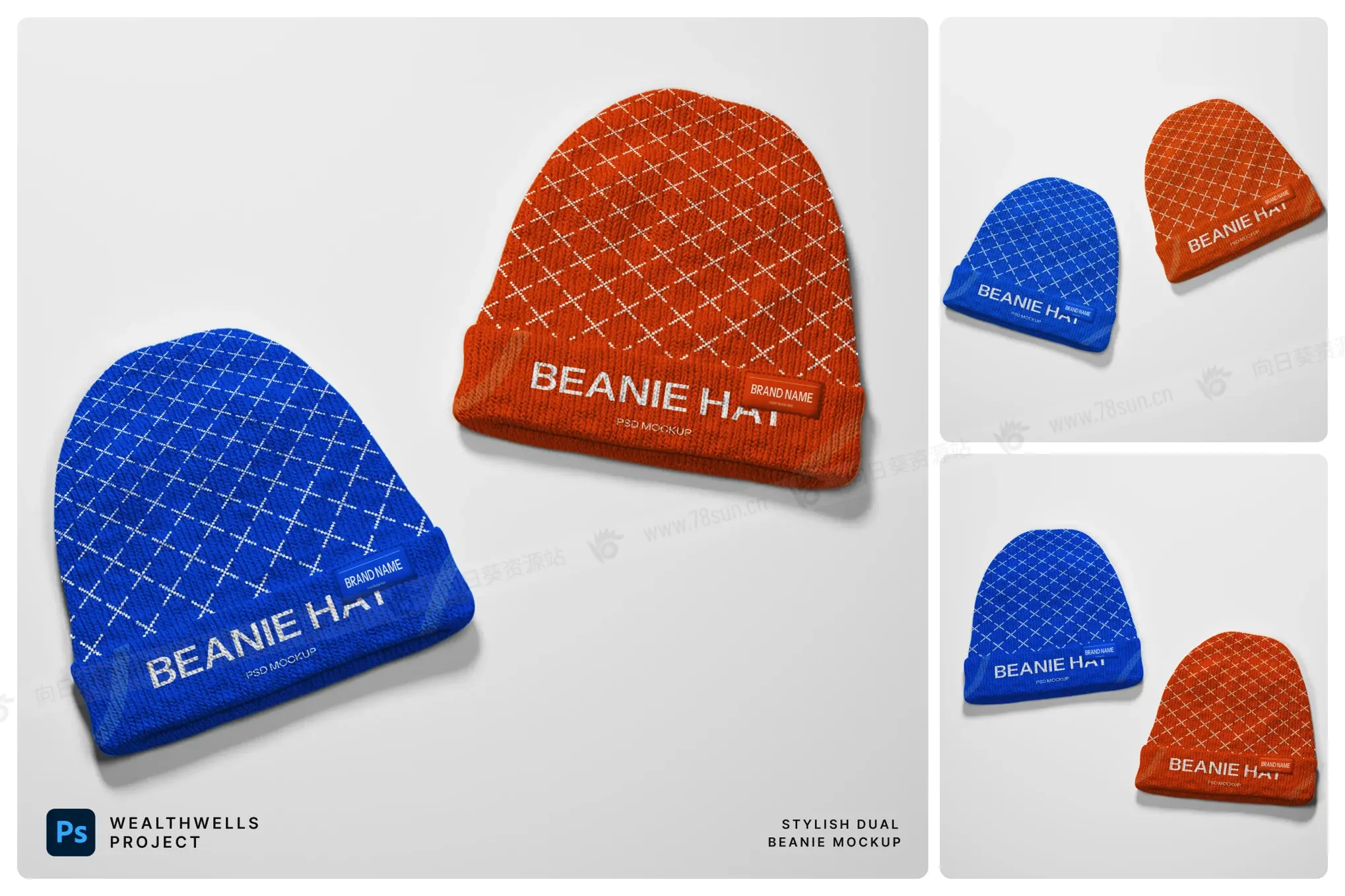 无檐毛线帽子VI效果图展示智能贴图psd设计样机,由 3 种不同风格的时尚双无檐小便帽模型组成,以逼真的外观展示您的模板设计。可以使用智能对象功能轻松快速地替换设计。以 PSD Photoshop 格式提供,具有智能对象功能,可帮助您在几秒钟内将当前设计替换为您自己的设计。