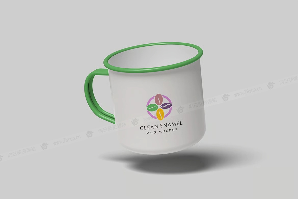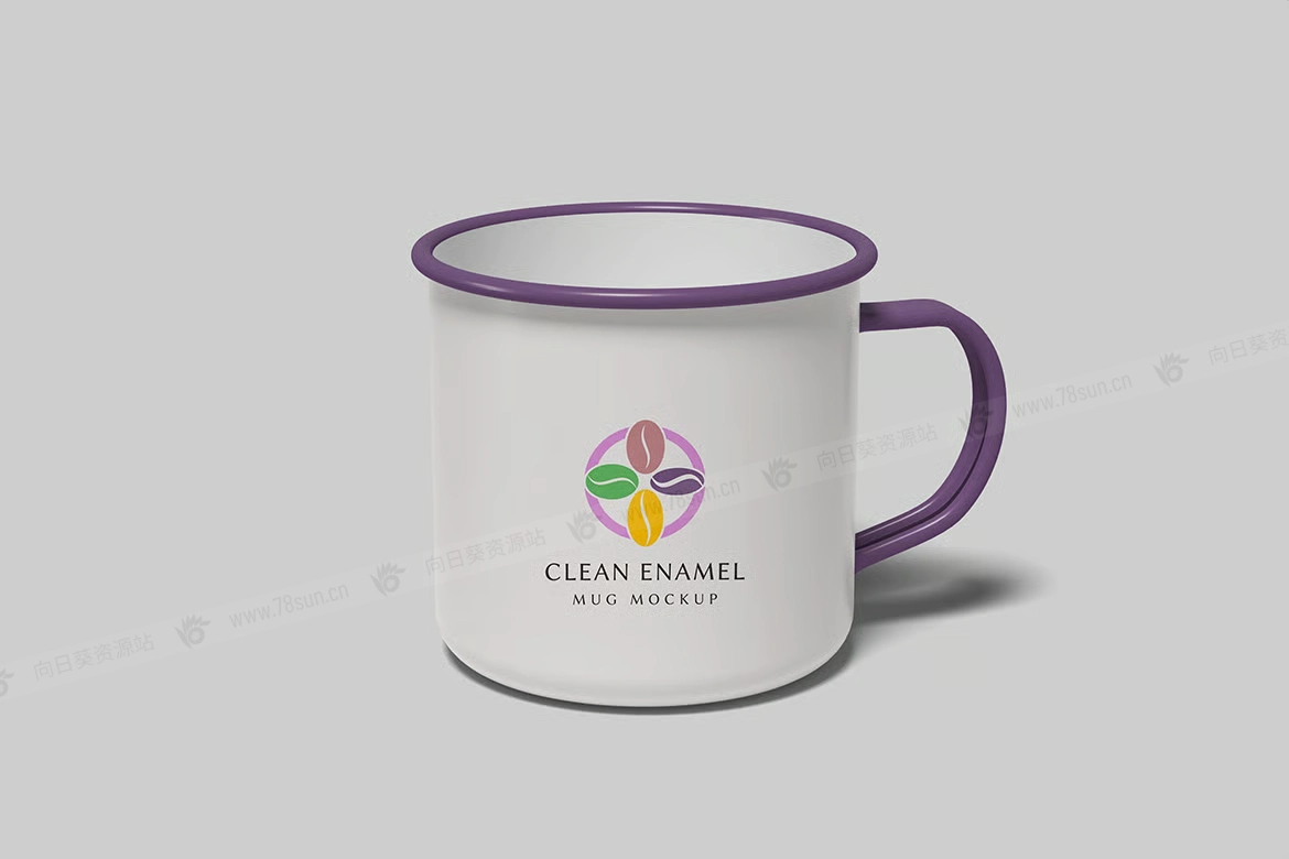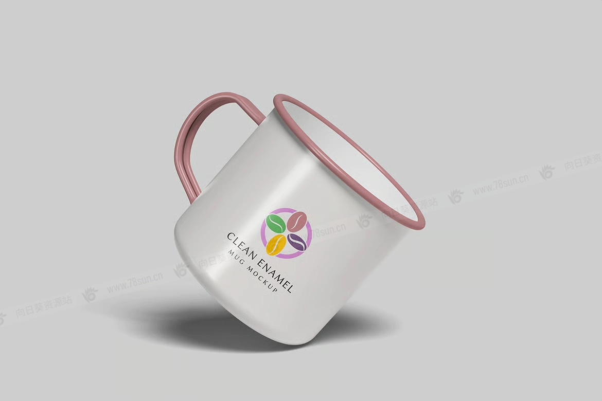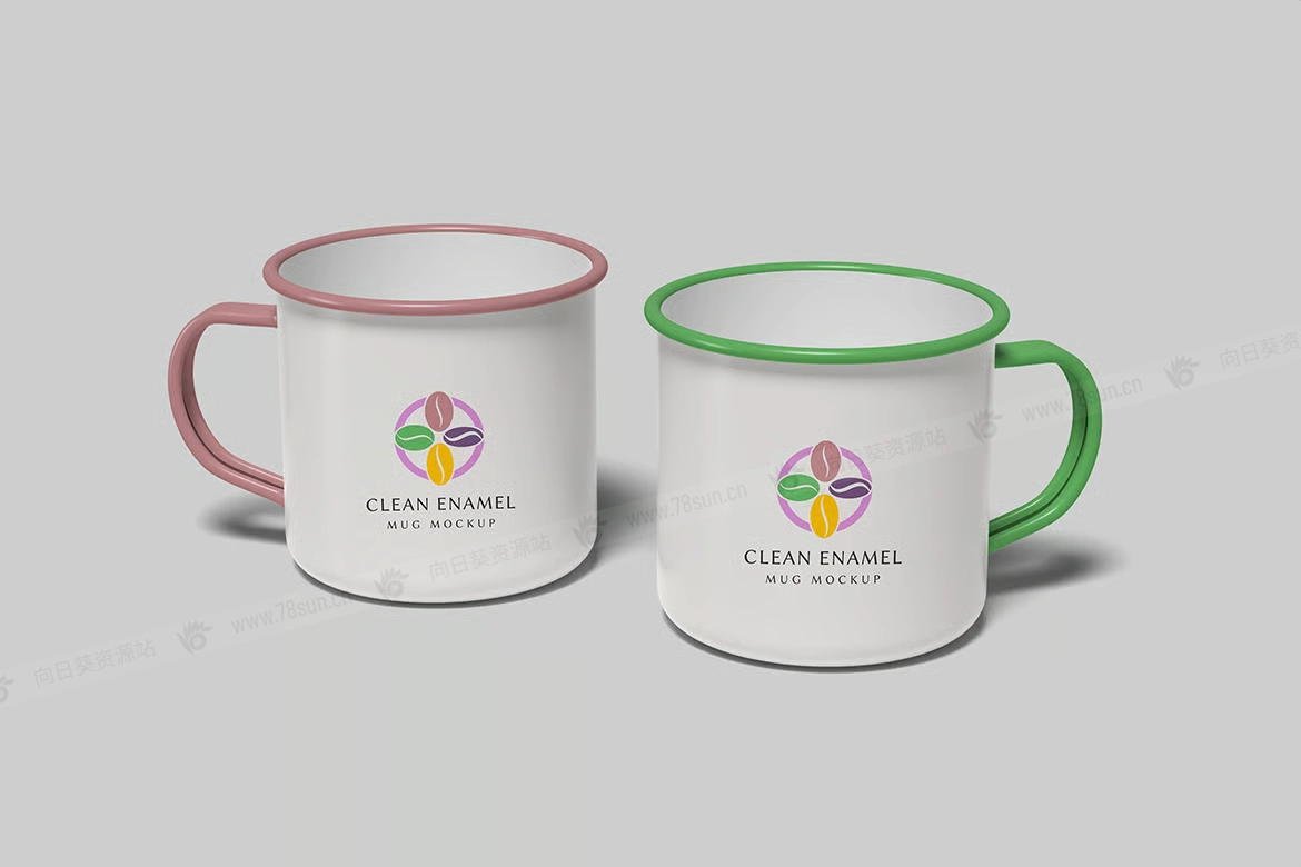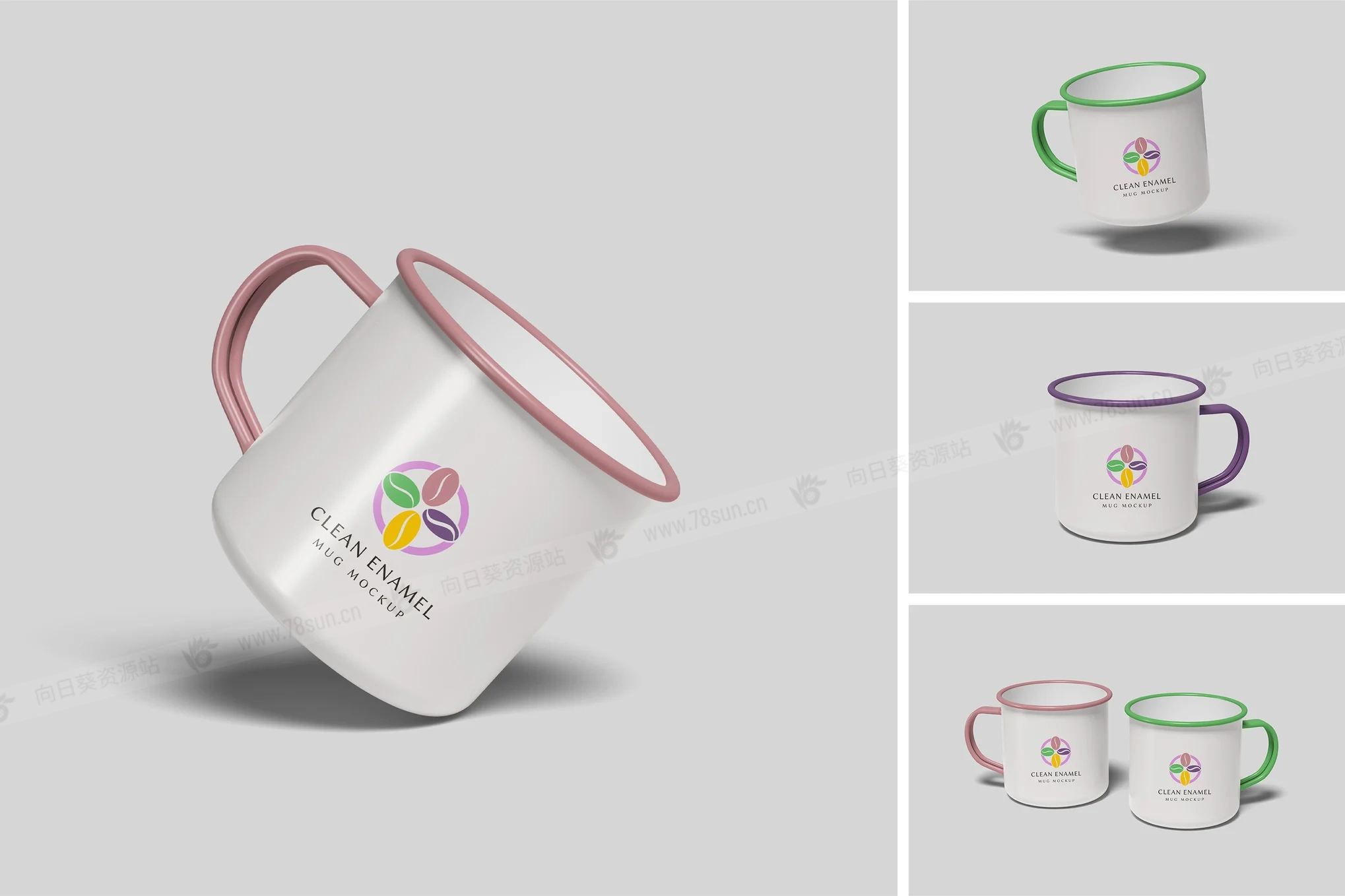 搪瓷马克杯品牌VI效果图展示智能贴图psd设计样机,该模型包括 04 个带有分层良好 PSD 文件,并且该模型还使用智能对象功能,这意味着您可以在几秒钟内轻松快速地使用自己的设计更改当前设计。