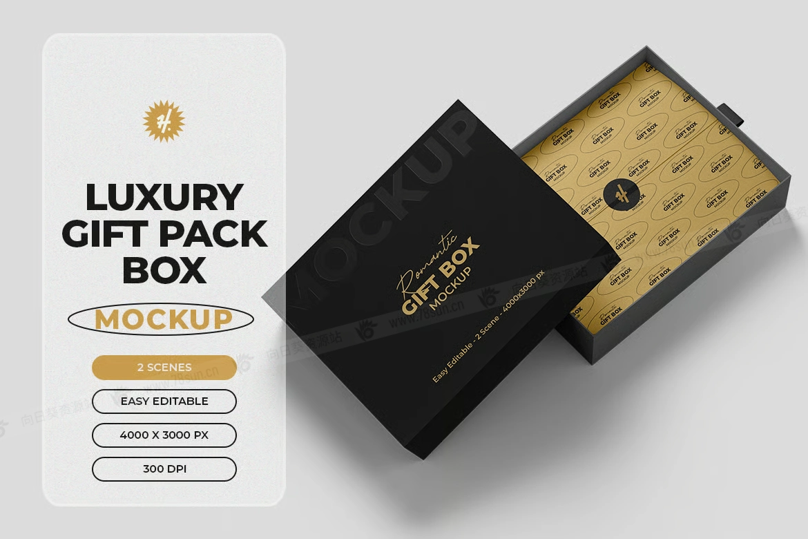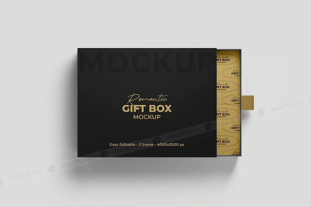 滑盒滑动抽屉礼品纸盒子品牌VI效果图展示智能贴图psd设计样机,该模型具有 2 个可自定义的高分辨率场景。它具有 4000×3000 像素的尺寸和 300 DPI 的质量,